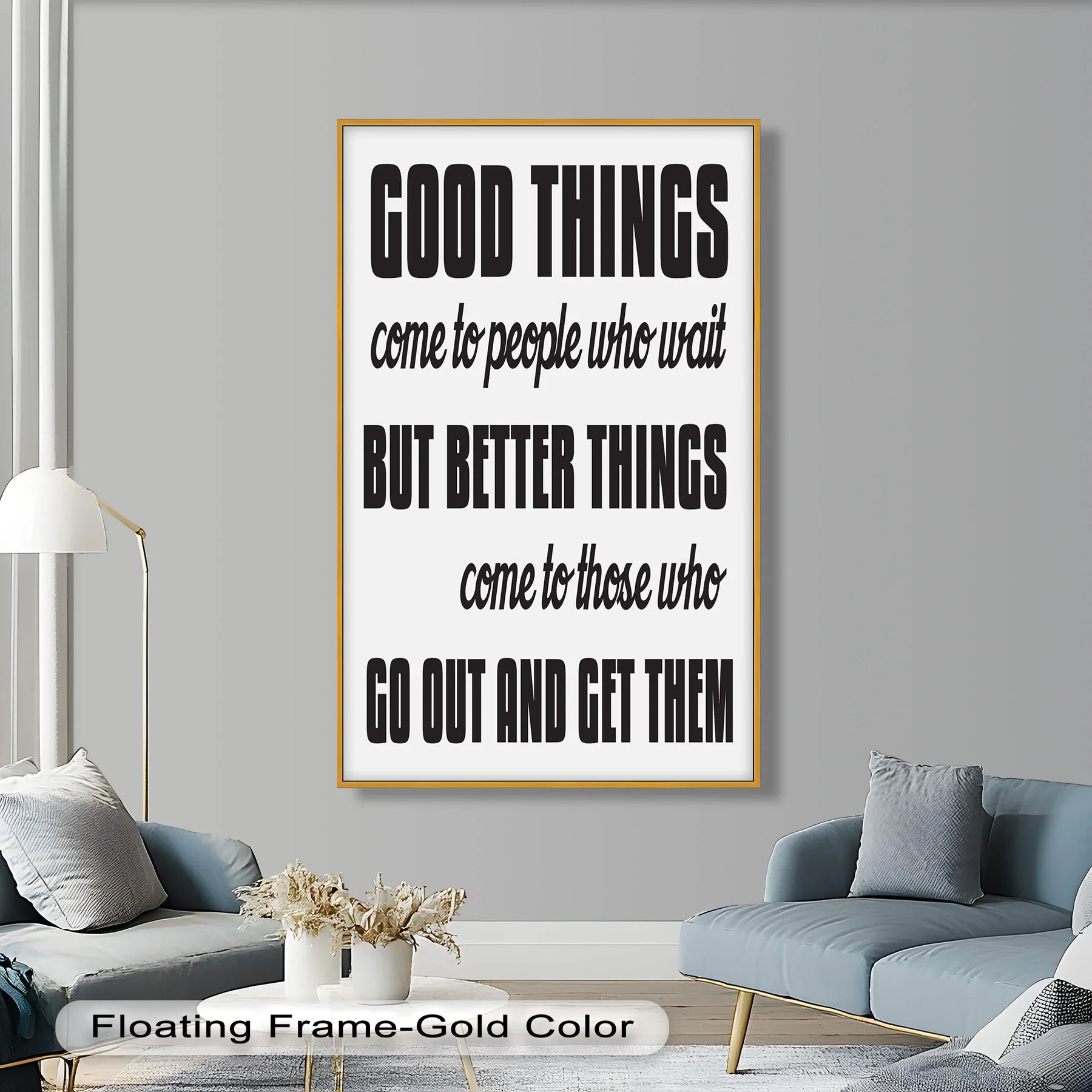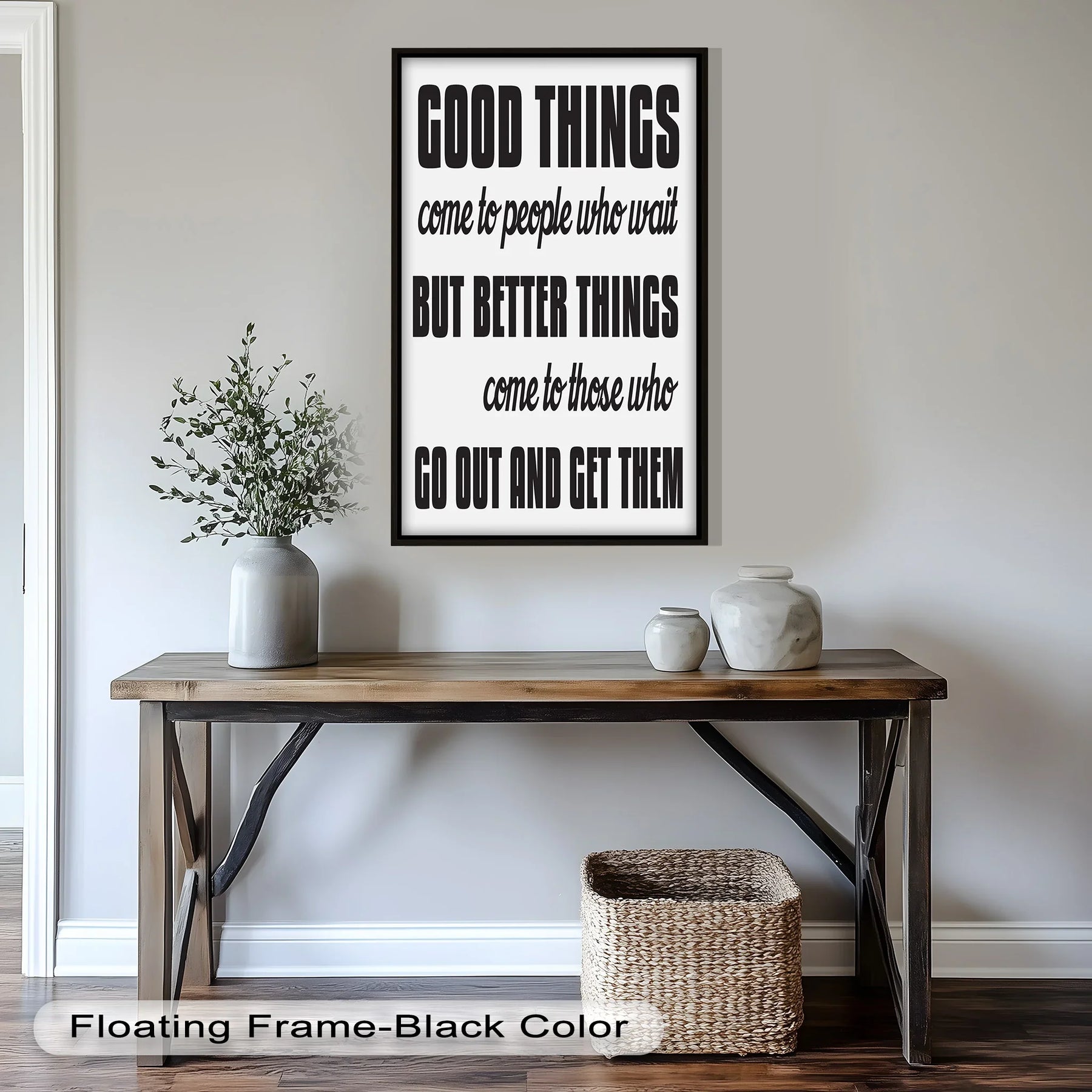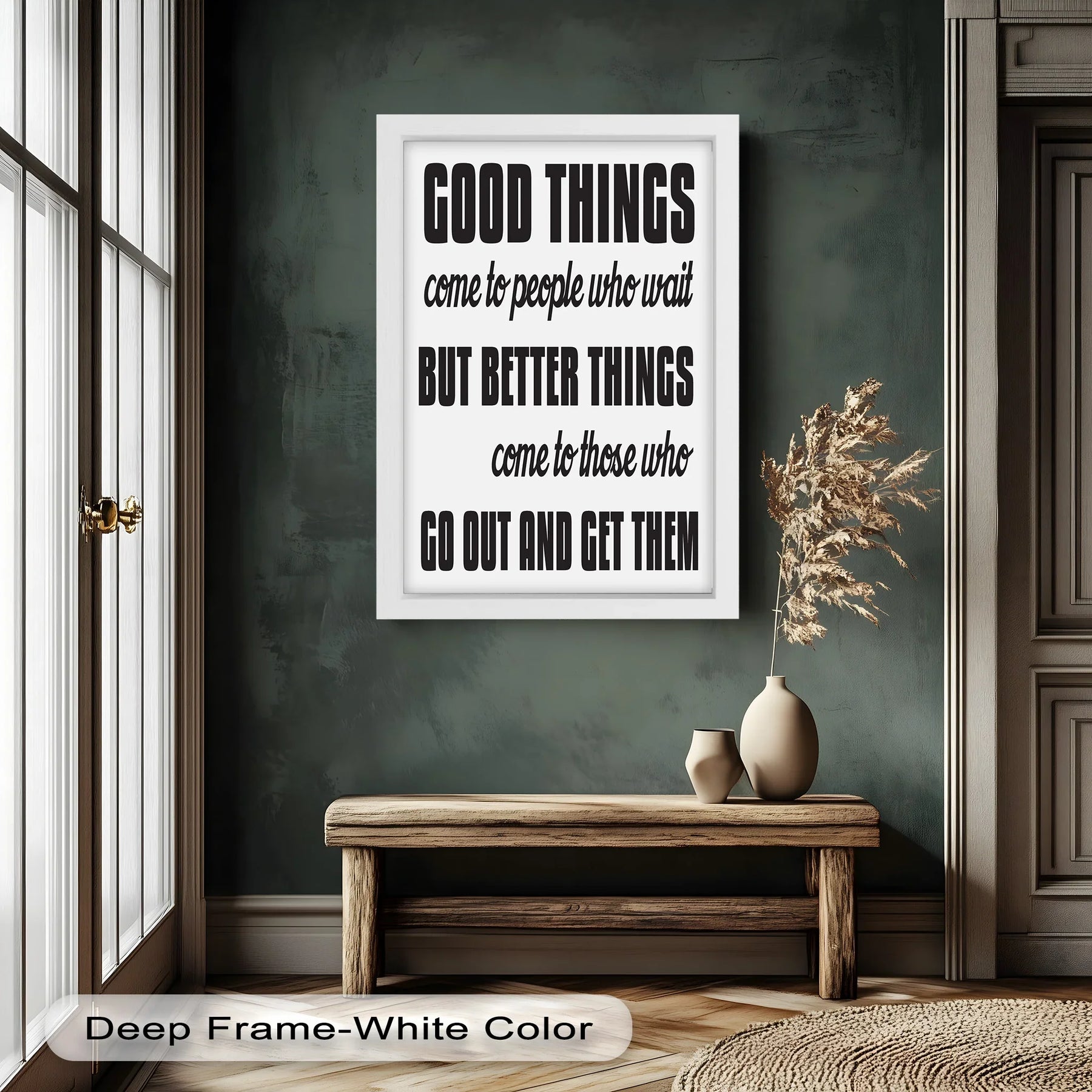 Fuel ambition and drive with this bold quote piece: Good Things Come to People Who Wait, But Better Things Come to Those Who Go Out and Get Them. Designed to inspire action and courage, this motivational wall art is ideal for home offices, gyms, classrooms, or creative studios.