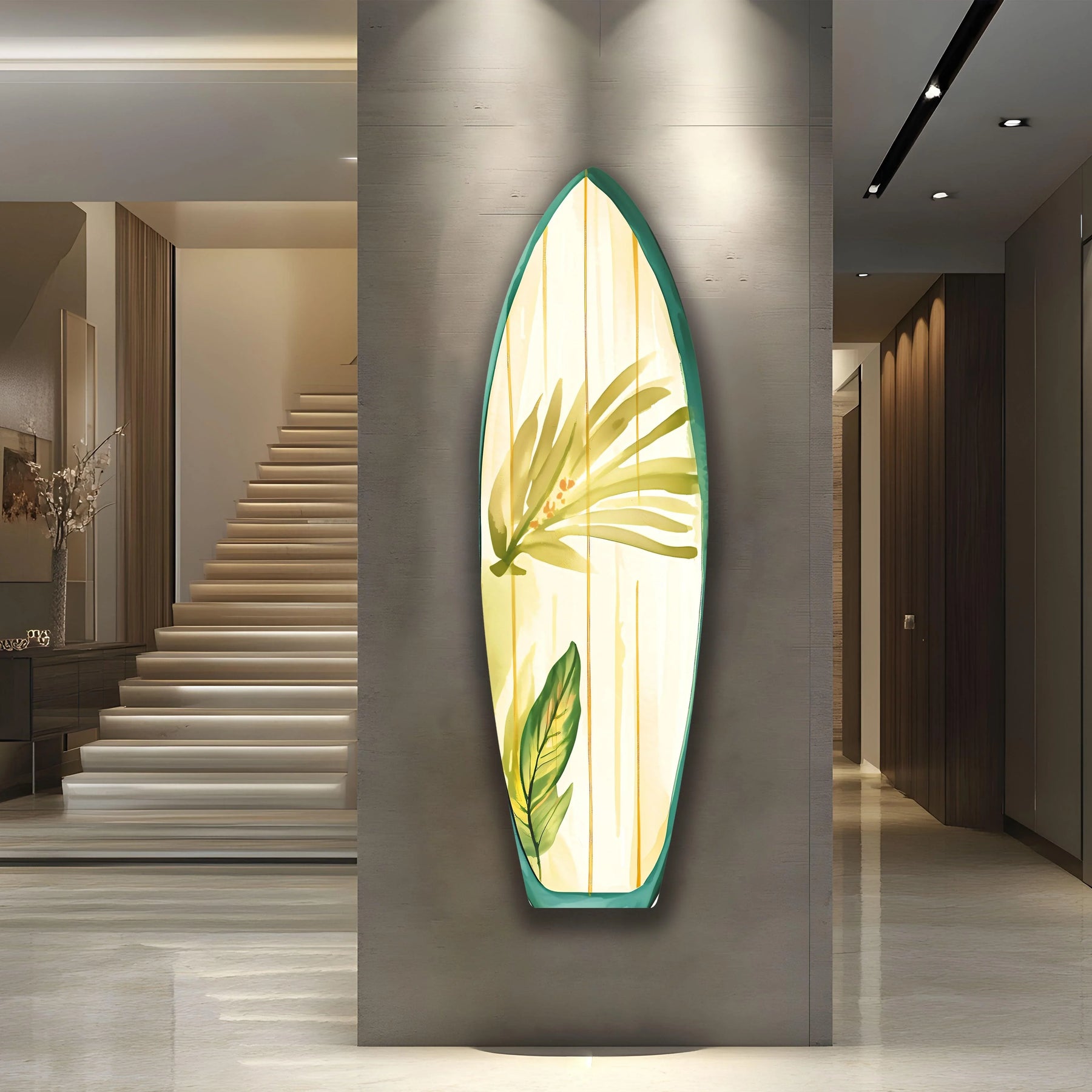 Elevate Your Space with the Green Leaf Surfboard Glass Wall Art