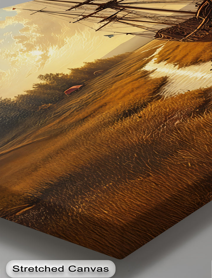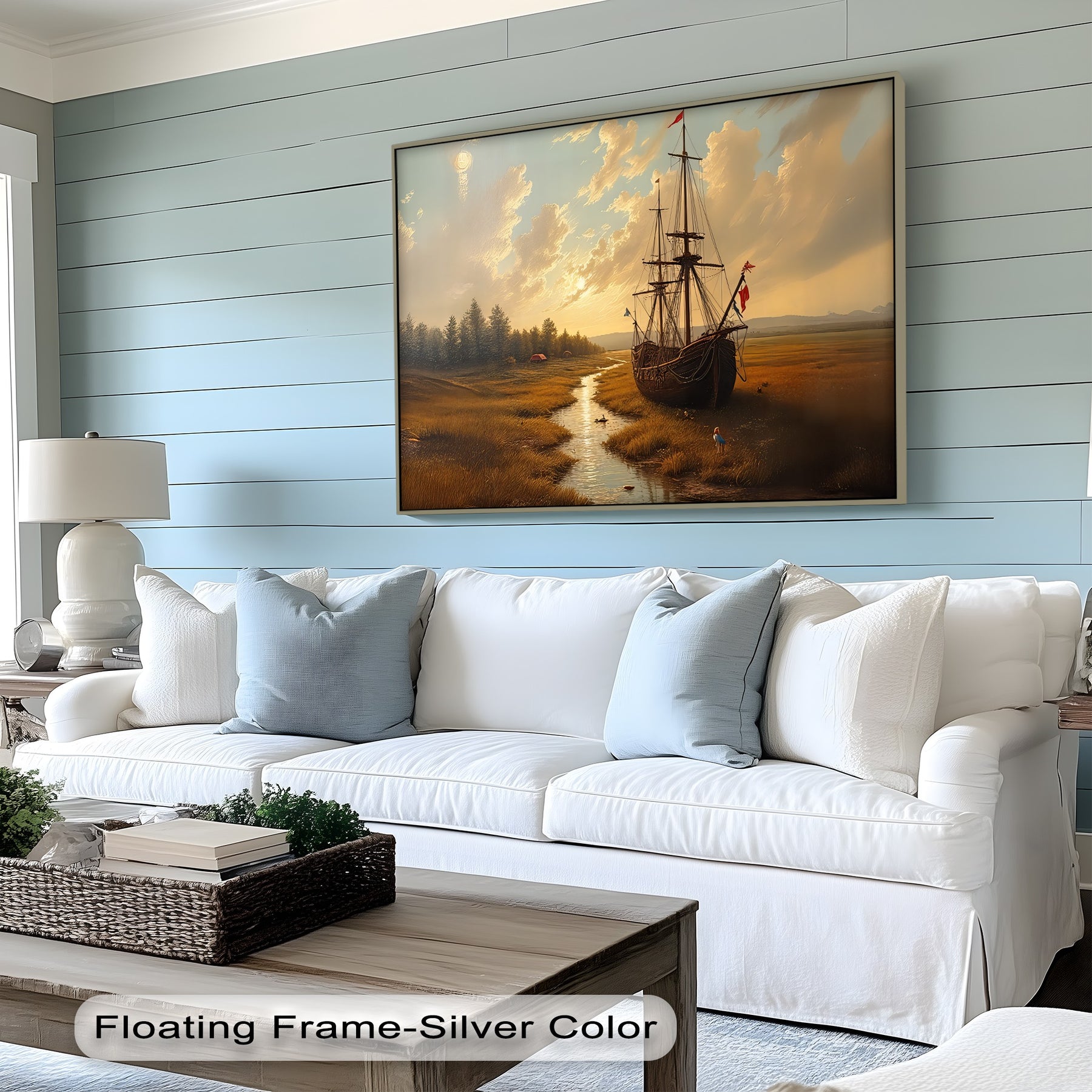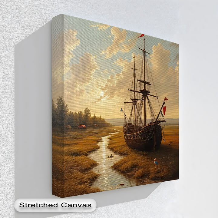 Harbor at Dusk – Anchored Tall Ship Canvas Wall Art captures the serene beauty of a historic sailing vessel resting along a golden marshland as the sun sets. The glowing sky reflects across calm waters, creating a timeless maritime scene filled with tranquility, history, and coastal charm.