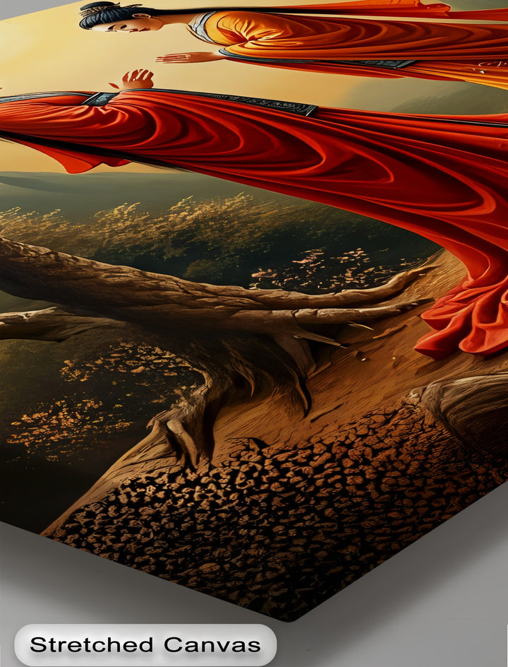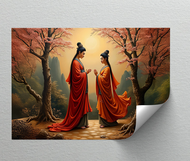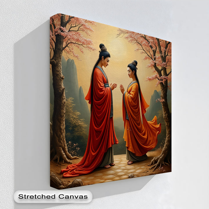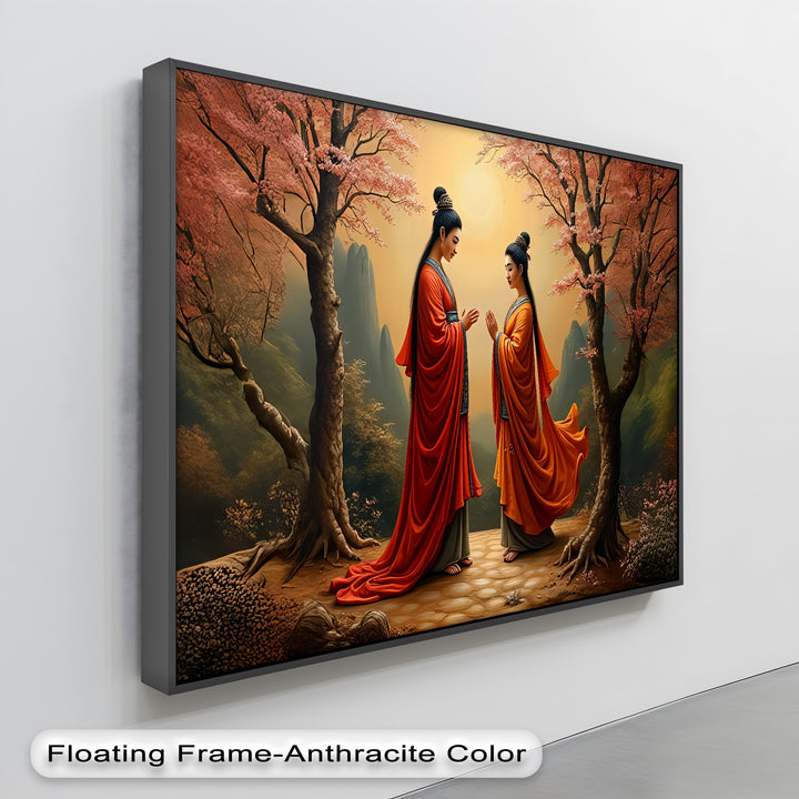 Harmony Under the Blossoms – Oriental Couple Canvas Wall Art captures a serene and timeless moment of unity. Set beneath blossoming cherry trees, the scene depicts two graceful figures in flowing red and orange robes, their posture reflecting peace, respect, and spiritual balance. The soft golden light of the sun enhances the tranquil atmosphere, blending natural beauty with symbolic harmony.