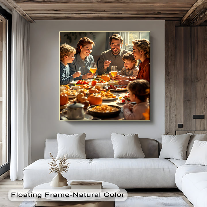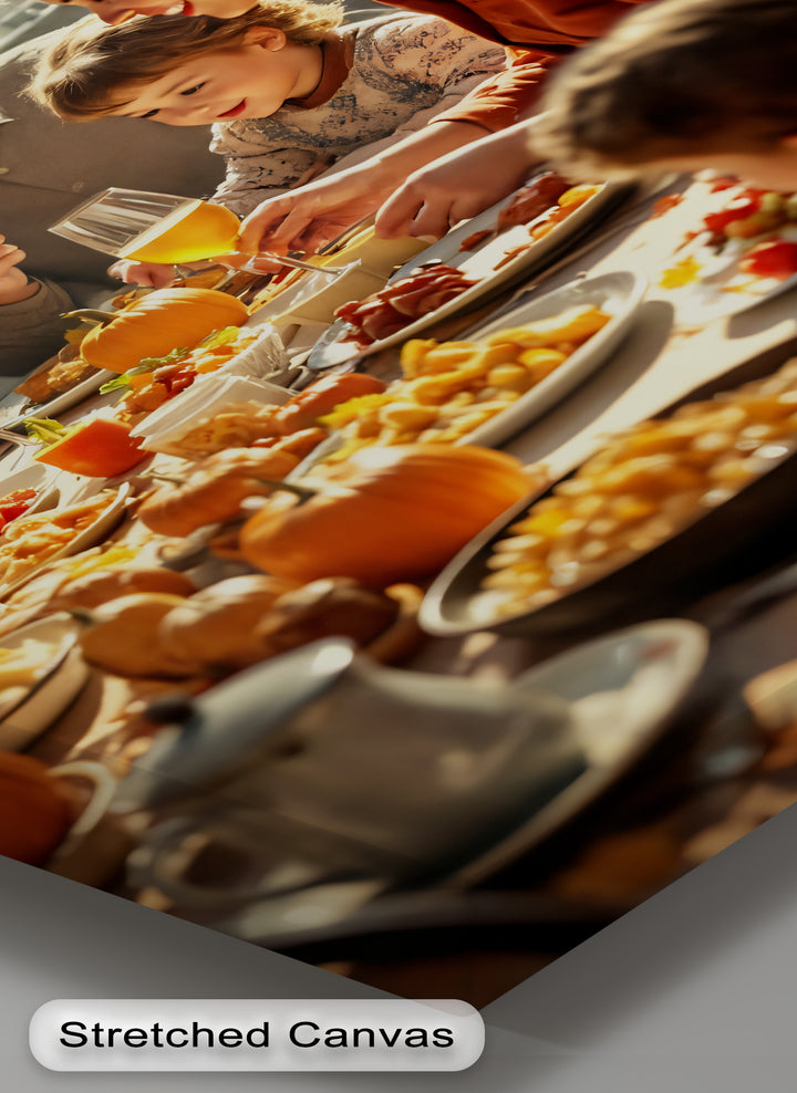 Celebrate the beauty of gratitude with Harvest Blessings, a family Thanksgiving canvas wall art that captures the warmth of togetherness. Sunlight pours through the window, illuminating a joyful dinner scene filled with pumpkins, seasonal dishes, and laughter. Every detail radiates comfort, abundance, and the timeless charm of autumn gatherings.