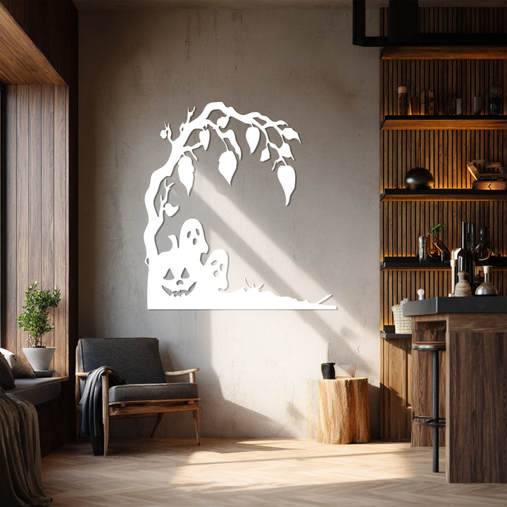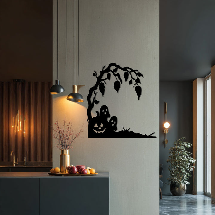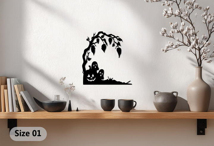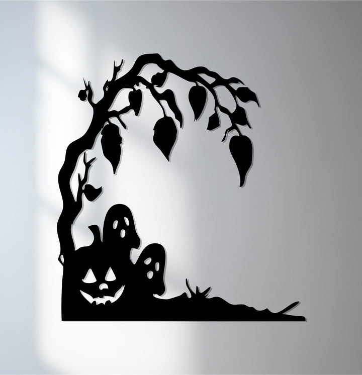 Bring the thrill of Halloween into your home with the Haunted Pumpkin & Ghosts Metal Wall Art. Featuring a grinning jack-o’-lantern, playful ghosts, and a twisted spooky tree, this piece captures the spirit of the season in a stylish silhouette.