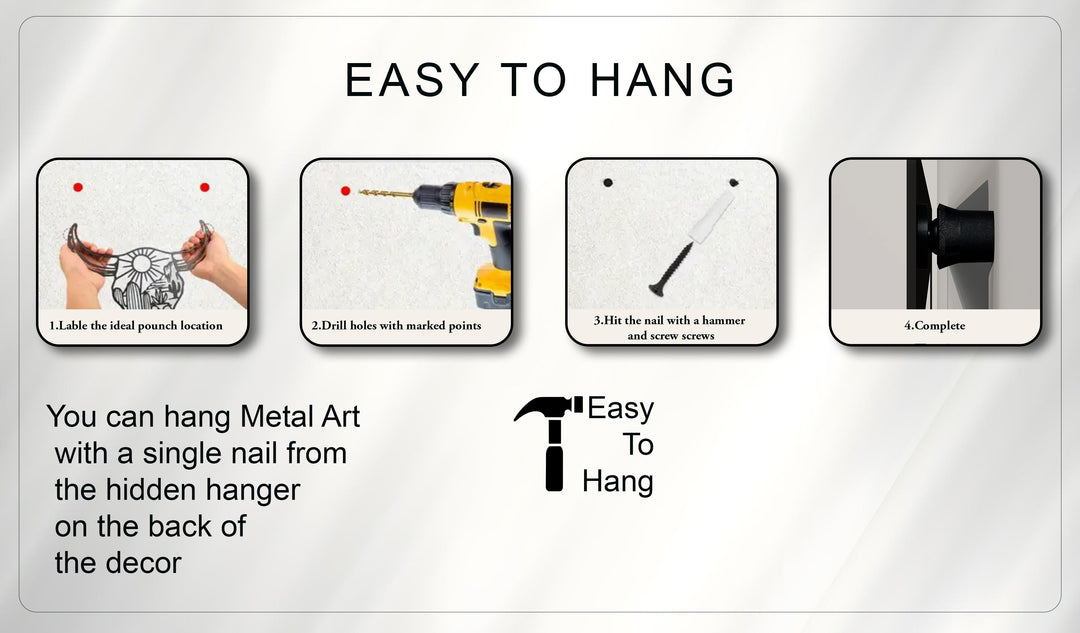 Our metal wall art comes fully ready to hang. Thanks to the hidden hanger on the back, you can easily mount it on the wall with a single nail—no extra tools or hardware needed!