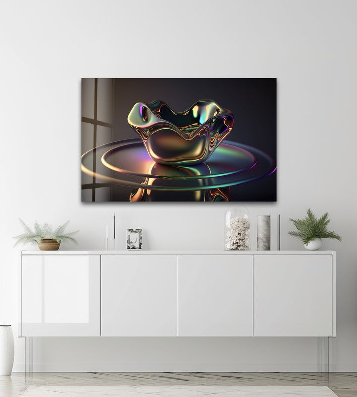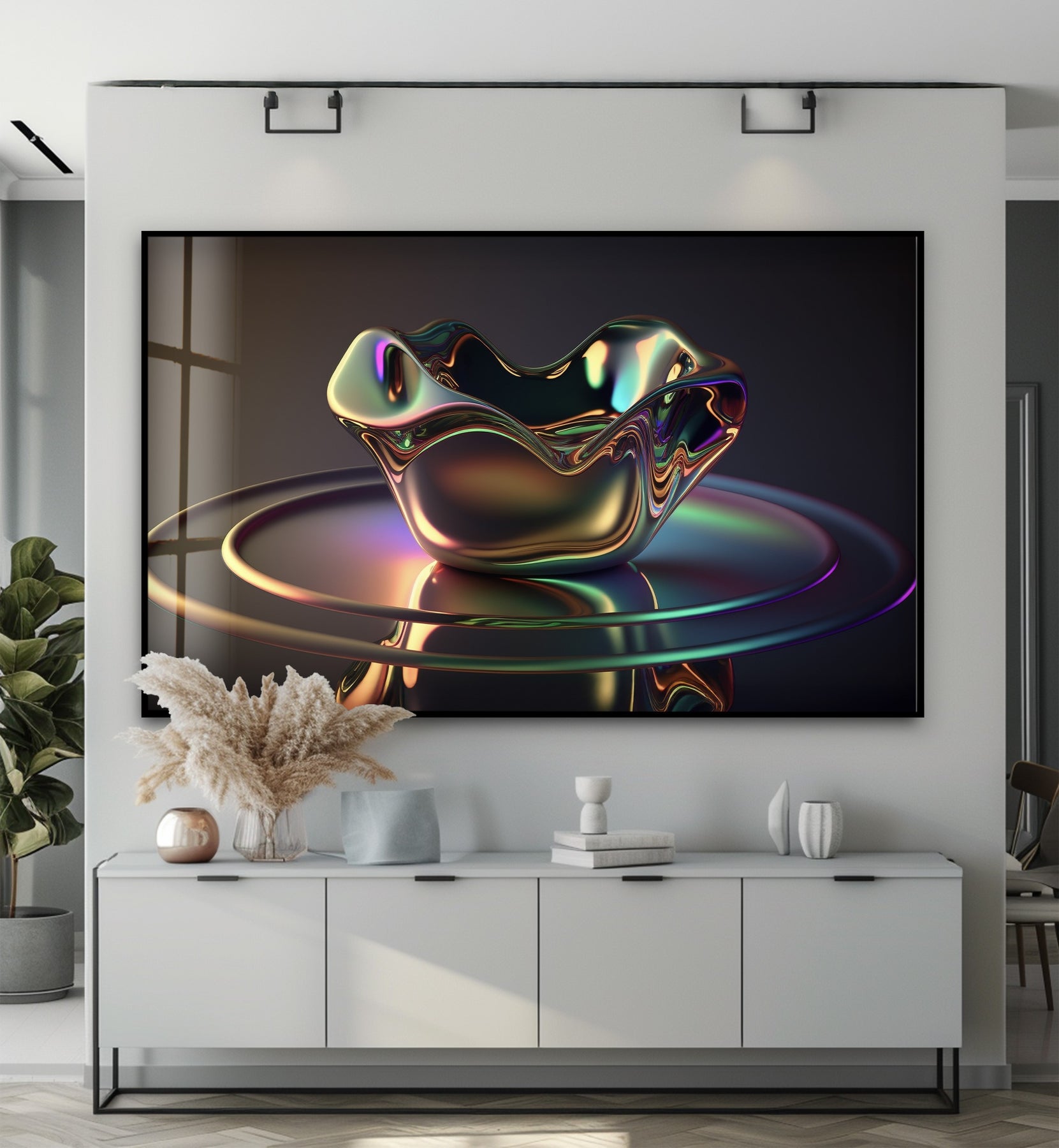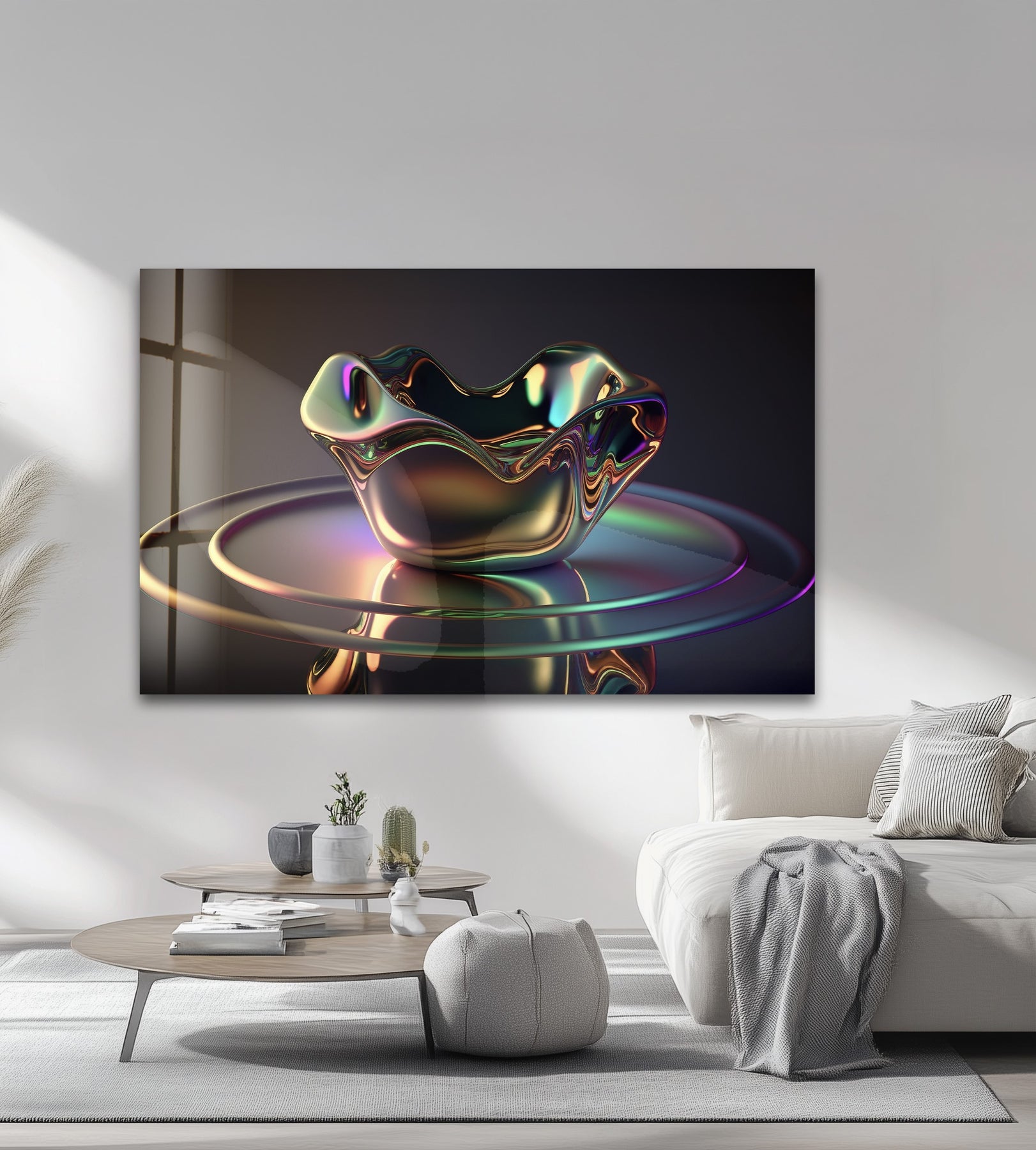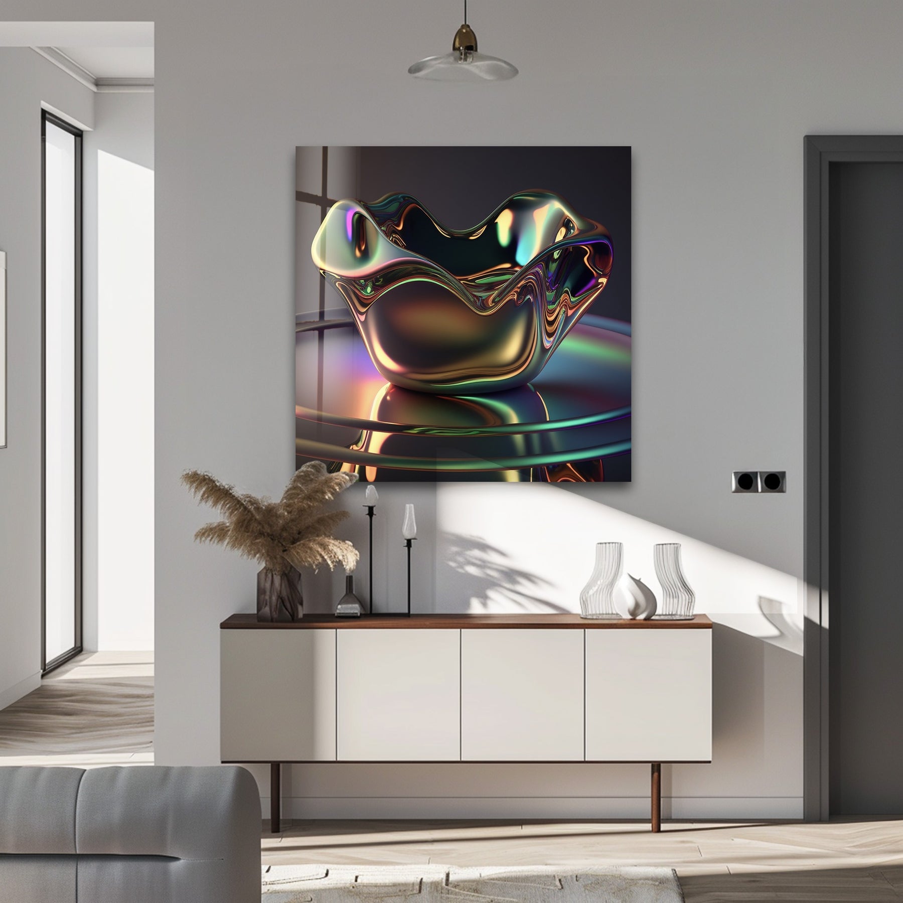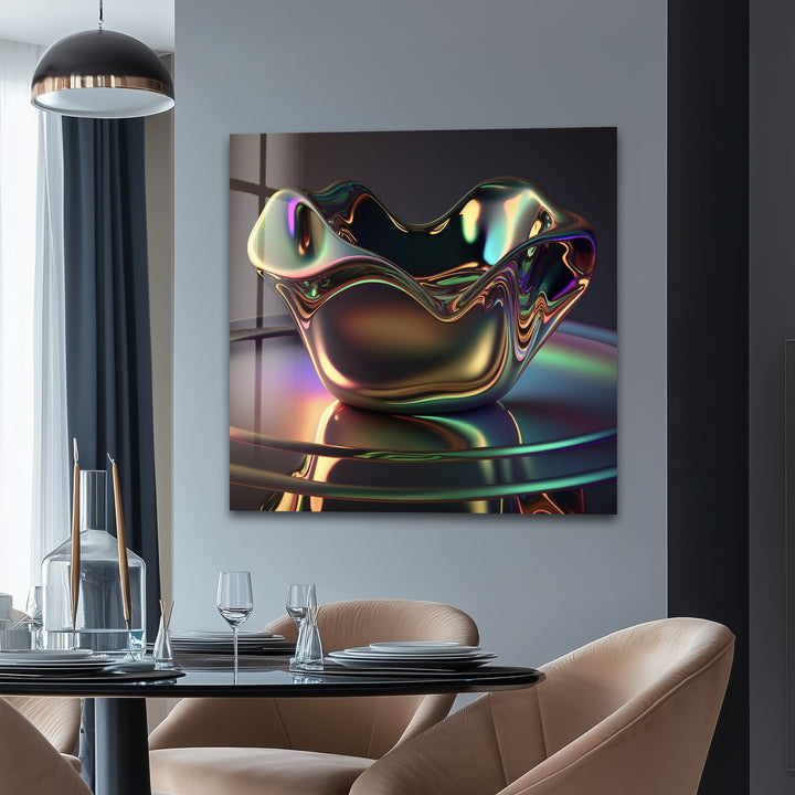 Printed on ultra-gloss premium glass, every reflective highlight and iridescent gradient is captured with exceptional clarity. Ideal for living rooms, dining areas, creative studios, offices, and upscale commercial interiors, this artwork becomes a statement piece—striking, futuristic, and visually unforgettable.