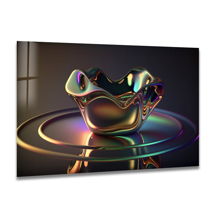 Bring artistic futurism and luminous elegance into your space with Iridescent Sculpted Bloom – Futuristic Chrome Bowl Glass Wall Art. This mesmerizing artwork features a reflective, organically shaped chrome bowl resting on layered circular plates, all glowing with shifting hues of teal, magenta, gold, violet, and amber. The fluid metallic curves create a surreal sculptural presence—perfect for contemporary interiors that appreciate bold, imaginative design.