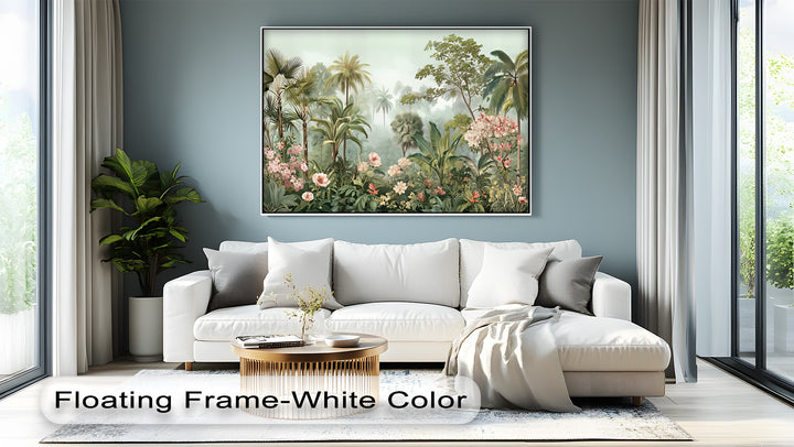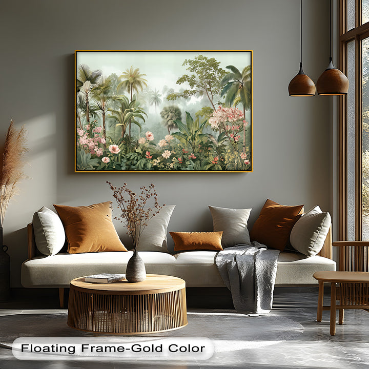 Immerse your space in the lush serenity of Mystic Tropics, a breathtaking botanical mural canvas wall art that brings the enchantment of a tropical rainforest indoors. Towering palms, broad banana leaves, and delicate orchids bloom against a misty jungle backdrop, creating a scene that feels both exotic and serene. The muted green palette, touched with soft pinks and corals, evokes the essence of untouched paradise.