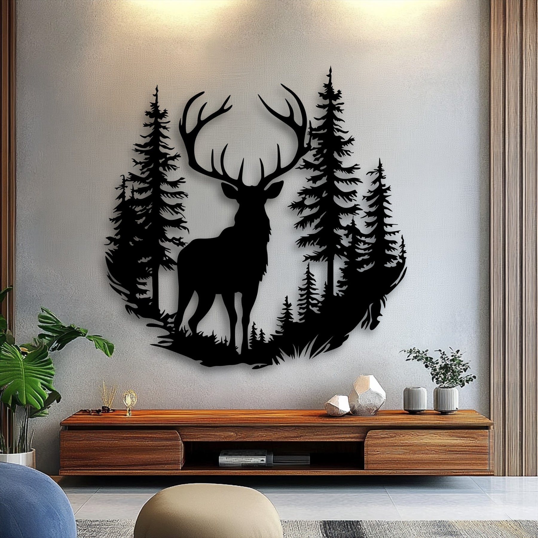 ✔ Striking deer silhouette with forest landscape design