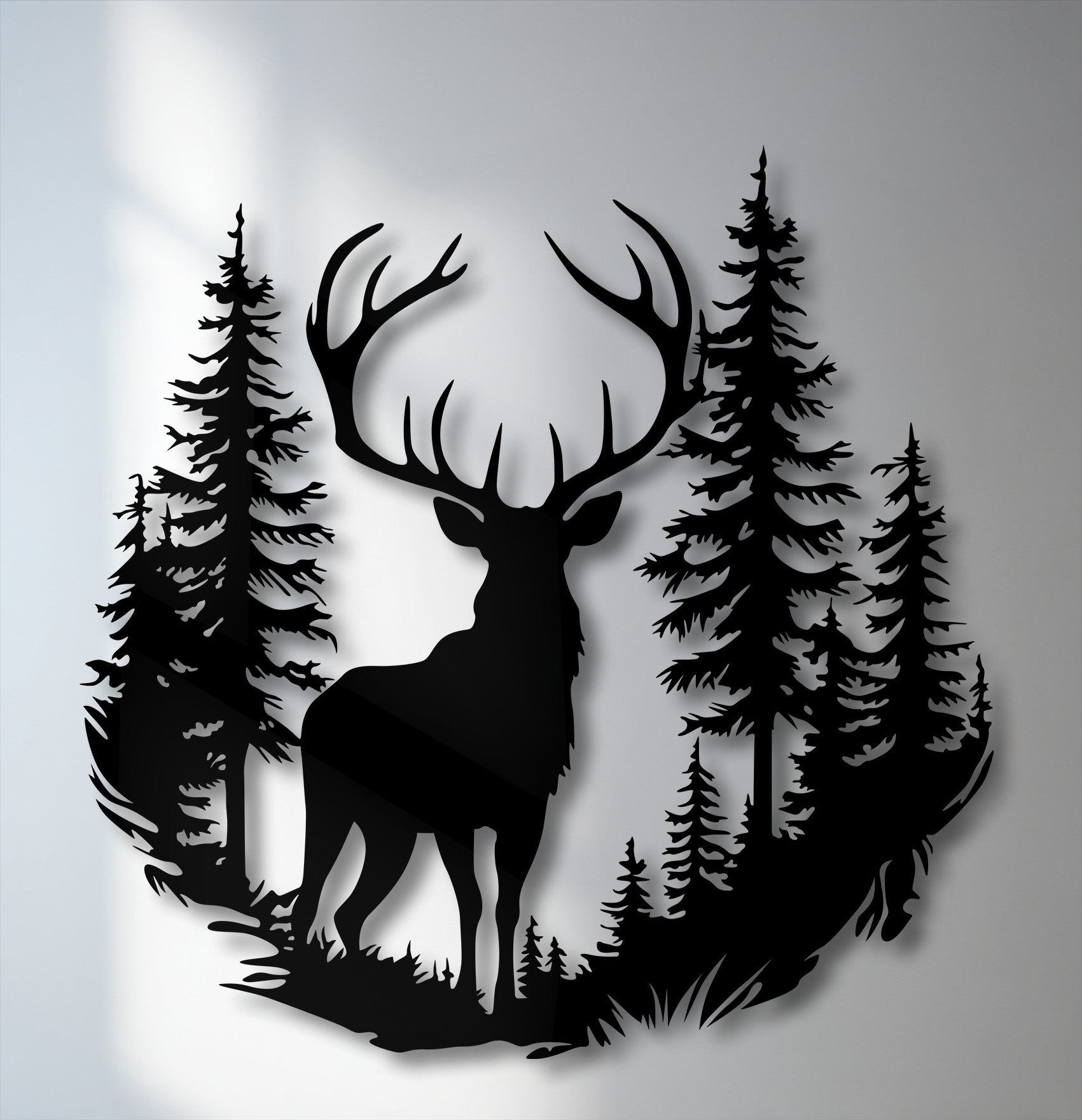 The bold silhouette of the deer, with its impressive antlers, stands at the center of a forest landscape, creating a powerful focal point. Surrounding trees add depth and atmosphere, while the intricate cut details bring texture and life to the scene. As light hits the piece, soft shadows enhance its layered composition, giving your wall a dynamic and immersive feel.