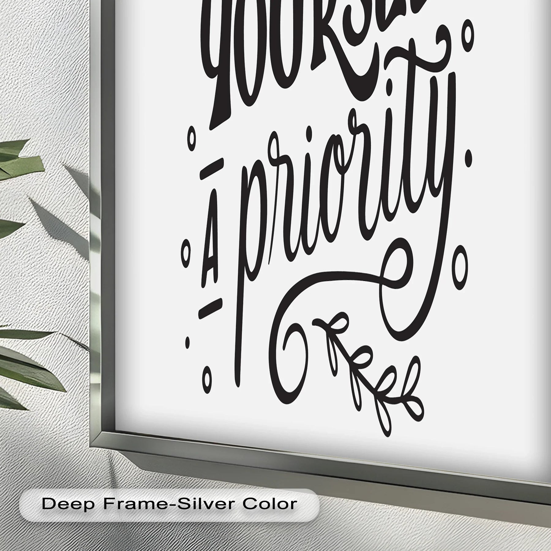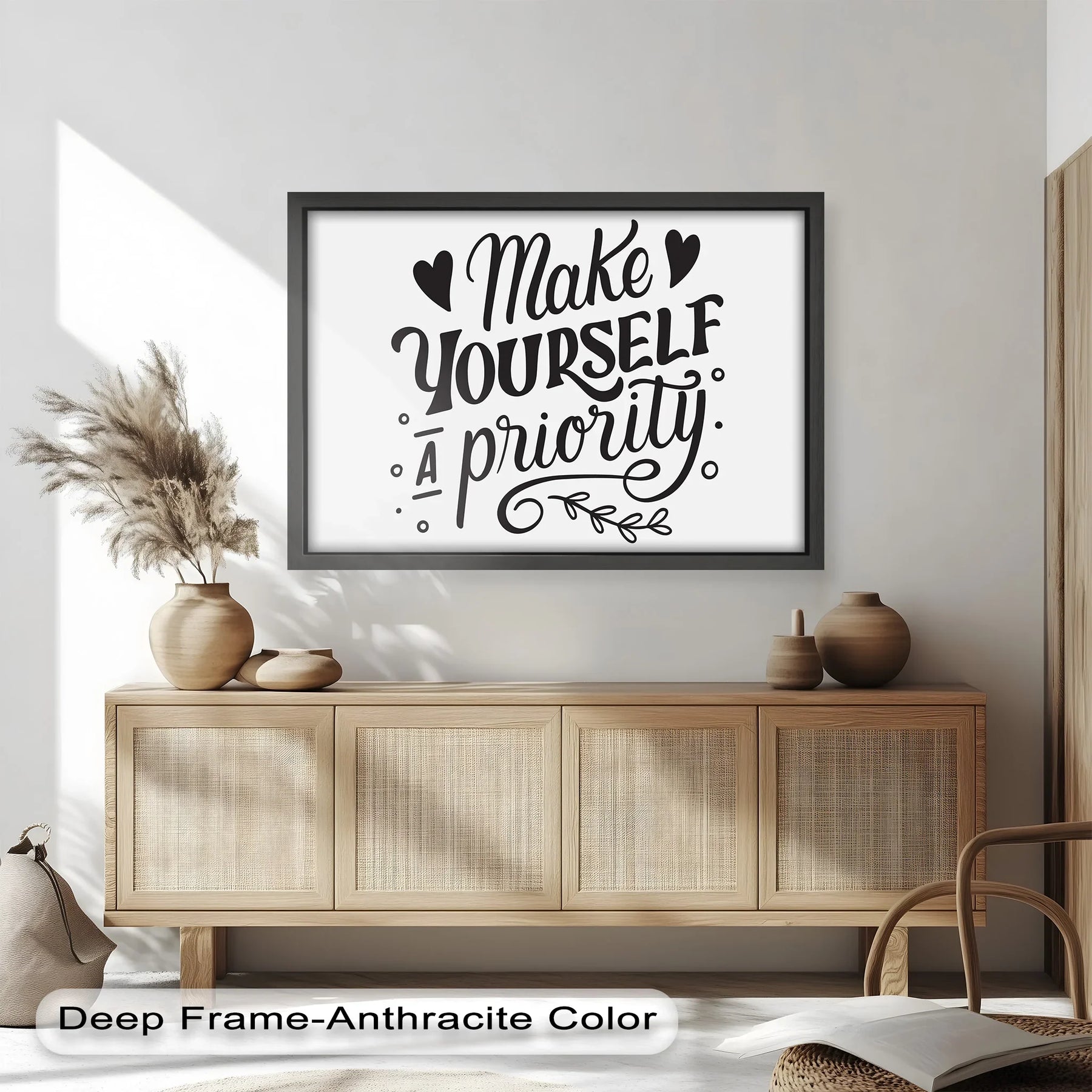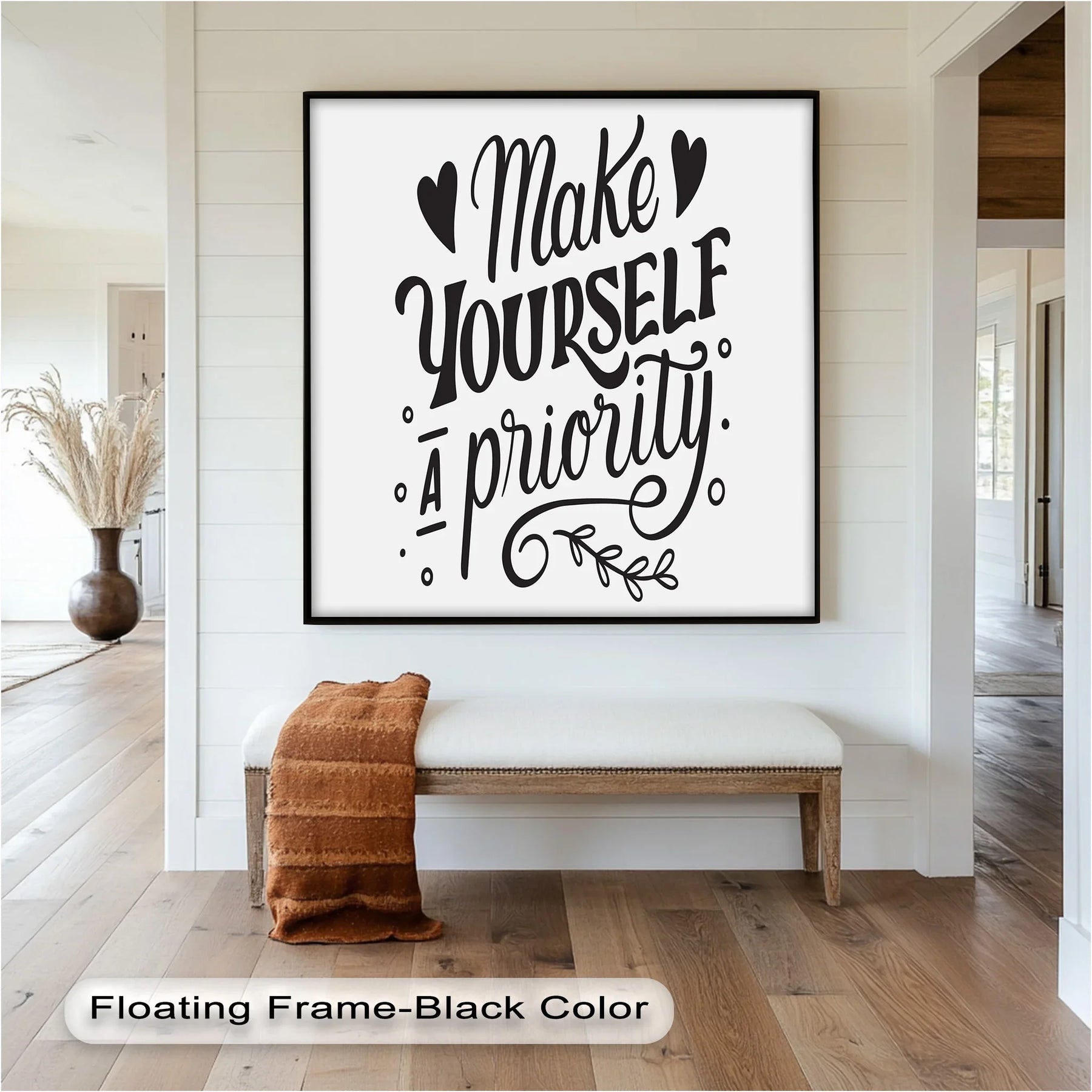 Uplift your space with Make Yourself a Priority, a bold and empowering wall art print designed in a stylish black-and-white palette. Featuring elegant script and heart accents, this motivational quote encourages self-love, wellness, and positive affirmation—perfect for bedrooms, offices, therapy rooms, or self-care spaces.