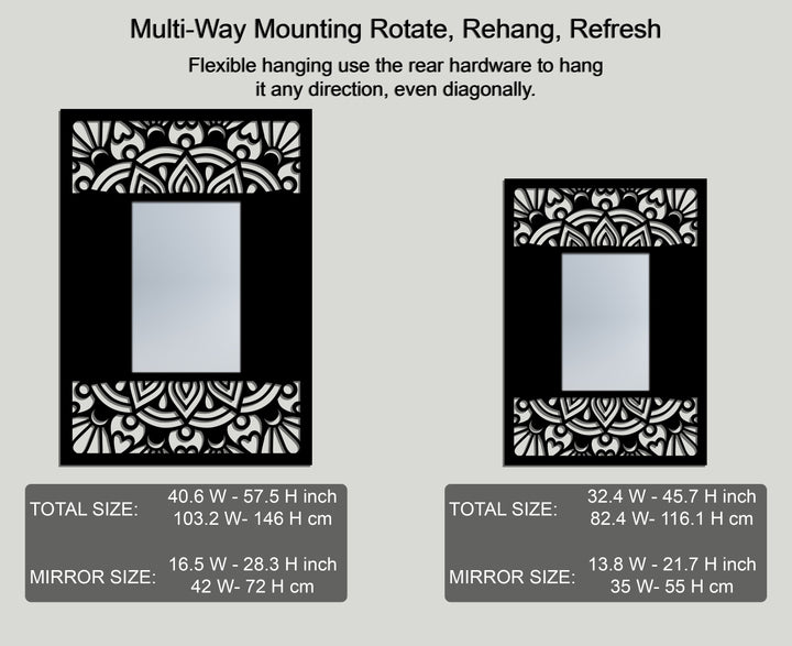 The contrast between the clean central mirror and the intricate surrounding pattern turns this piece into a decorative focal point as well as a functional mirror.