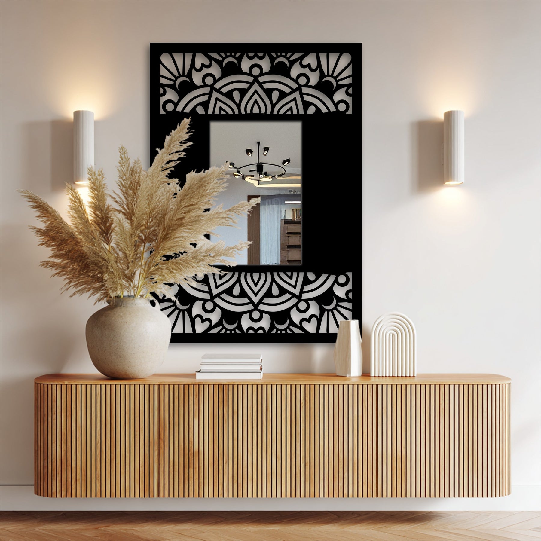 The symmetrical geometric motif adds a refined decorative touch, while the strong matte black frame keeps the overall design modern and architectural. This mirror works beautifully in entryways, living rooms, bedrooms, or boutique-style interiors where both elegance and structure are desired.