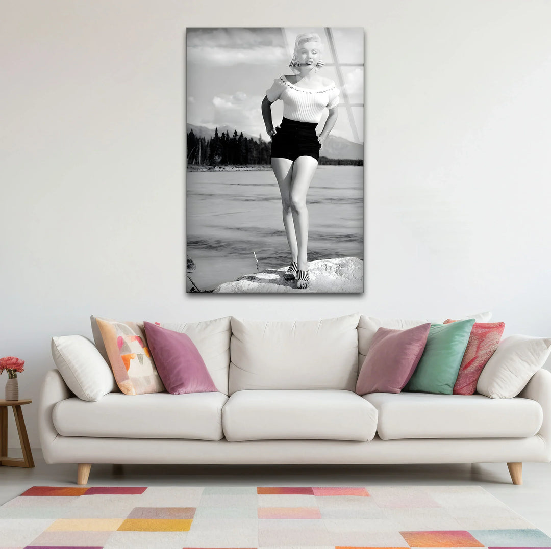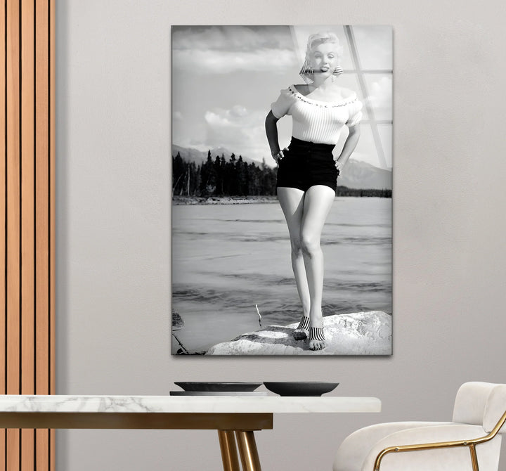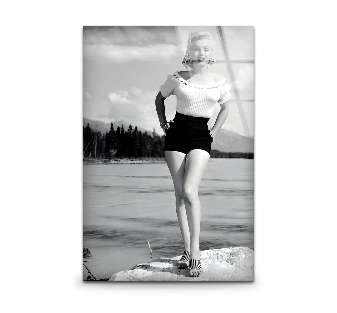 Celebrate timeless elegance with this captivating Marilyn Monroe in Alberta Black and White Glass Wall Art. Featuring the iconic actress set against a stunning natural backdrop, this black and white wall art exudes vintage charm and sophistication. Ideal for living rooms, bedrooms, or offices, it serves as a statement piece for lovers of classic Hollywood style.