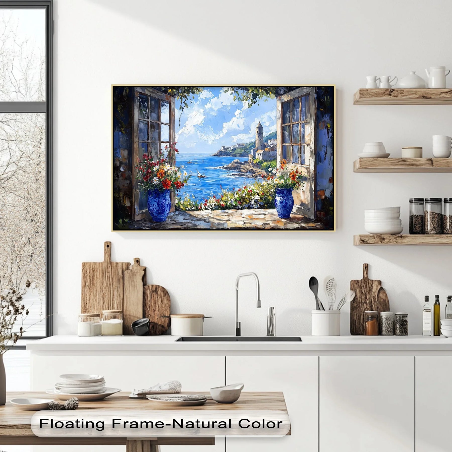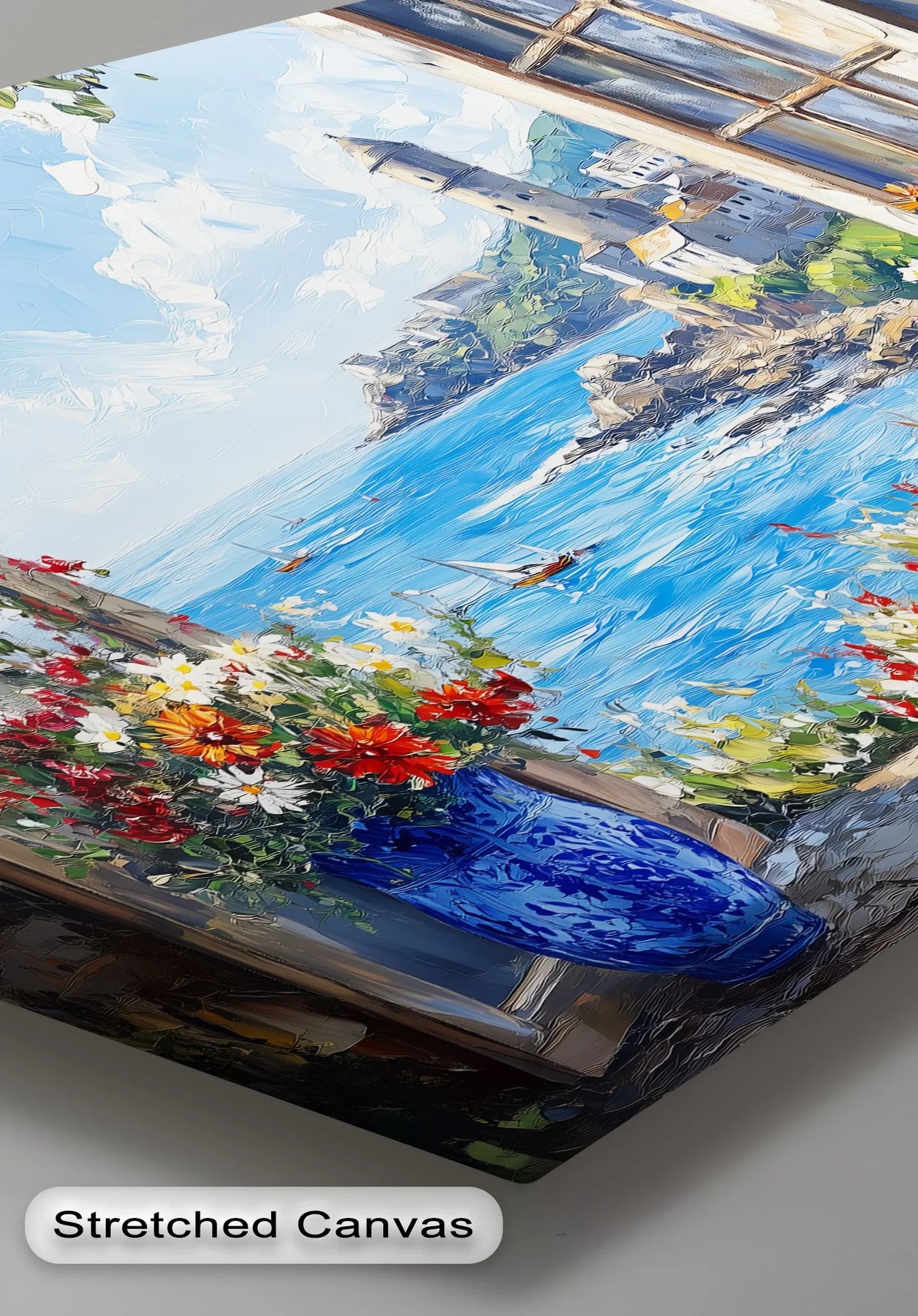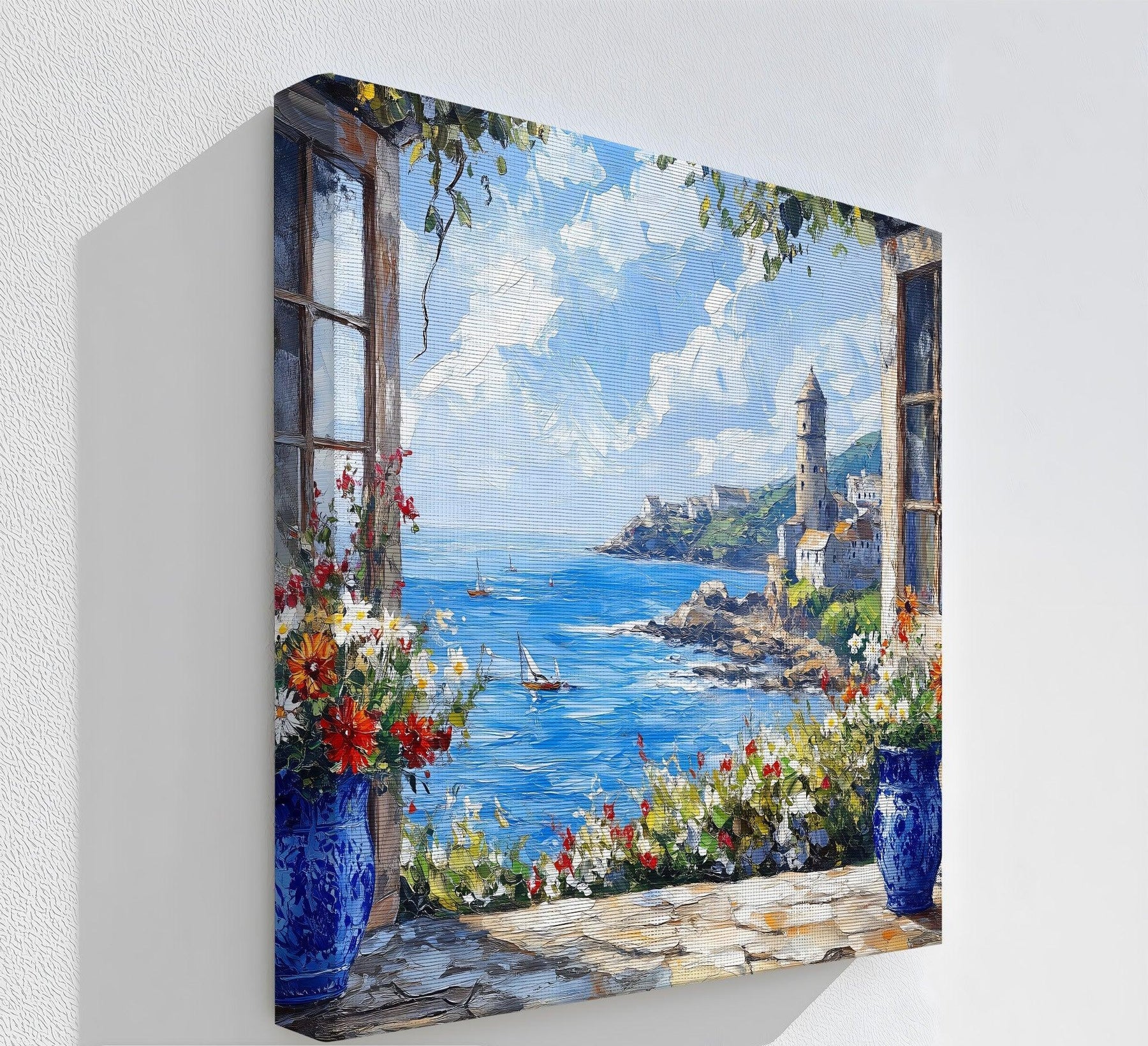 Escape to the sunlit shores of the Mediterranean with this breathtaking canvas print that opens onto a vibrant seaside scene. Framed by classic wooden windows and blooming floral pots, the view reveals bright blue waters, historic towers, whitewashed architecture, and drifting sailboats under a crisp sky. A perfect piece for transforming your home into a serene coastal retreat.