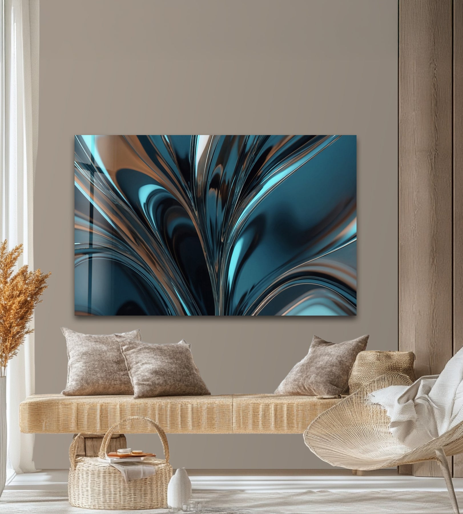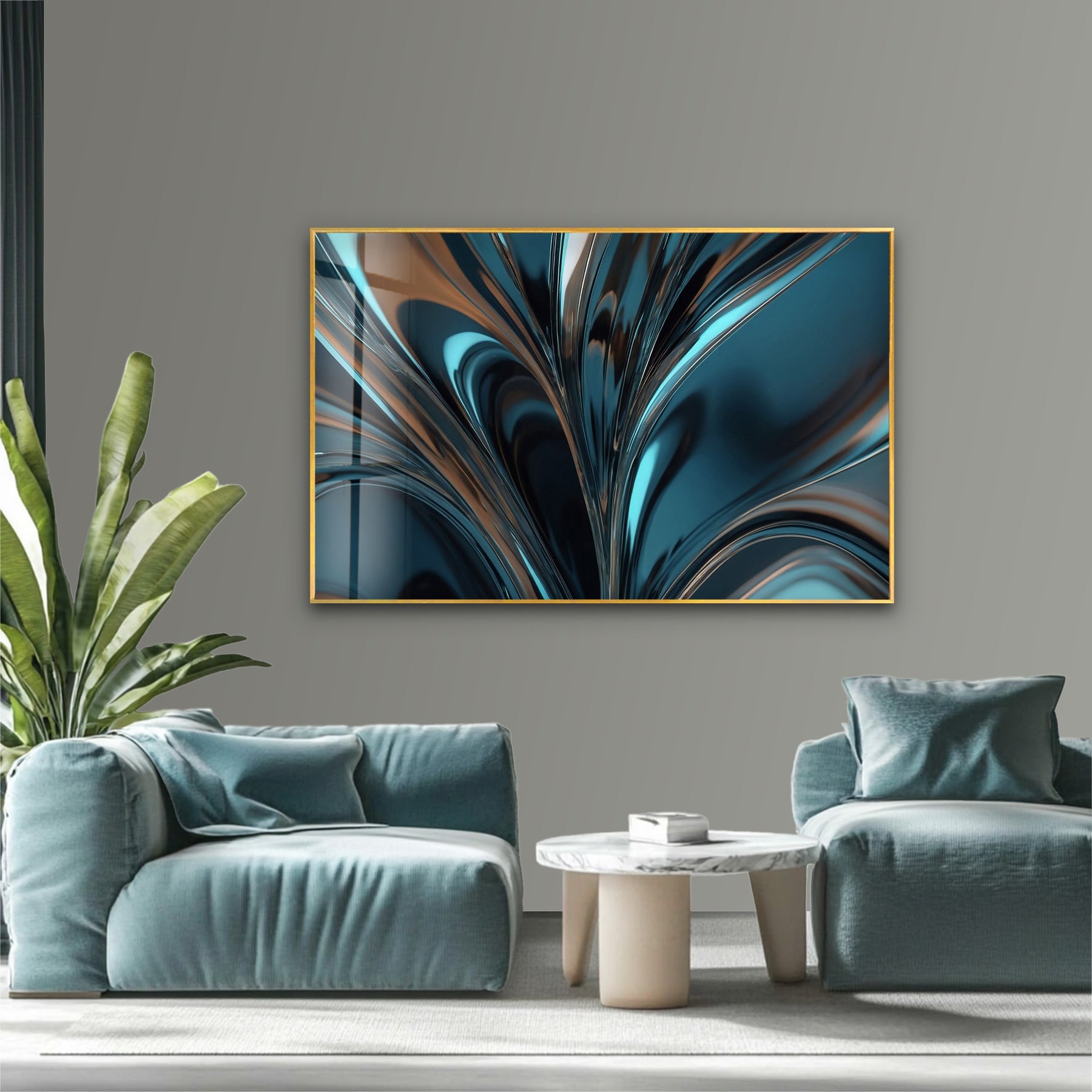 Transform your space with the bold elegance of Midnight Aqua Surge – Abstract Teal Chrome Glass Wall Art. This striking artwork features deep teal waves and flowing chrome reflections that rise upward like liquid energy in motion. The glossy, sculptural shapes create depth, rhythm, and a dramatic modern aesthetic—perfect for interiors that favor sleek, contemporary design.