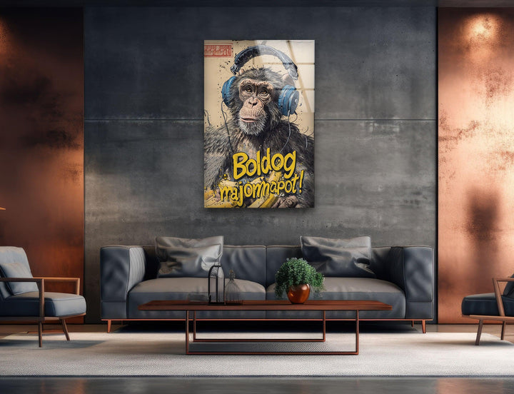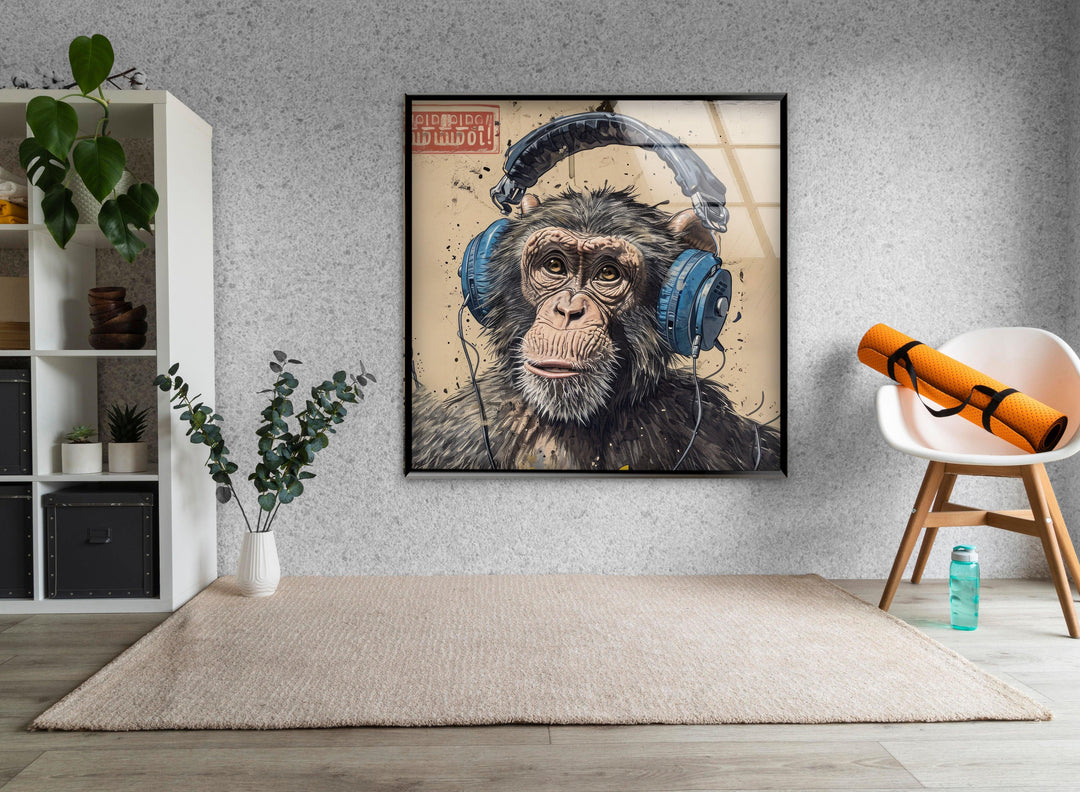 Monkey in Headphones Glass Wall Art