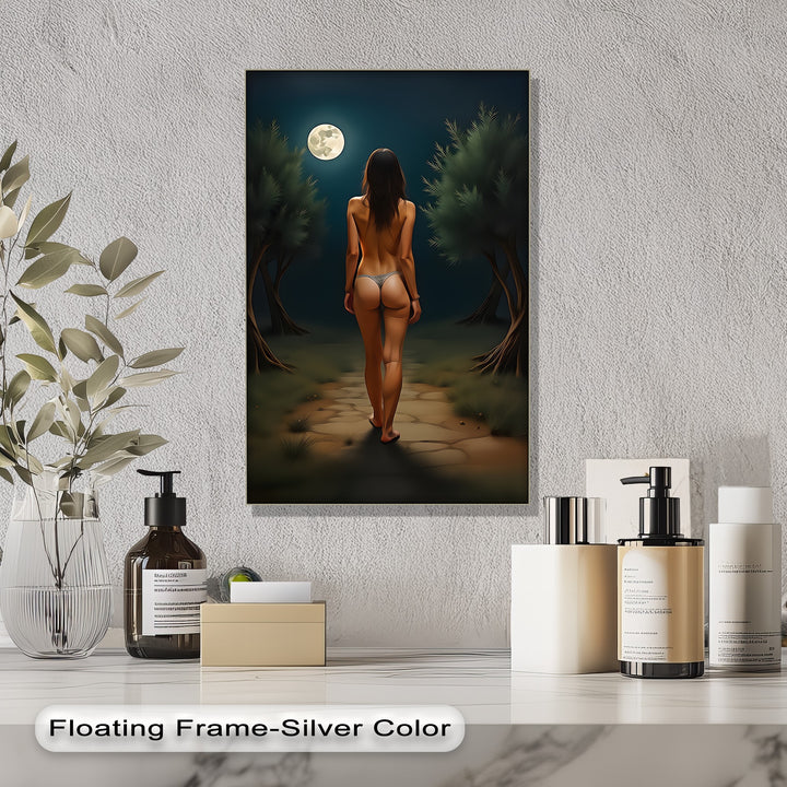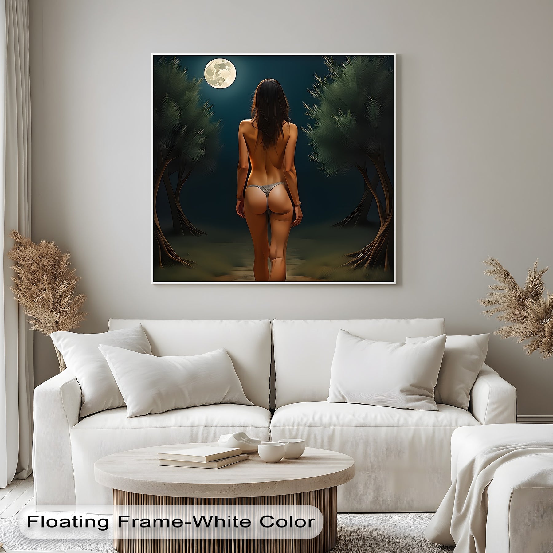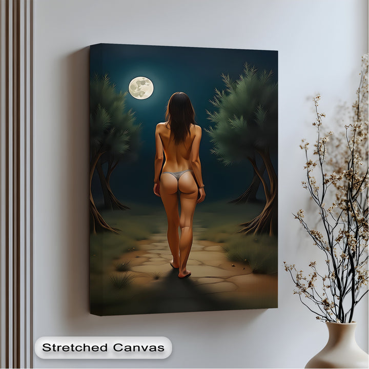 Step into the enigmatic calm of Moonlit Solitude, a striking nude canvas wall art that captures the quiet beauty of a moonlit walk. The figure, subtly illuminated by a glowing full moon, evokes a sense of introspection and sensual freedom. Set against a twilight forest path, this composition merges natural mystery with emotional intimacy—an evocative piece for modern collectors of atmospheric art.
