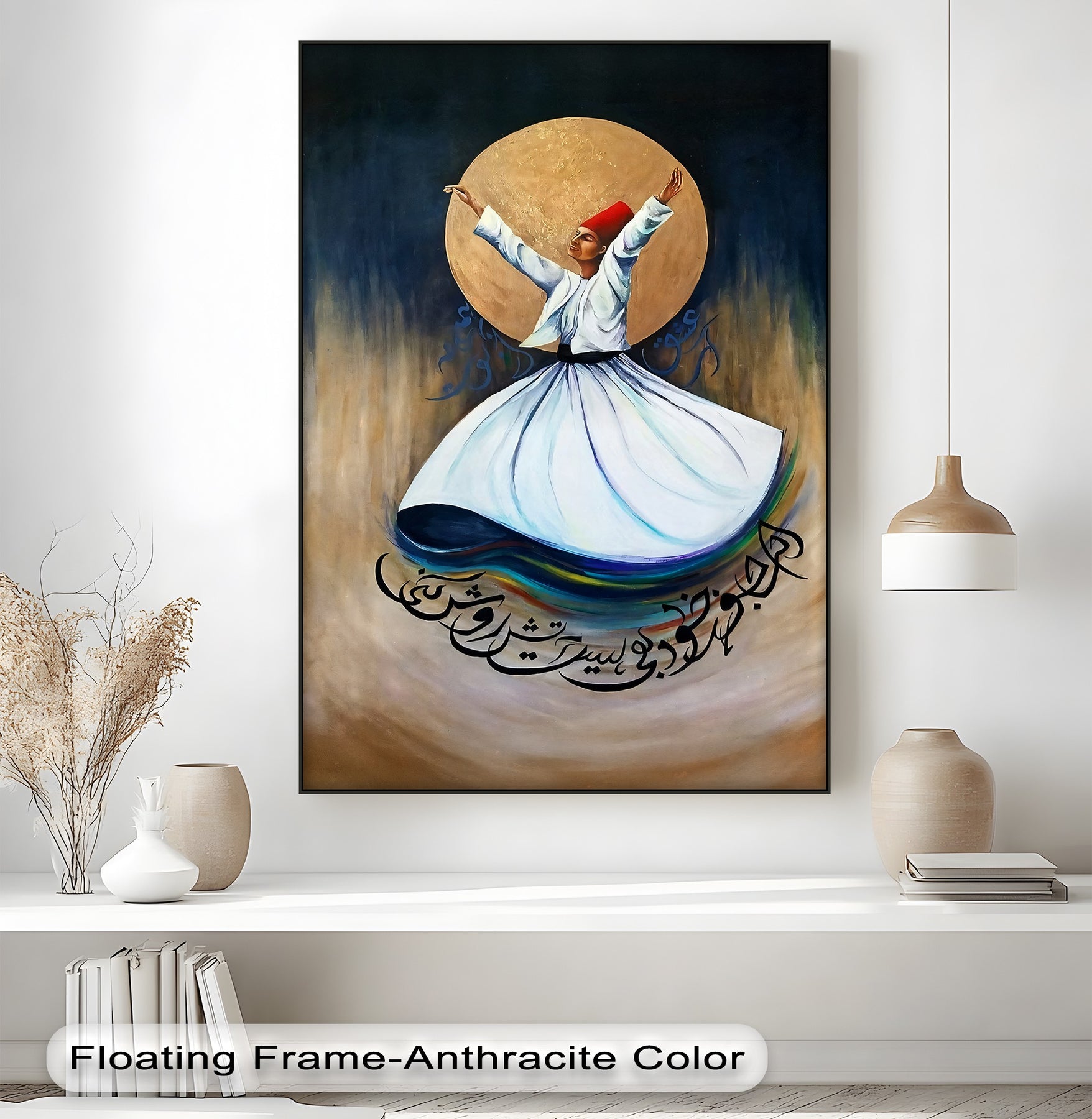 Perfect as Islamic home decor, this large framed canvas wall art brings harmony and serenity to your living room, prayer area, or office. The dynamic calligraphy encircling the dervish adds depth and meaning, transforming your wall into a spiritual focal point.