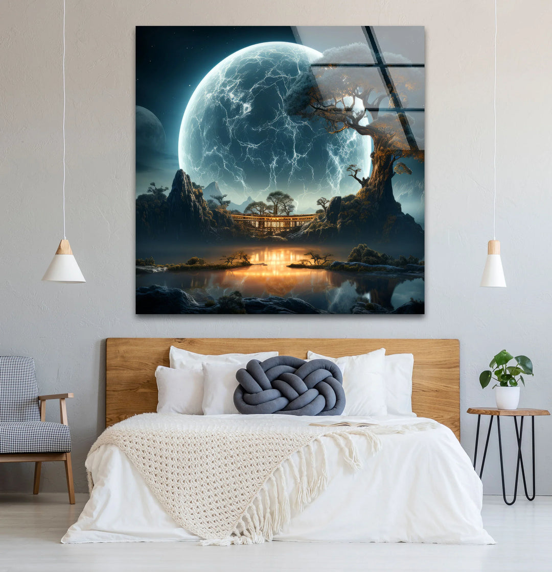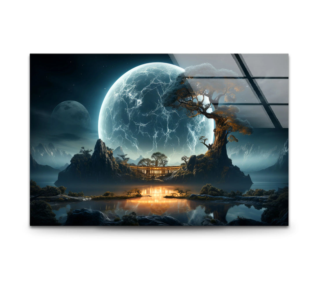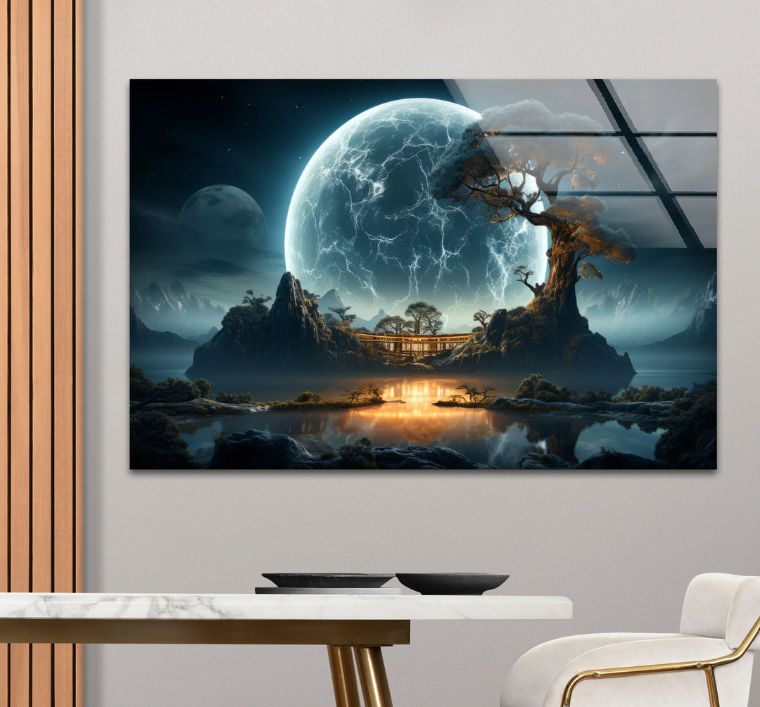 Bring celestial serenity into your home with the Moonlit Zen Temple Wall Art – Futuristic Landscape Glass Print. This striking artwork features a glowing moon, ancient bonsai trees, and a dreamlike temple nestled in a tranquil landscape, blending elements of sci-fi and traditional Japanese aesthetics. UV printed in ultra-high 8K detail on reinforced tempered glass, this piece adds otherworldly elegance and bold atmosphere to any modern setting.