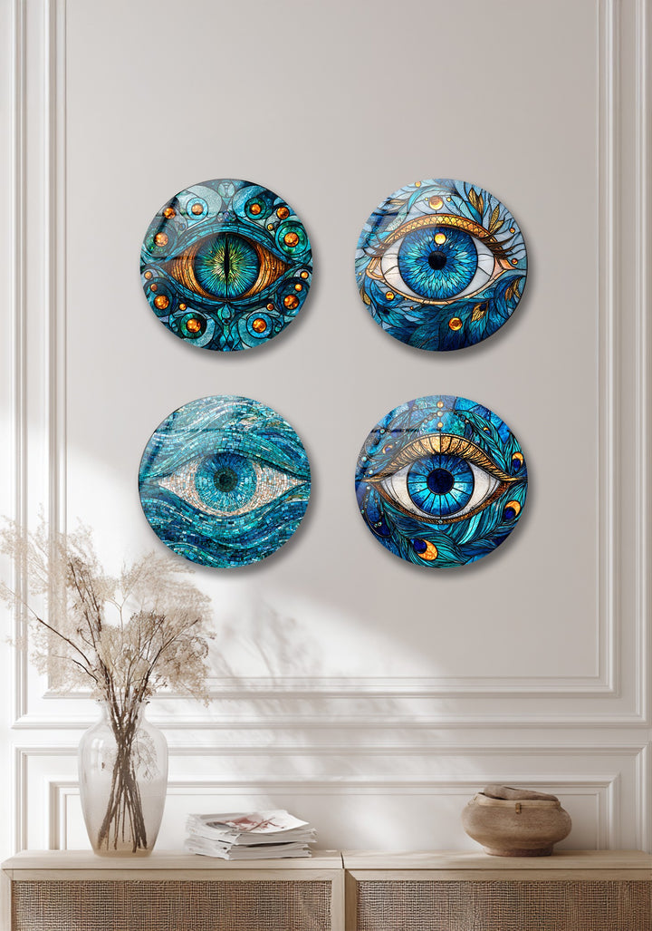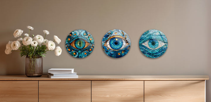 Mystic Vision Trio – Blue Evil Eye Mosaic Round Glass Wall Art Set