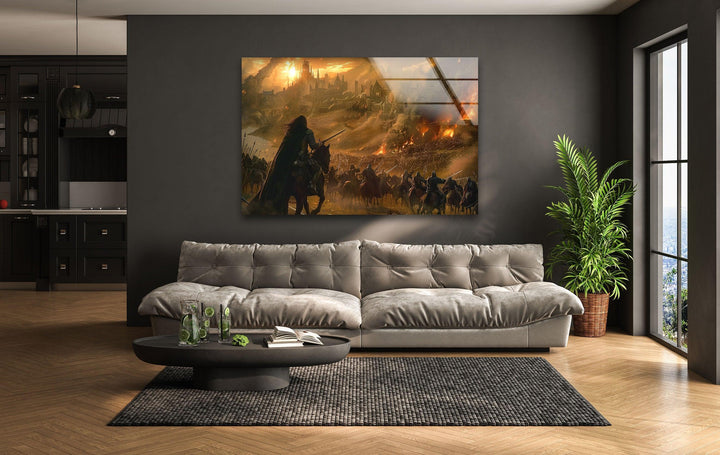 Step into the grandeur of an epic clash with this Mythic Battle Scene Glass Wall Art. This captivating cinema artwork captures the scale and intensity of a legendary battle at dawn, where forces converge against a blazing backdrop of castles and mountains. This piece brings drama and adventure to your decor, making it perfect for fantasy enthusiasts and admirers of mythical tales.