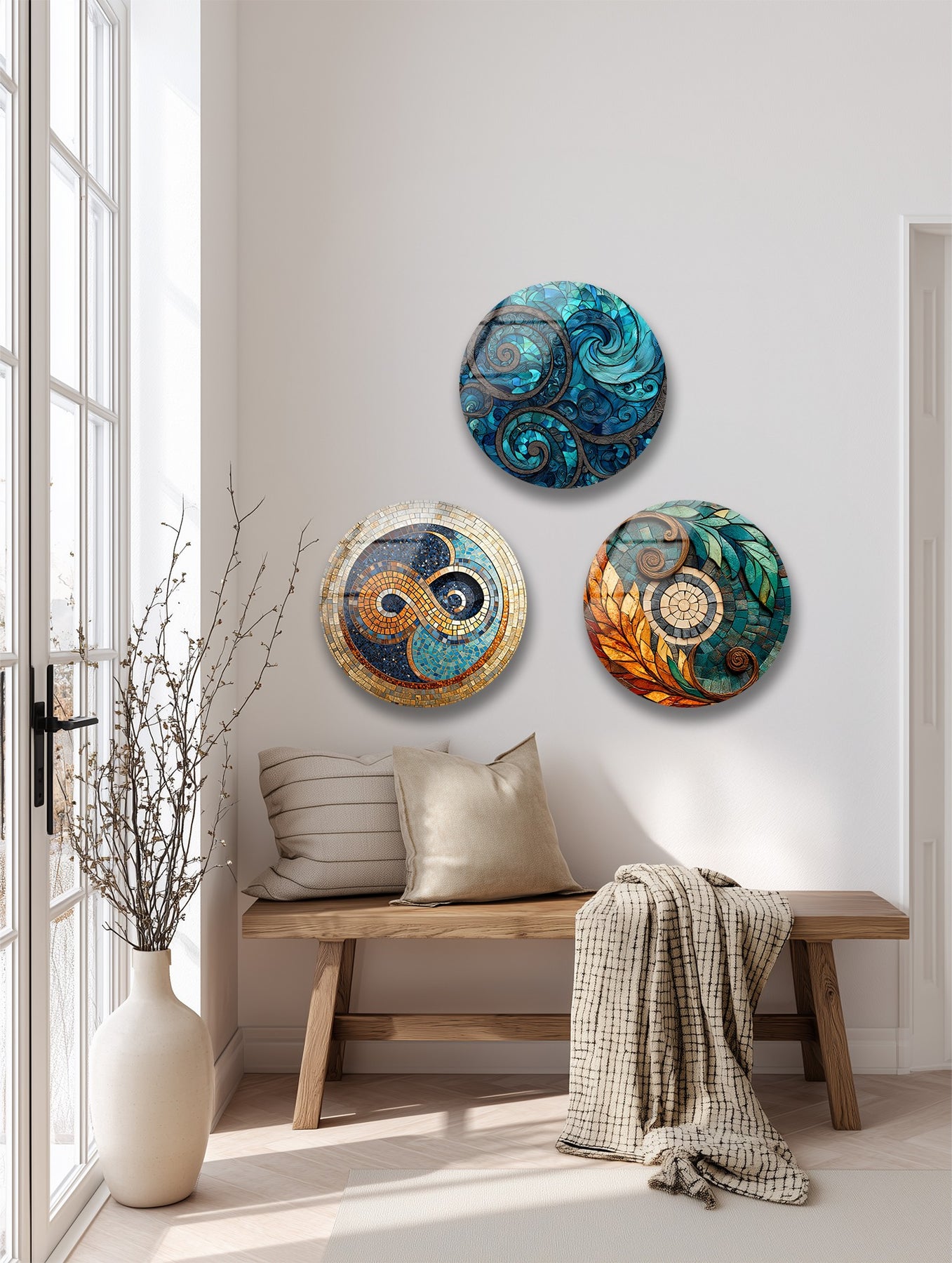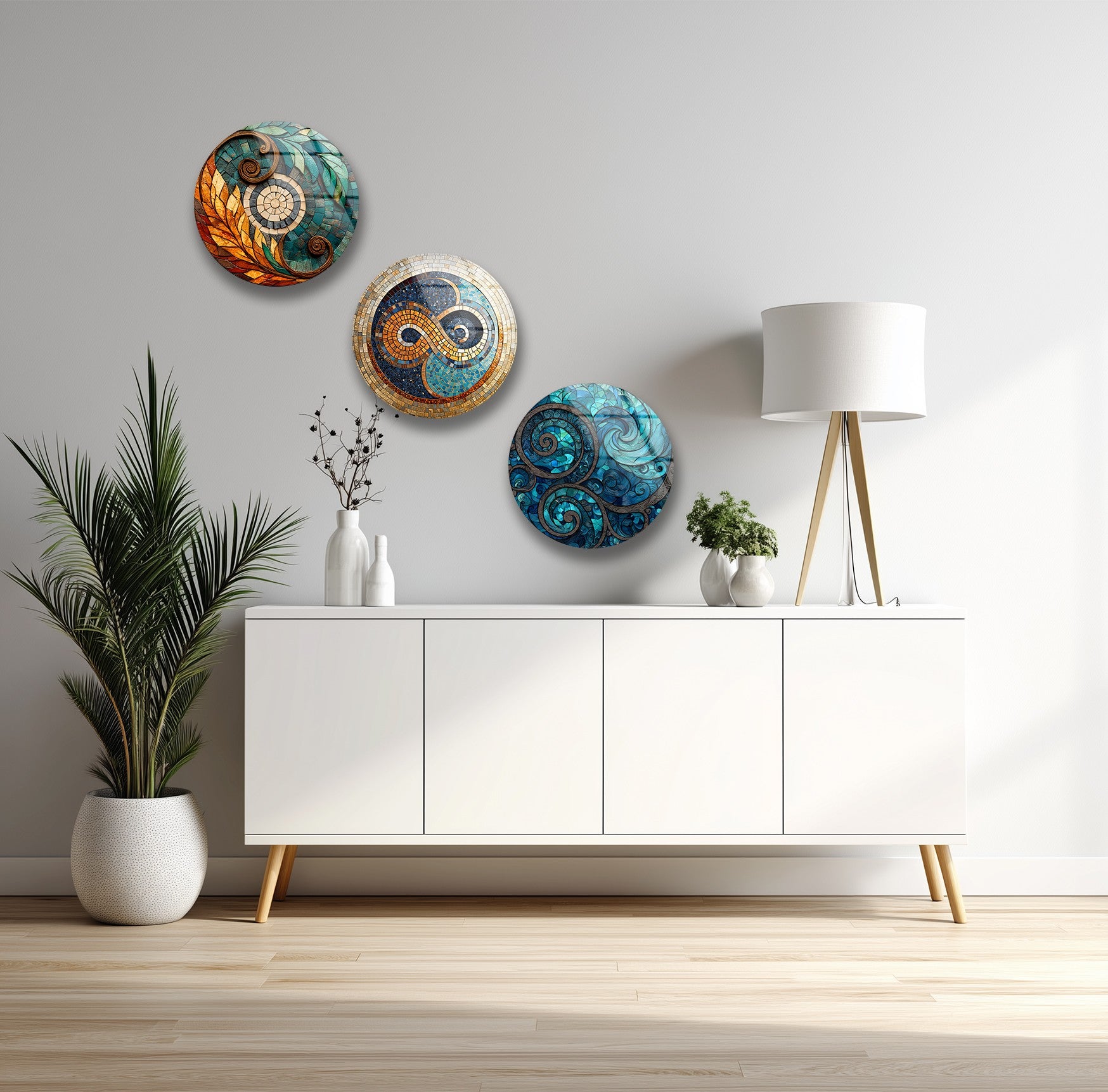 Immerse your home in the tranquil beauty of the sea with the Ocean Harmony Quartet – Abstract Swirl Mosaic Round Glass Wall Art Set. This stunning four-piece collection captures the essence of flowing waves, golden currents, and spiraling energy — a perfect balance between movement and serenity. Each round glass artwork is adorned with detailed mosaic patterns in shimmering blues, aquas, and touches of gold, reflecting both the power and calm of nature.