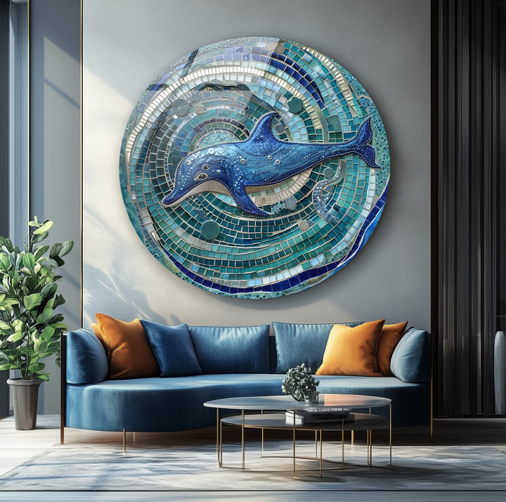 Ocean Spirit – Blue Dolphin Mosaic Round Glass Wall Art