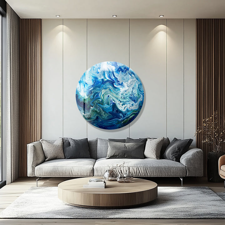 Ocean Veins – Blue Abstract Fluid Round Glass Wall Art