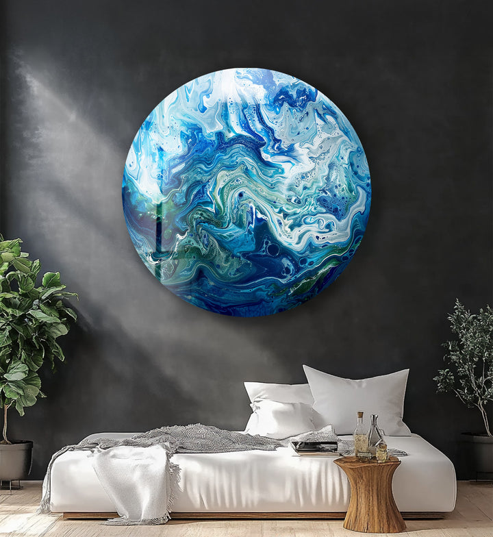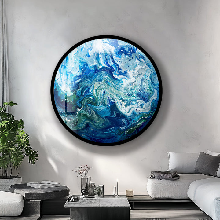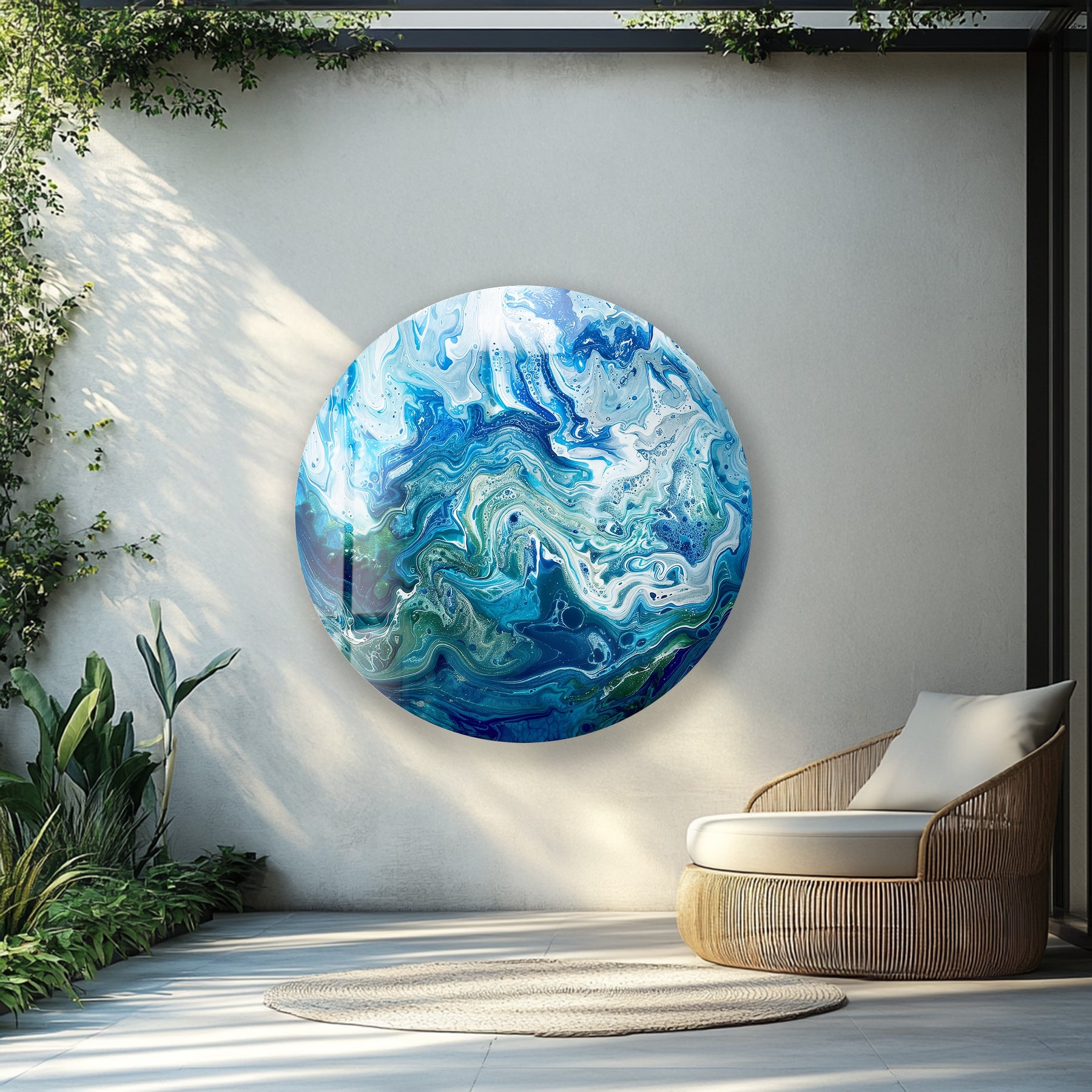 Immerse your space in serenity with the Ocean Veins – Blue Abstract Fluid Round Glass Wall Art, a mesmerizing design inspired by the ever-changing flow of the sea. Swirls of deep blue, turquoise, and white blend seamlessly, mimicking the graceful movement of ocean currents and coastal waves. This piece evokes tranquility, making it a perfect accent for modern, coastal, or minimalist interiors.