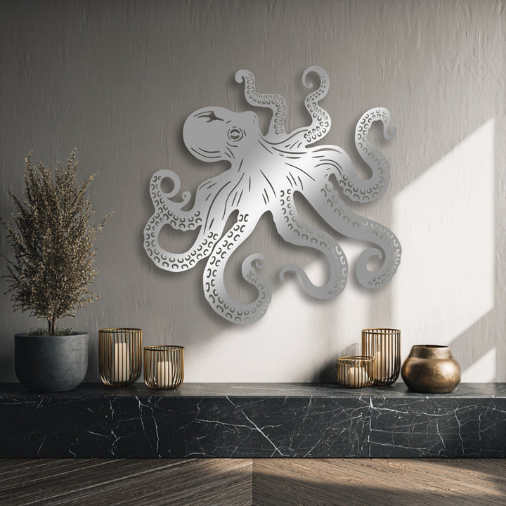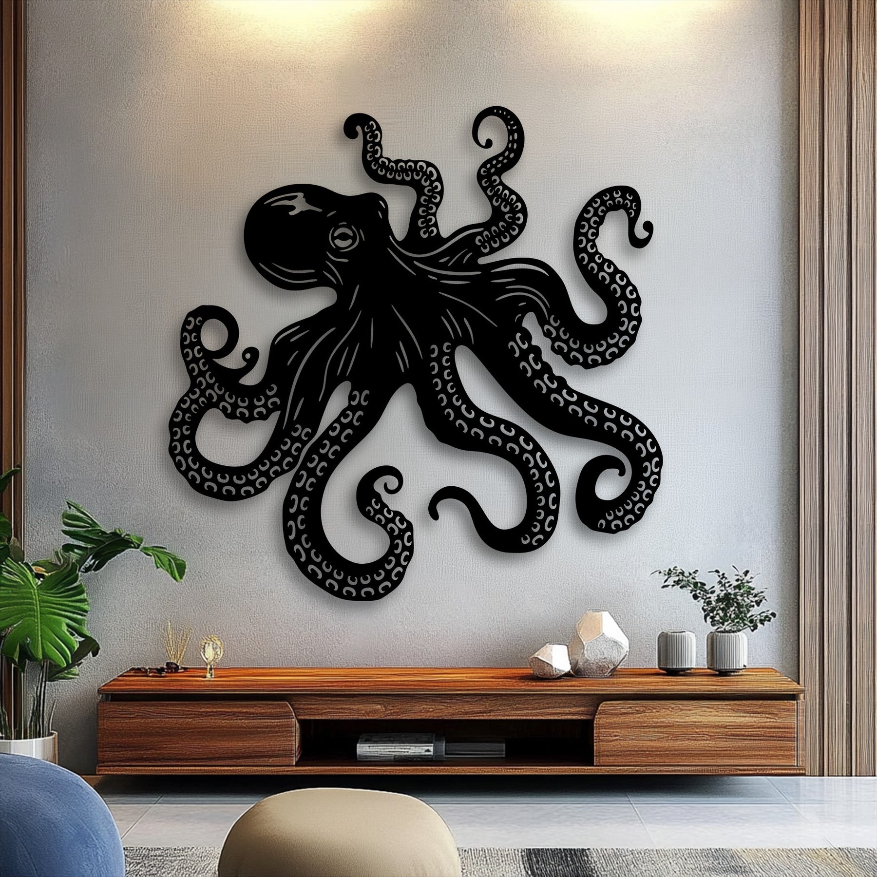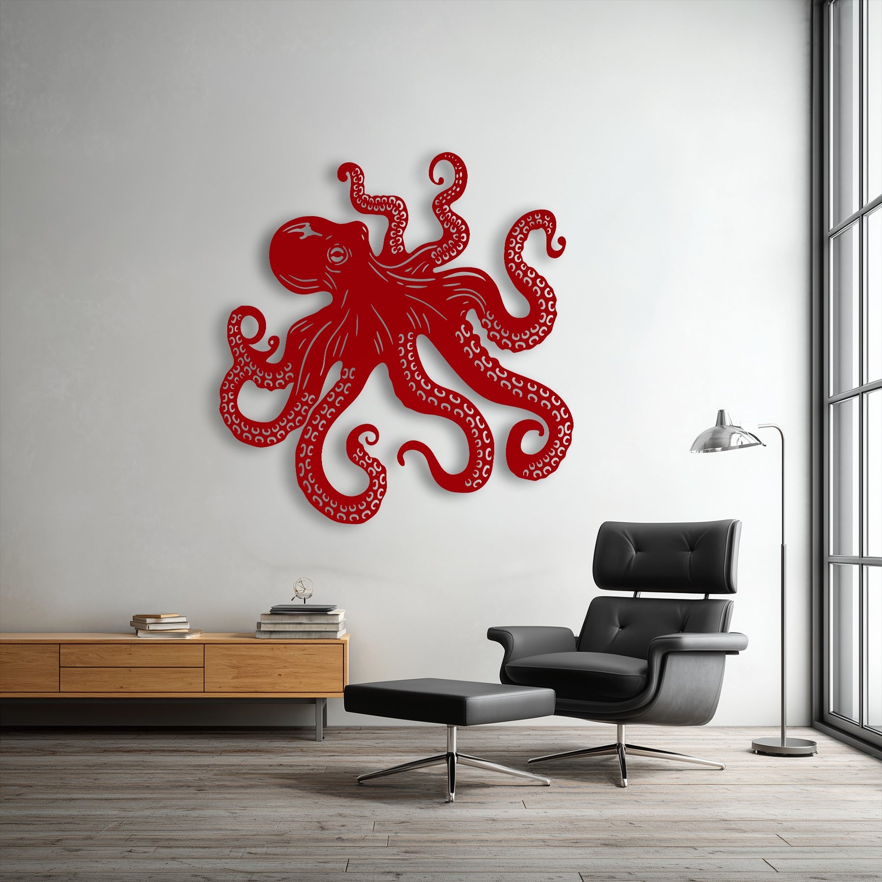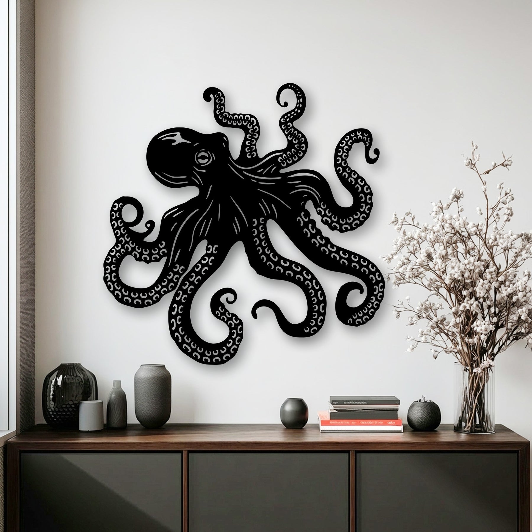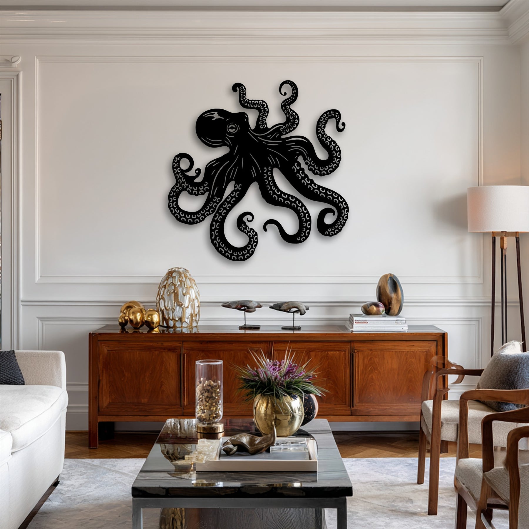 The flowing curves and suction-cup patterns create a sense of movement, as if the octopus is emerging from beneath the surface. Its balanced yet dynamic composition adds a bold artistic statement while maintaining a clean, modern look.