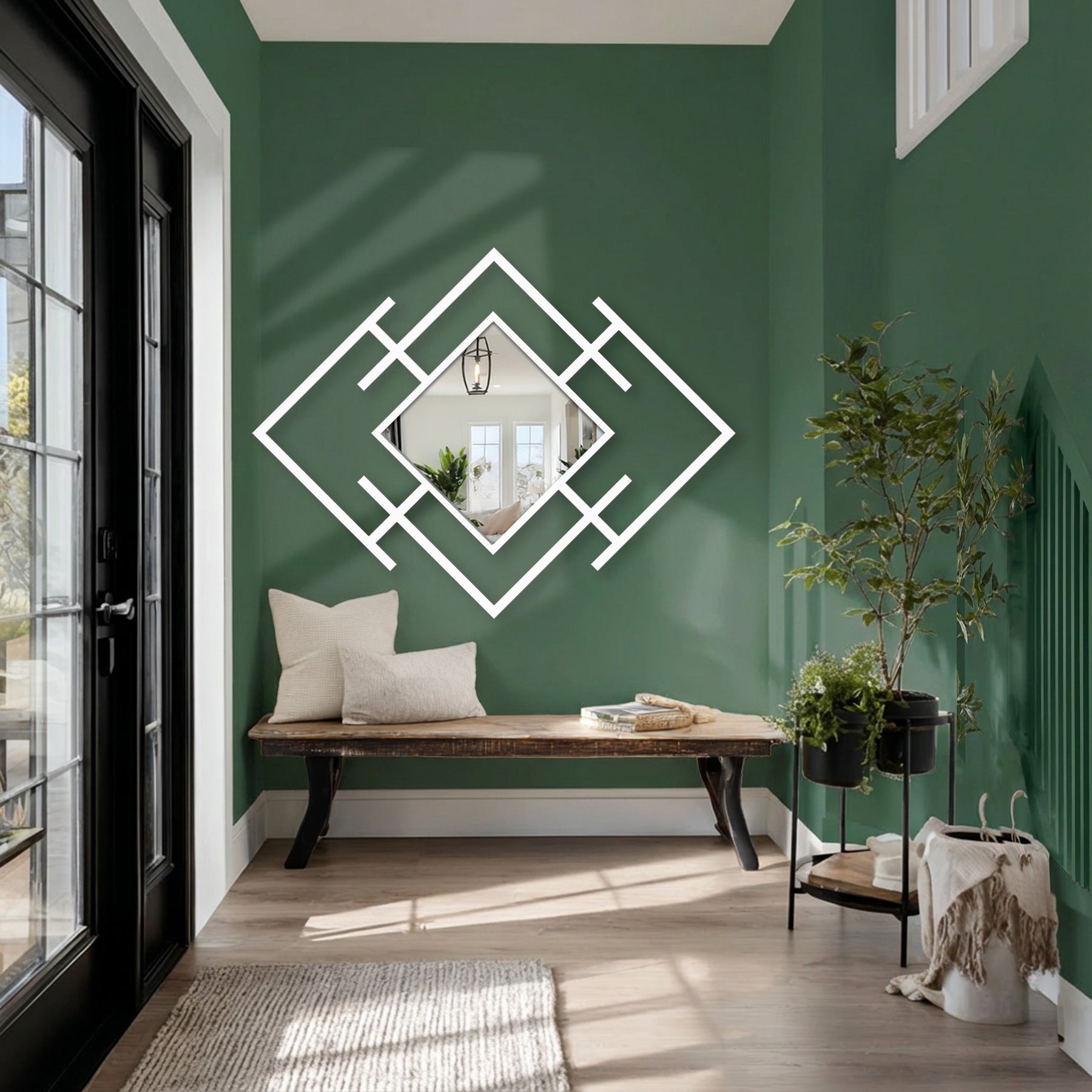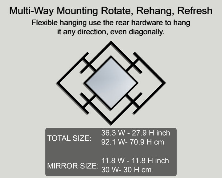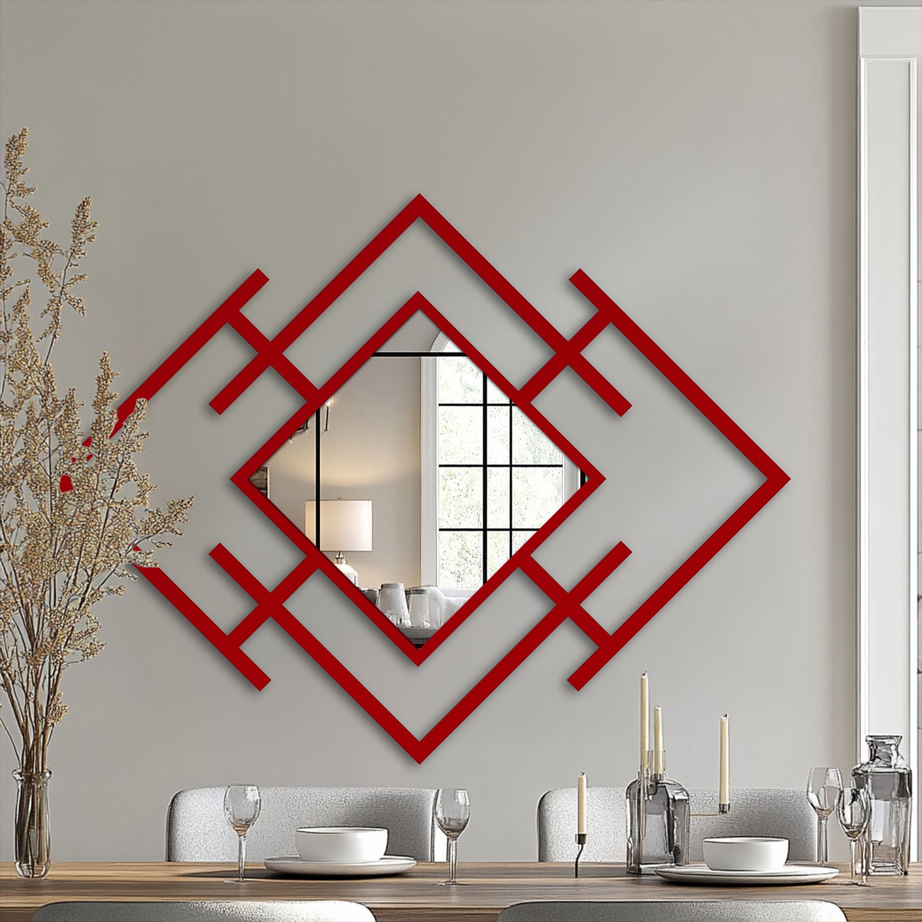 The Rotated Square Layers Geometric Metal Wall Mirror is a striking expression of motion, depth, and modern symmetry. A central square mirror is set within a bold metal frame, intersected by a rotated diamond-shaped structure that creates a layered, architectural composition.