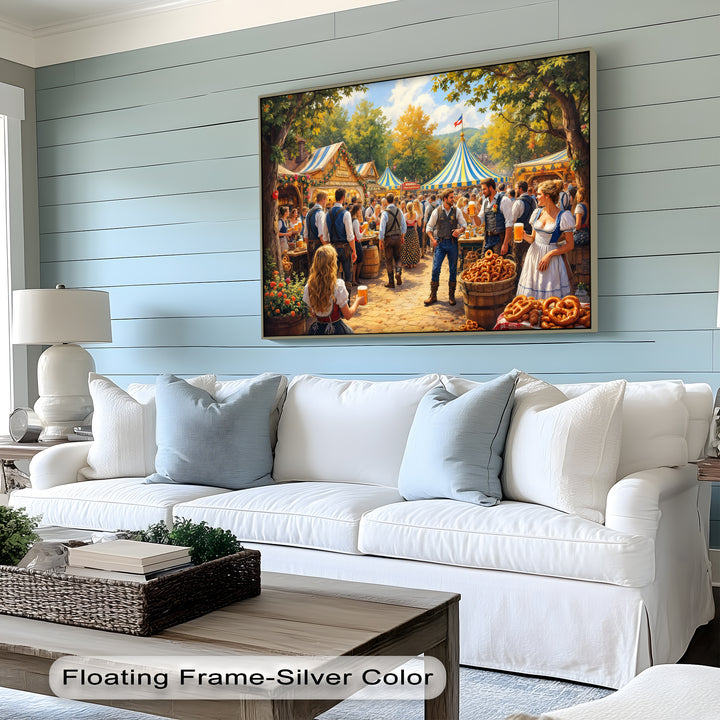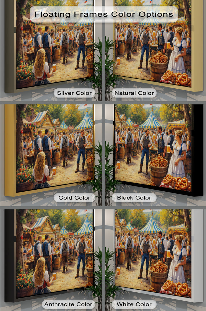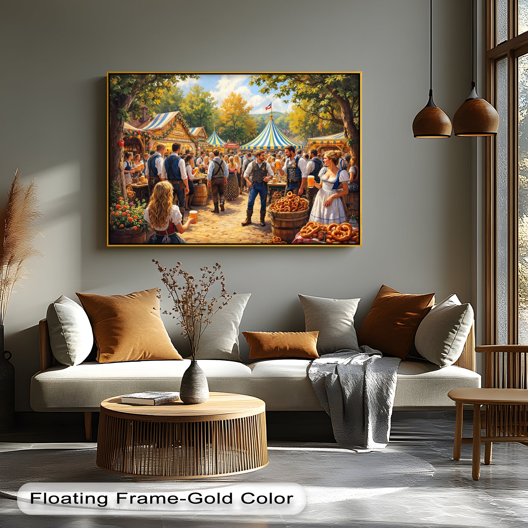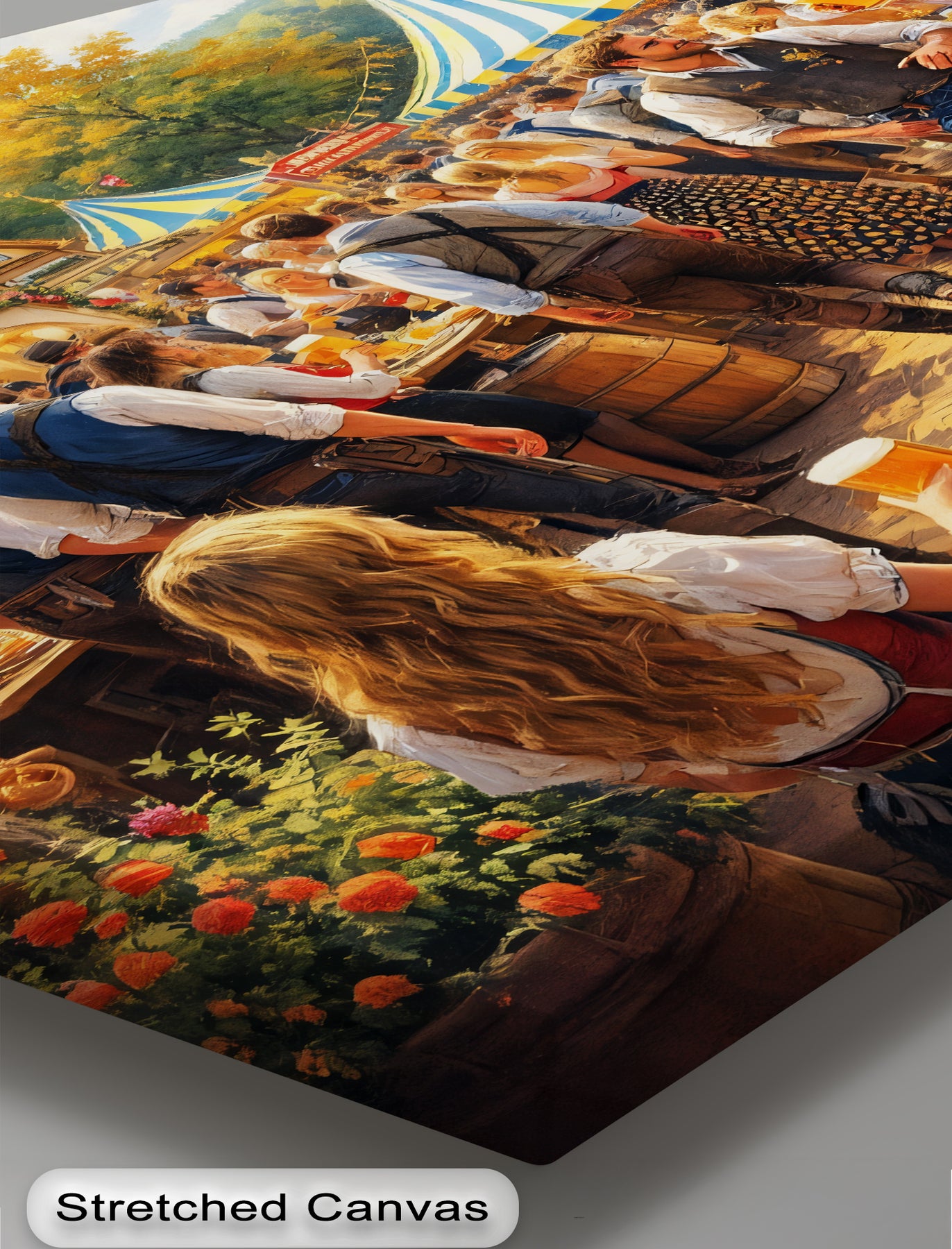 With its vivid details of striped canopies, rustic wooden stalls, and cheerful crowds dressed in lederhosen and dirndls, this artwork is the perfect statement piece for pubs, breweries, kitchens, dining rooms, or beer lovers’ collections. It radiates the joy of community, celebration, and German tradition.