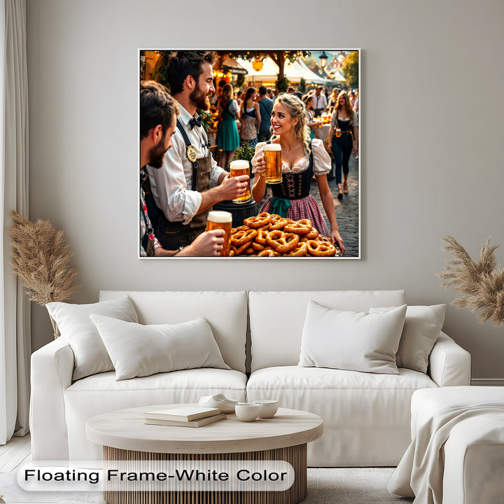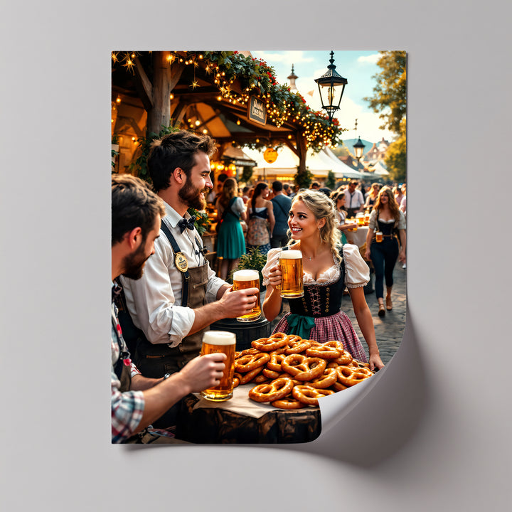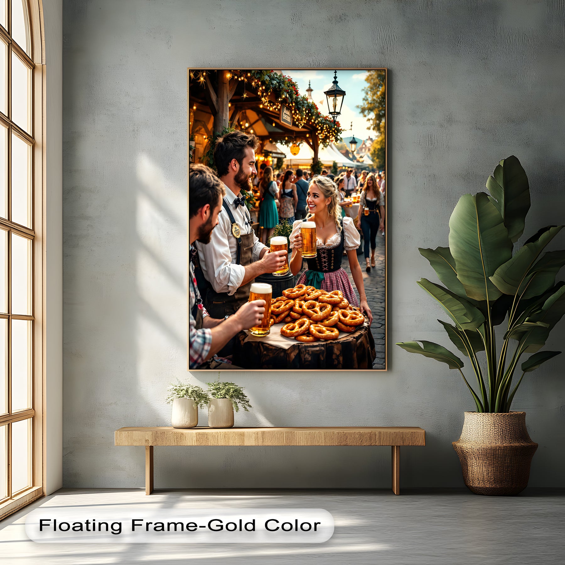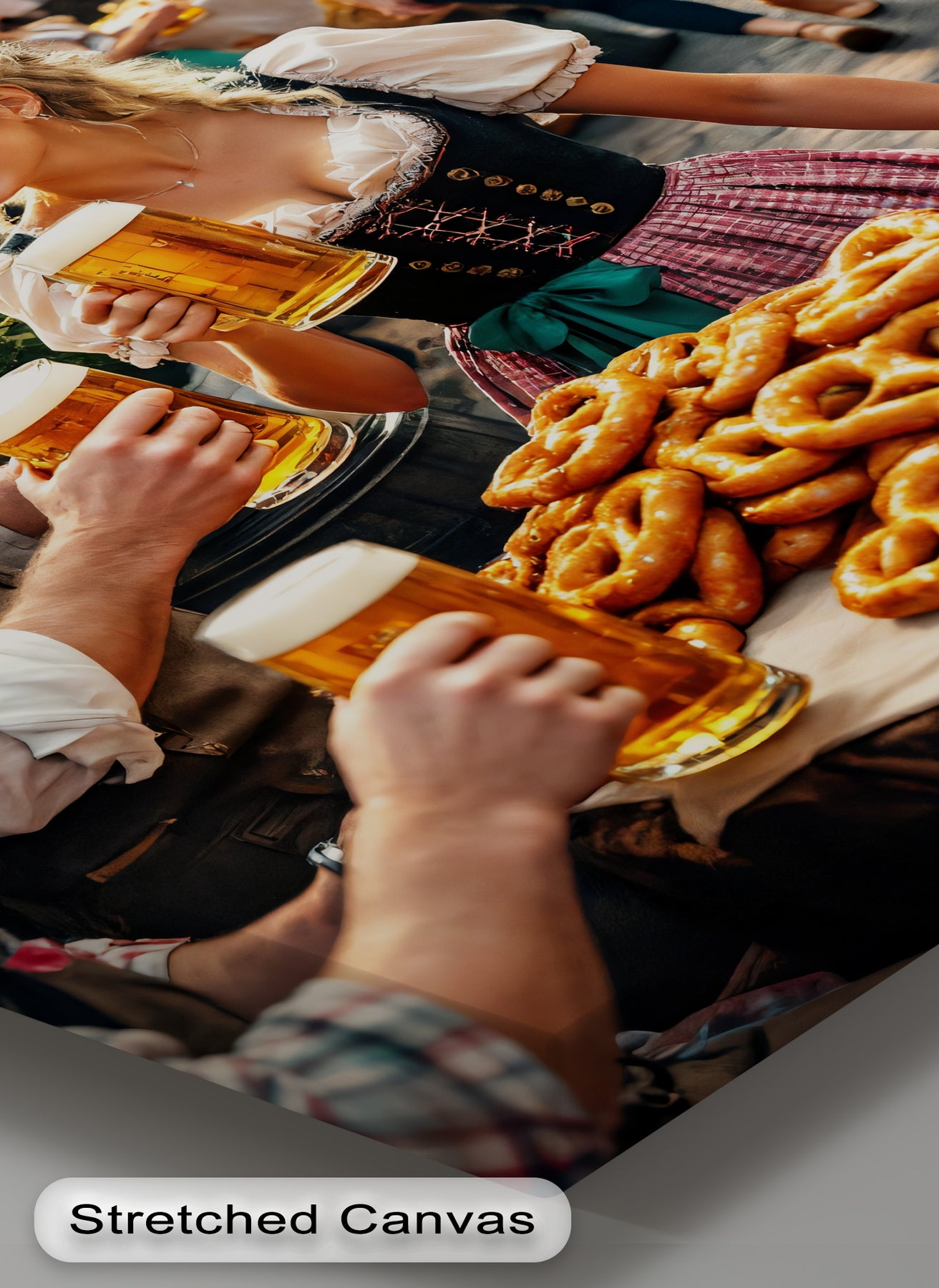 Step into the vibrant spirit of Oktoberfest Celebration, a festive beer and pretzel canvas wall art that captures the joy of Germany’s world-famous festival. Smiling friends raise their beer steins in traditional Bavarian attire, surrounded by glowing lights, wooden stalls, and the aroma of fresh pretzels. This lively artwork brings the essence of festivity, tradition, and community into your space.