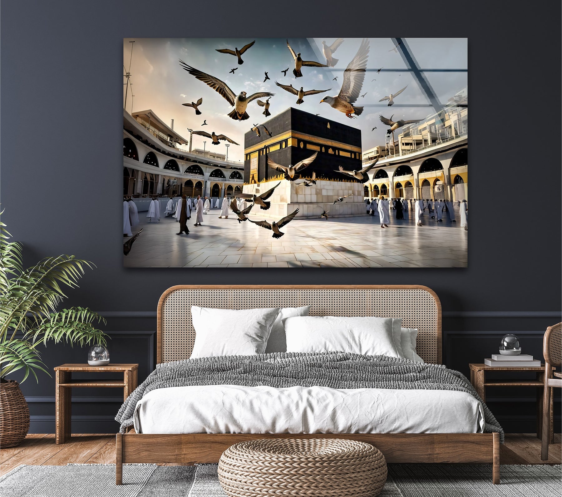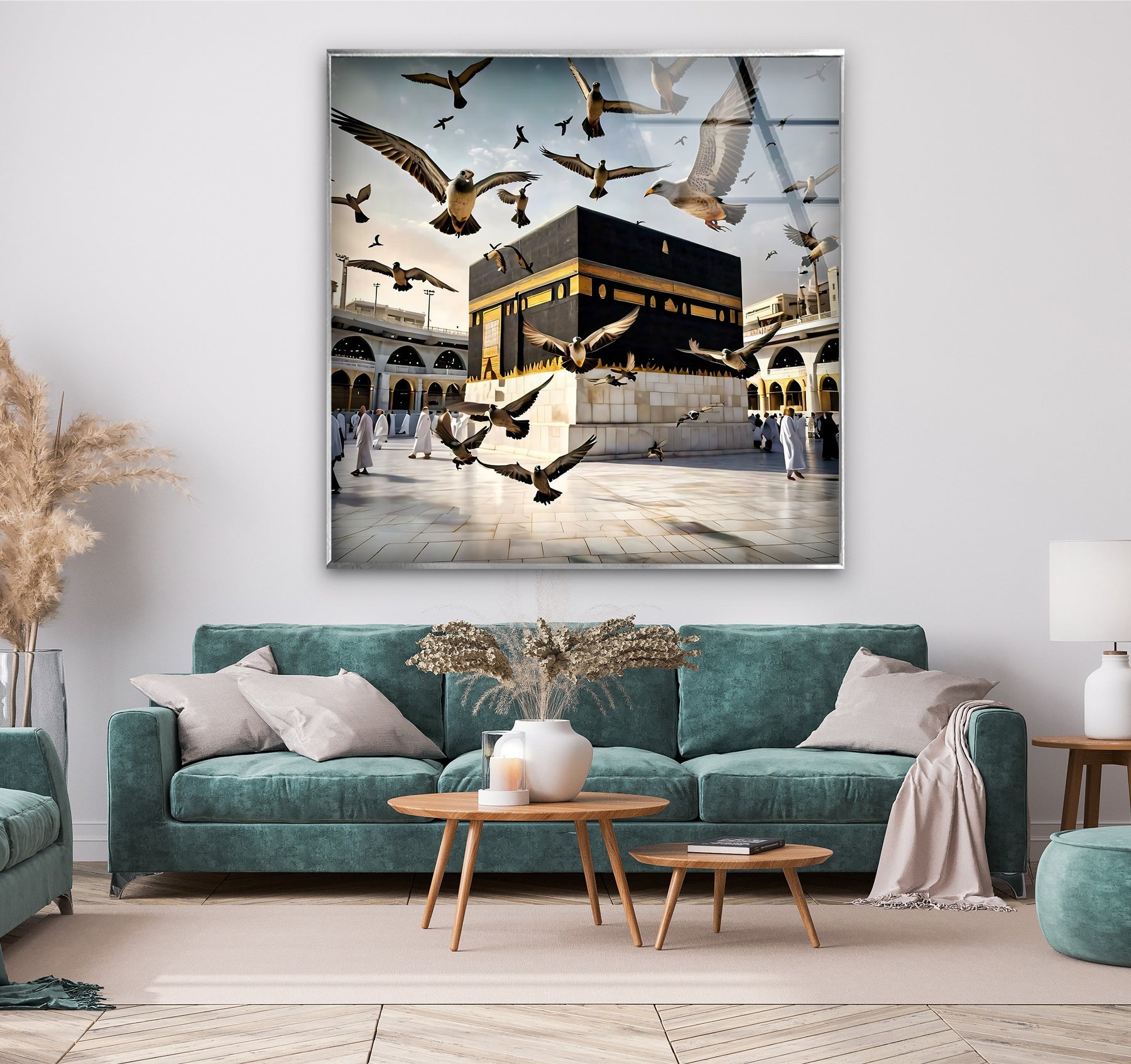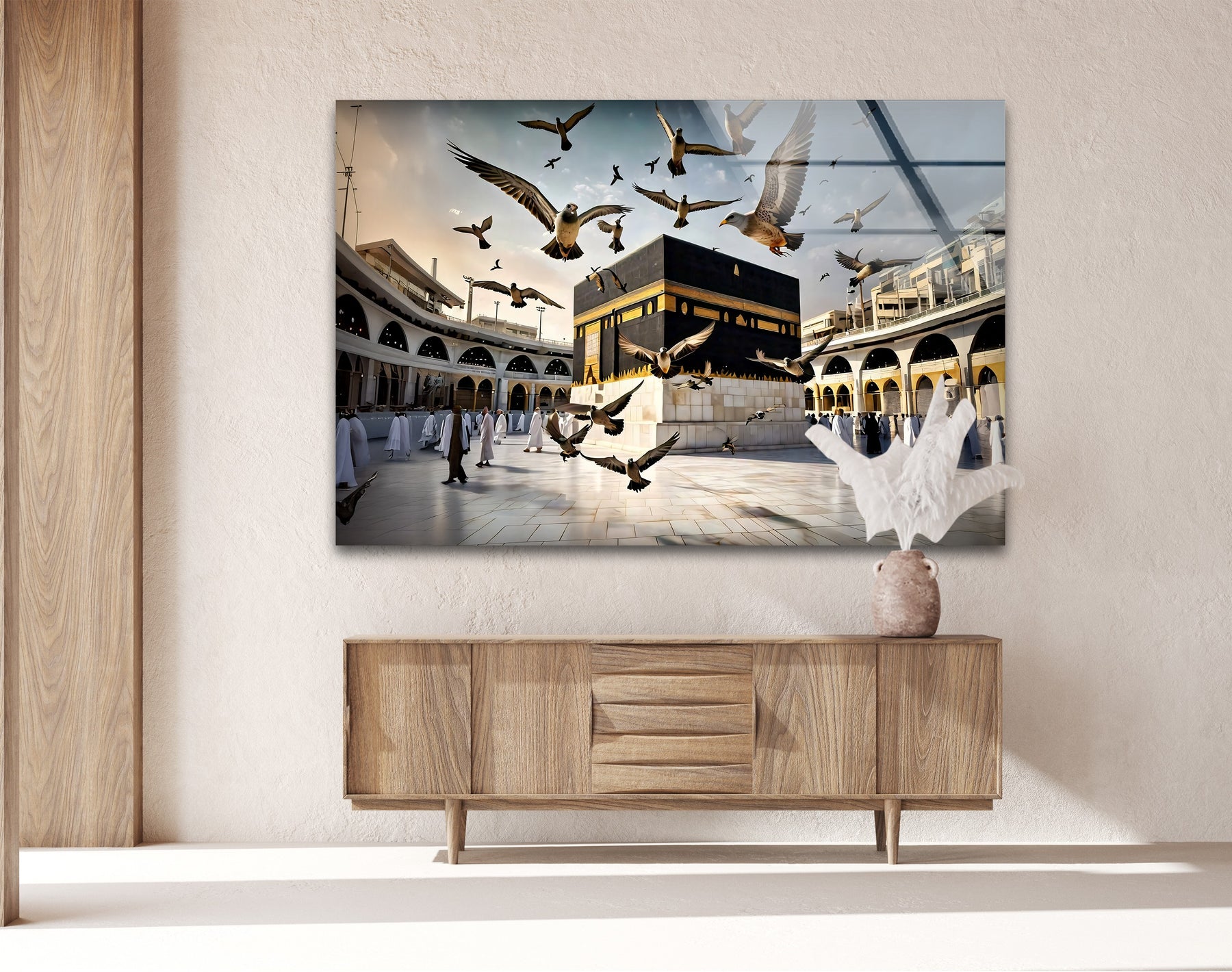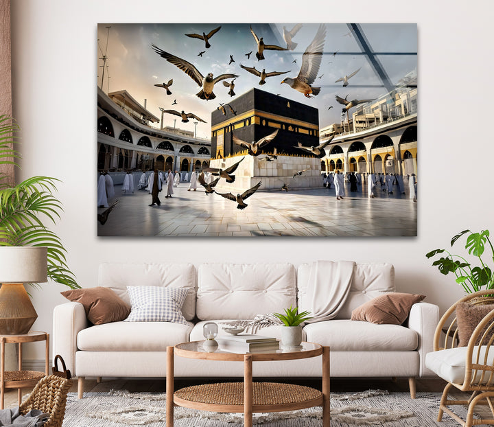 Peaceful Flight – Kaaba with Doves Glass Wall Art