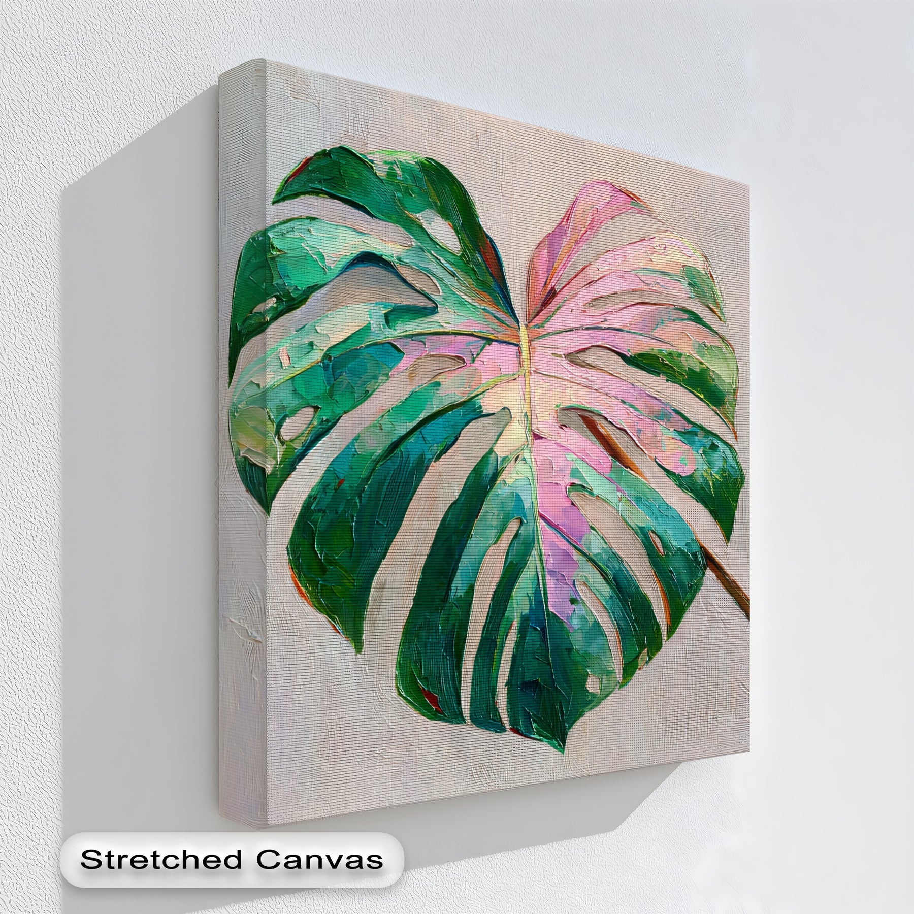The leaf blends lush greens, soft pink tones, and subtle pastel highlights, forming a visually captivating contrast against the neutral textured background. The bold organic shape of the monstera leaf becomes the centerpiece of the artwork, while the thick painterly strokes add depth and a contemporary gallery-style appearance.
