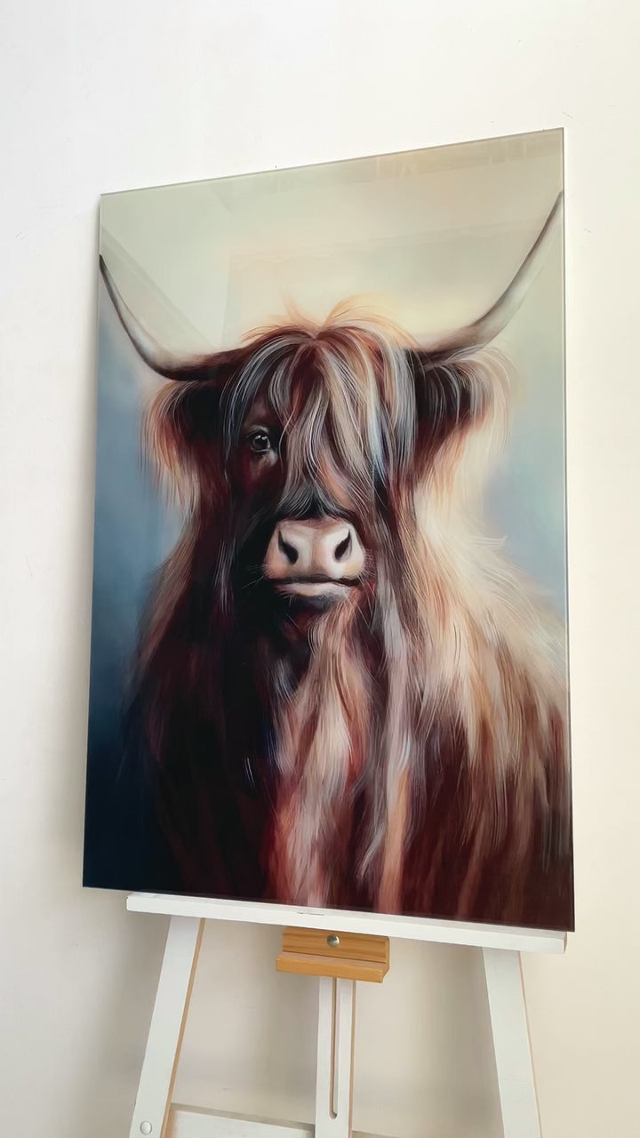 Elevate your home decor with this striking Portrait of Bull animal painting, beautifully displayed on glass wall art. The highland bull's powerful yet calm demeanor is captured in exquisite detail, offering a perfect blend of rustic charm and modern sophistication. Ideal for creating a focal point in any room, this piece brings warmth and personality to your space while showcasing a bold, artistic statement.