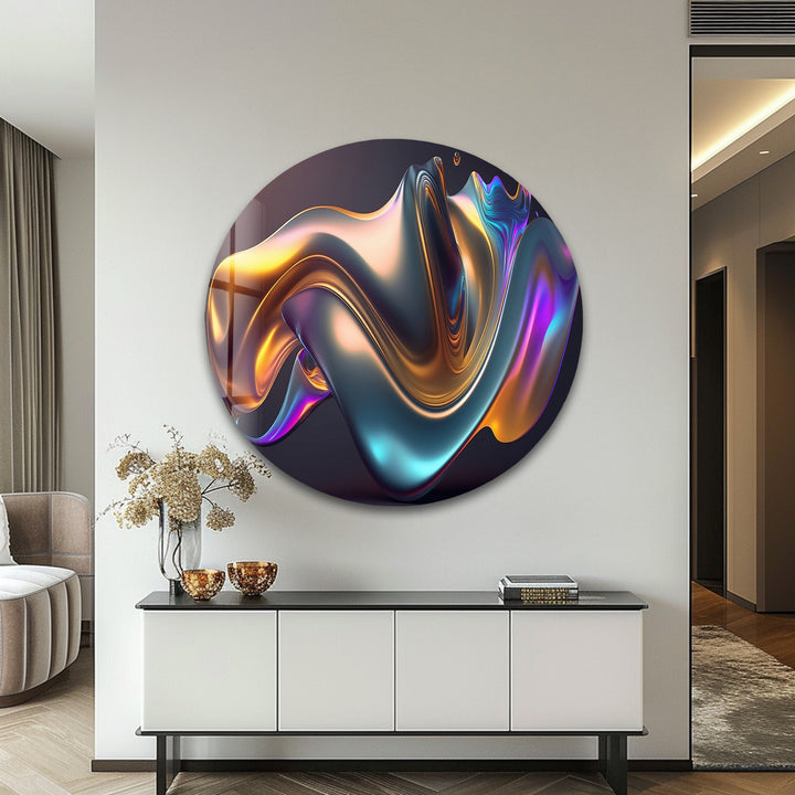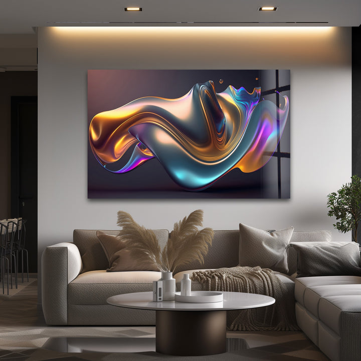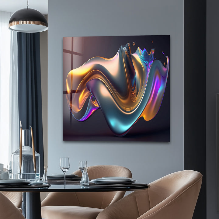Add vibrant motion and futuristic elegance to your interior with Prismatic Flow Mirage – Iridescent Chrome Wave Glass Wall Art. This captivating artwork features a smooth, floating metallic form illuminated by shifting hues of teal, violet, magenta, amber, and electric gold. The fluid chrome texture feels alive—full of movement, depth, and glossy dimensionality—perfect for bold modern spaces that embrace artistic expression.