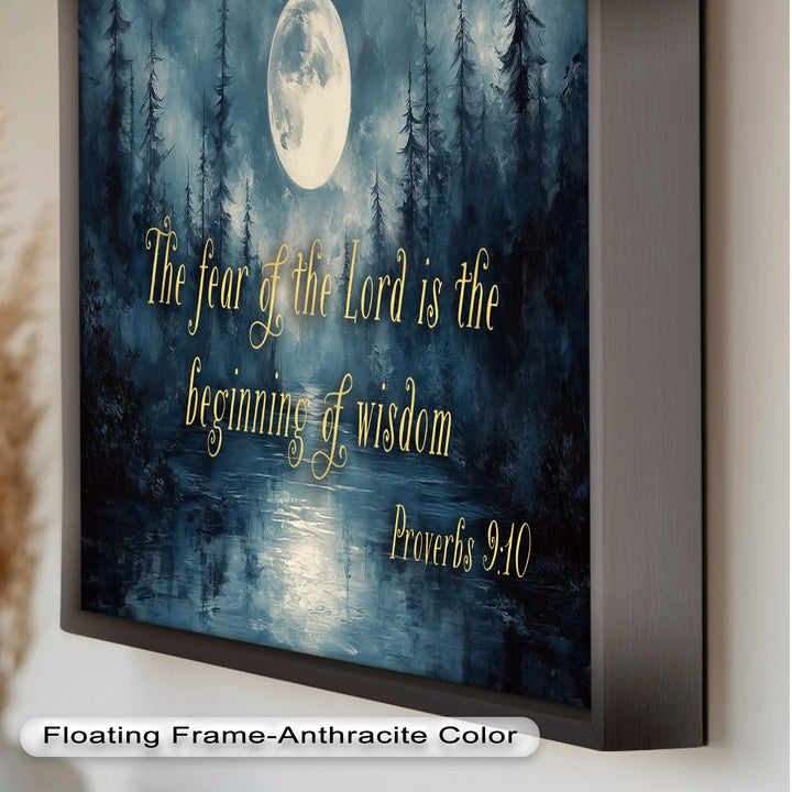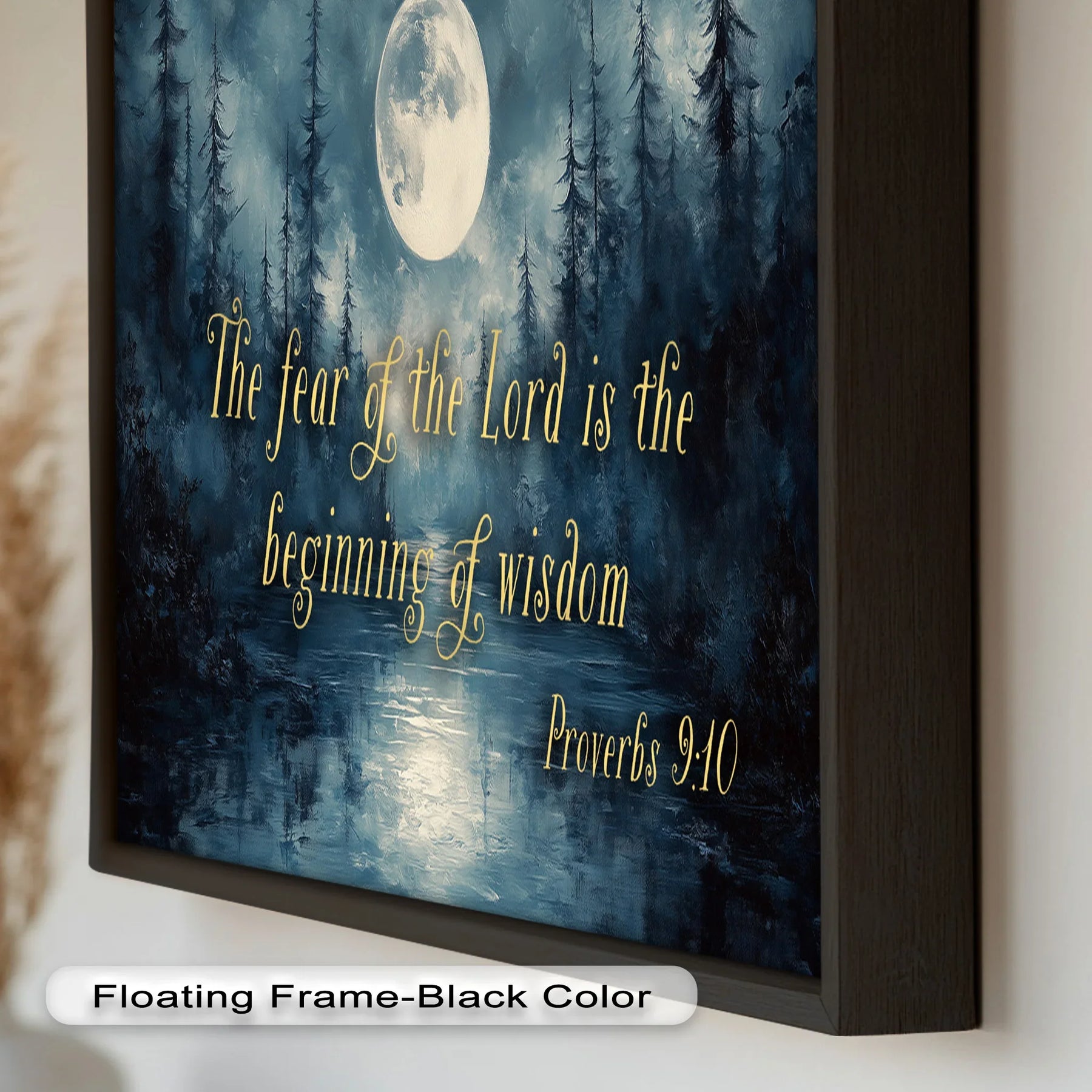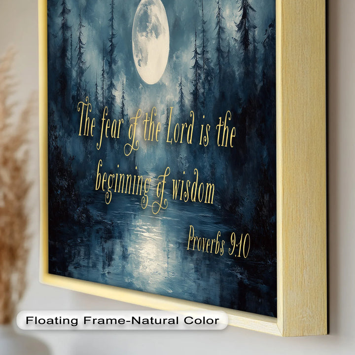 Transform your space with this Bible verse wall art, featuring the timeless wisdom of Proverbs 9:10: "The fear of the Lord is the beginning of wisdom." This Scripture wall art showcases a stunning moonlit forest scene, painted with deep blues and soft highlights, creating a peaceful yet thought-provoking atmosphere.