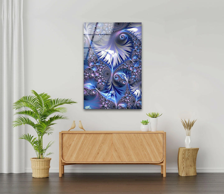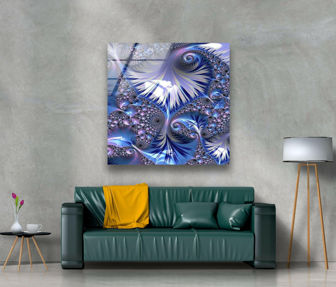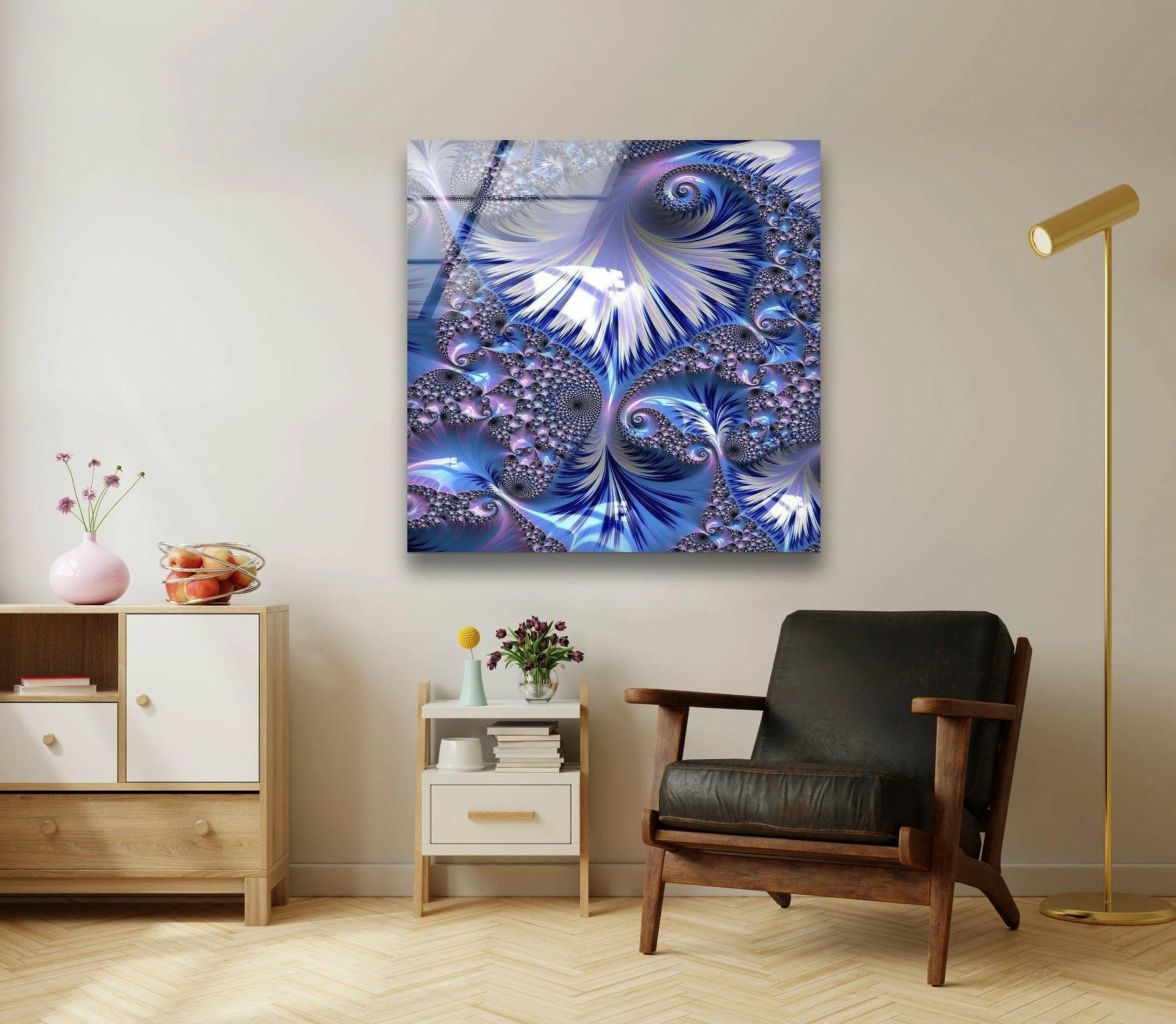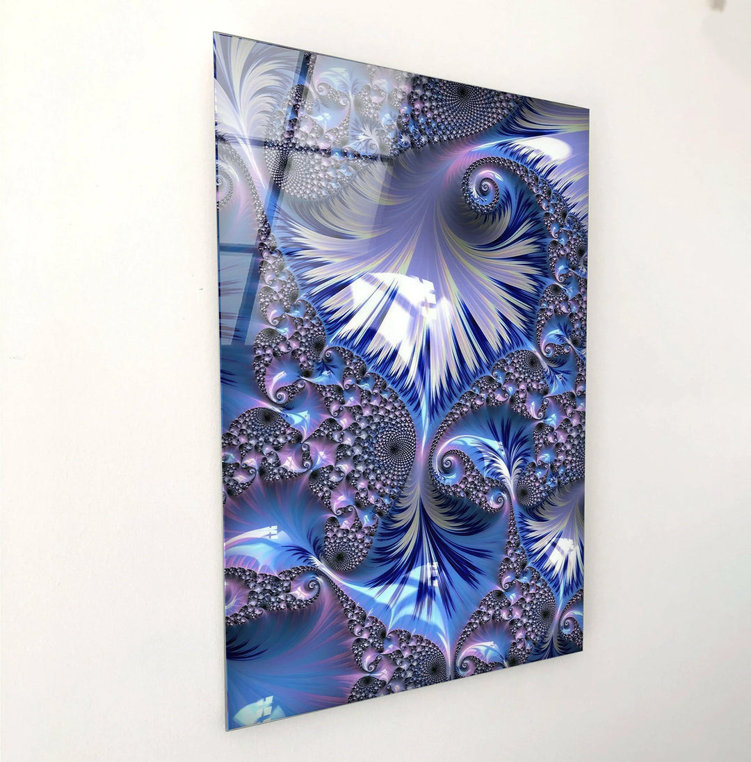 Transform your living space with the Purple Fractal Swirl Glass Wall Art. This stunning piece combines hypnotic swirls, intricate fractal details, and vibrant shades of purple and blue, creating a visually captivating statement.