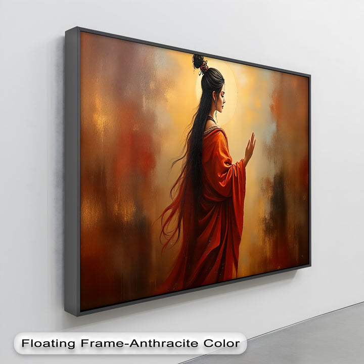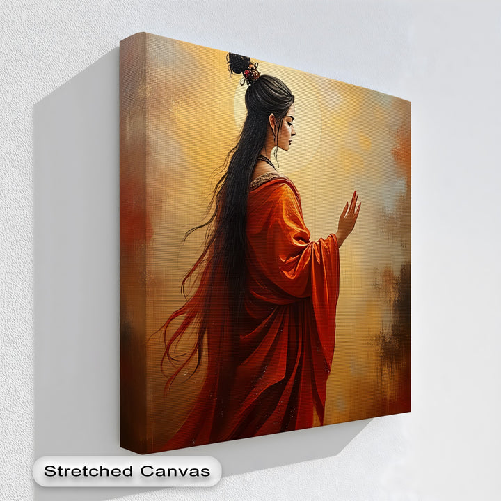 Radiant Serenity – Oriental Woman in Red Canvas Wall Art portrays a graceful woman draped in flowing crimson robes, her delicate posture illuminated by a golden halo-like glow. The rich textures and warm palette of reds, golds, and browns evoke a sense of timeless elegance and spiritual calm. Her long, flowing hair and poised gesture add depth and storytelling to the composition, making it both captivating and meditative.