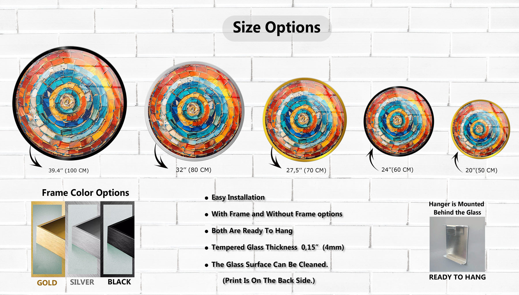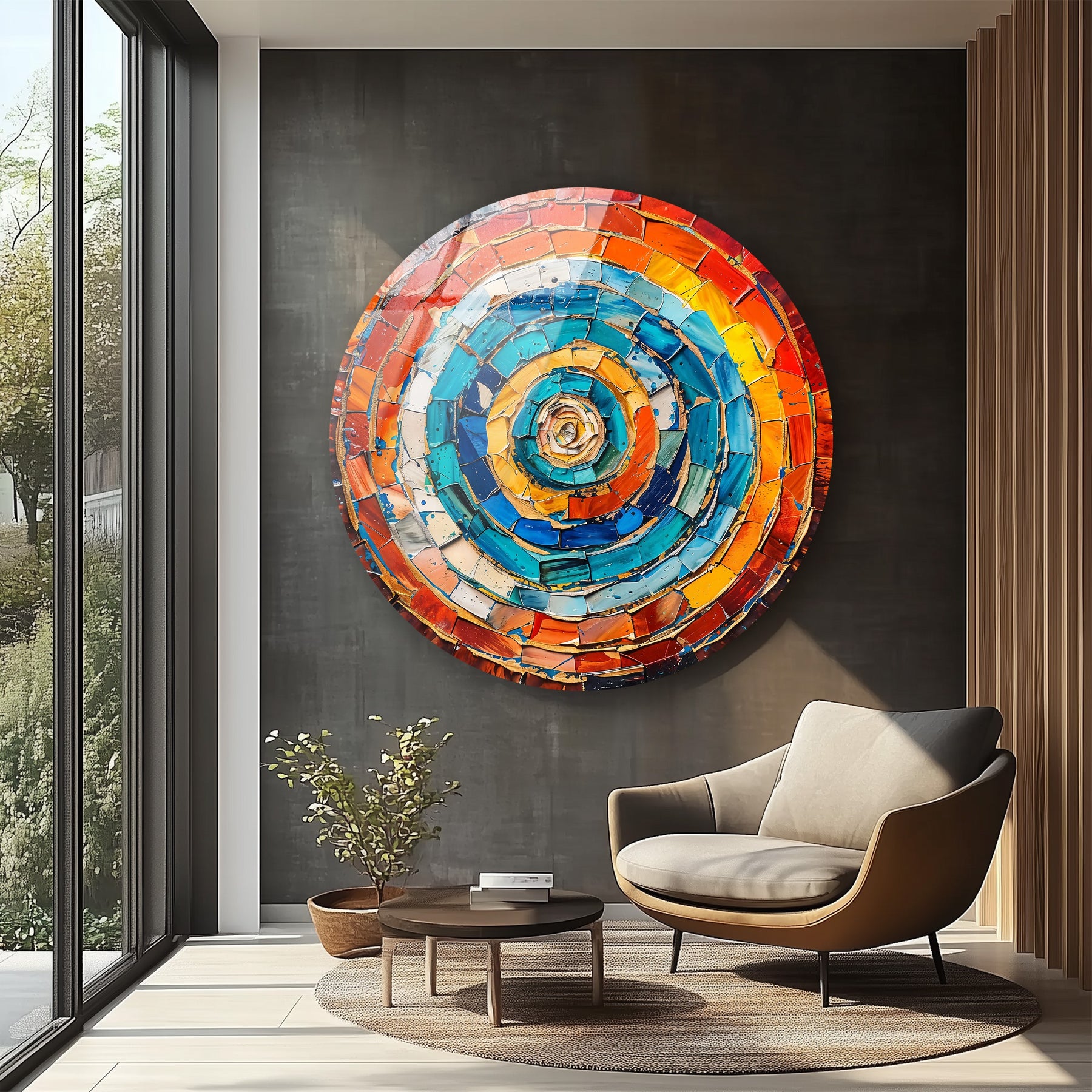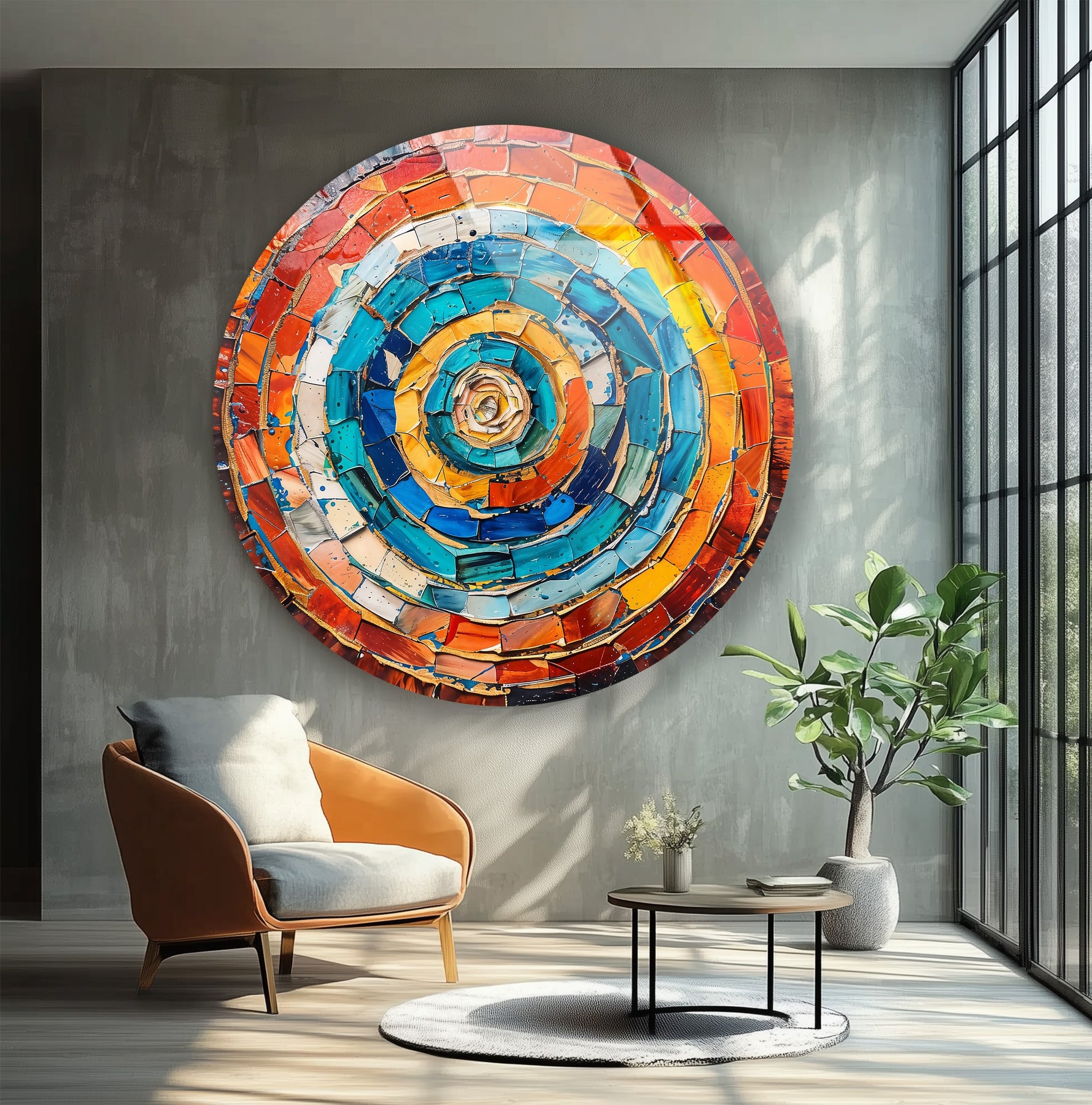 Energize your living space with the Radiant Vortex – Abstract Circular Mosaic Round Glass Wall Art. This dynamic artwork captures the essence of motion and balance through concentric layers of vivid glass tiles in shades of orange, blue, yellow, and turquoise. The spiraling mosaic effect draws the eye inward, creating a sense of harmony, depth, and radiant energy that transforms any wall into a modern masterpiece.