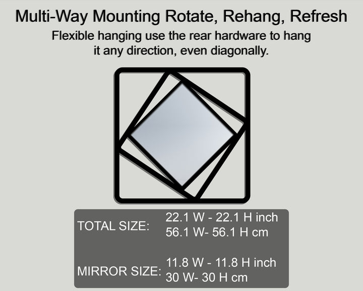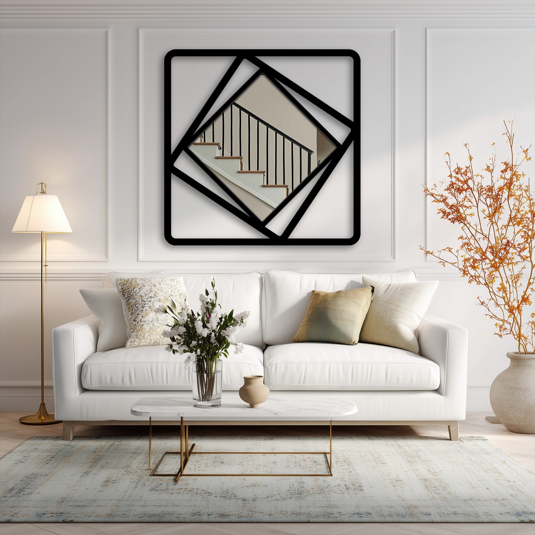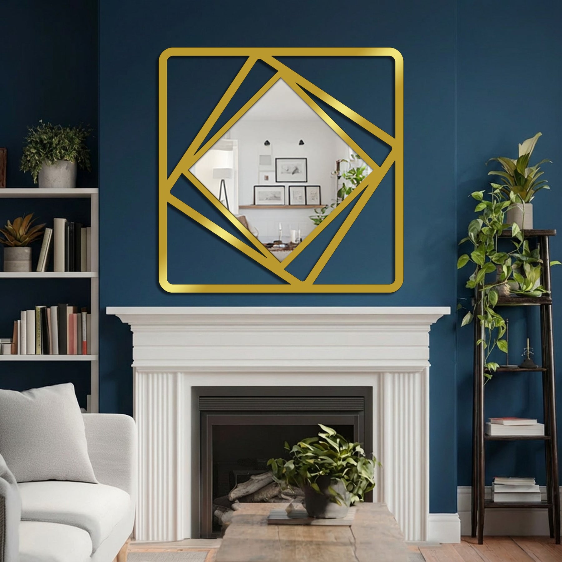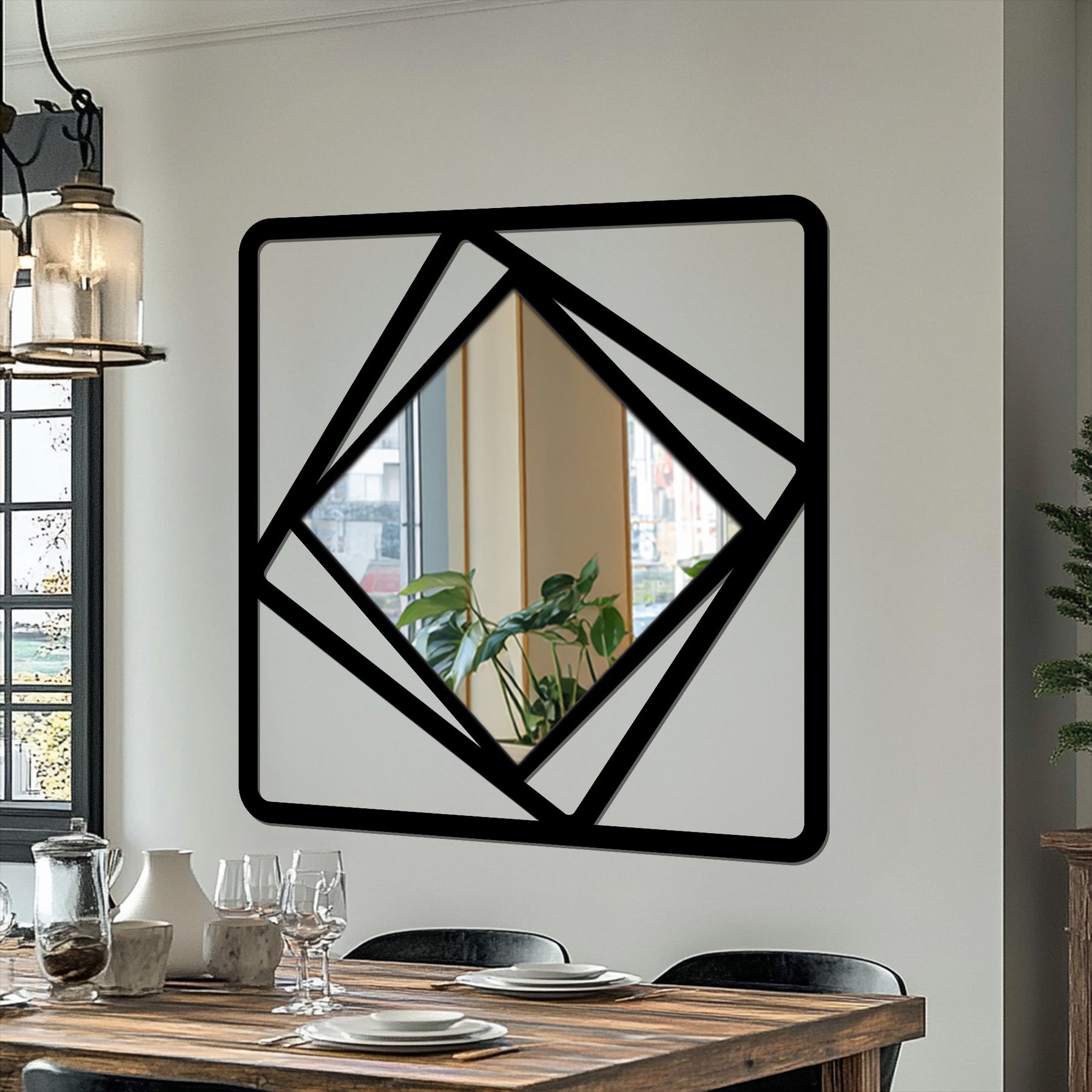 The Rotated Square Layers Geometric Metal Wall Mirror is a striking expression of motion, depth, and modern symmetry. A central square mirror is set within a bold metal frame, intersected by a rotated diamond-shaped structure that creates a layered, architectural composition.