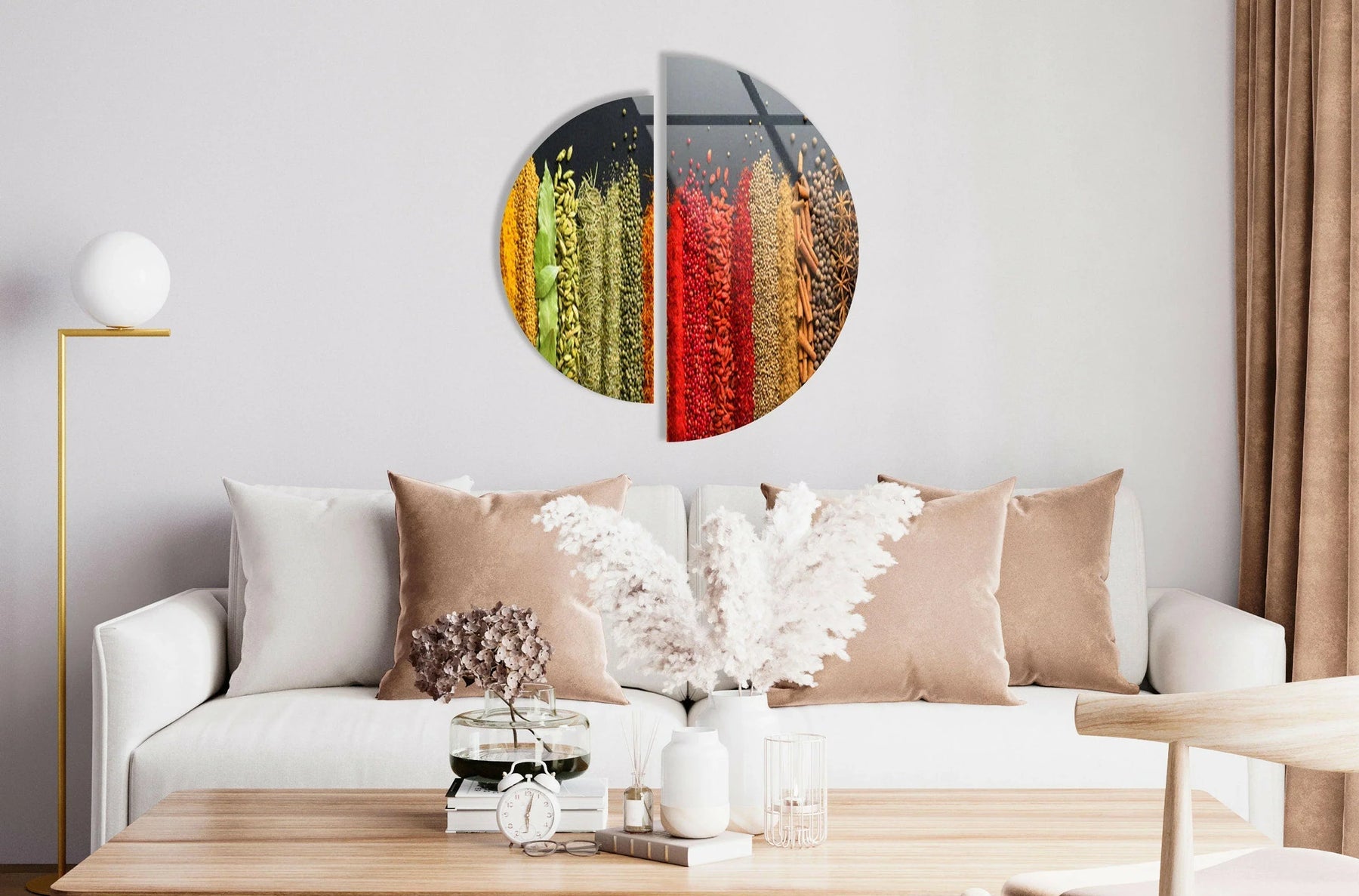 Crafted on tempered glass wall art, the high-definition image bursts with rich reds, greens, and golds, creating a stunning visual that enhances any modern kitchen or dining area. The round split design offers a contemporary flair, making it the perfect centerpiece for food lovers and chefs alike.