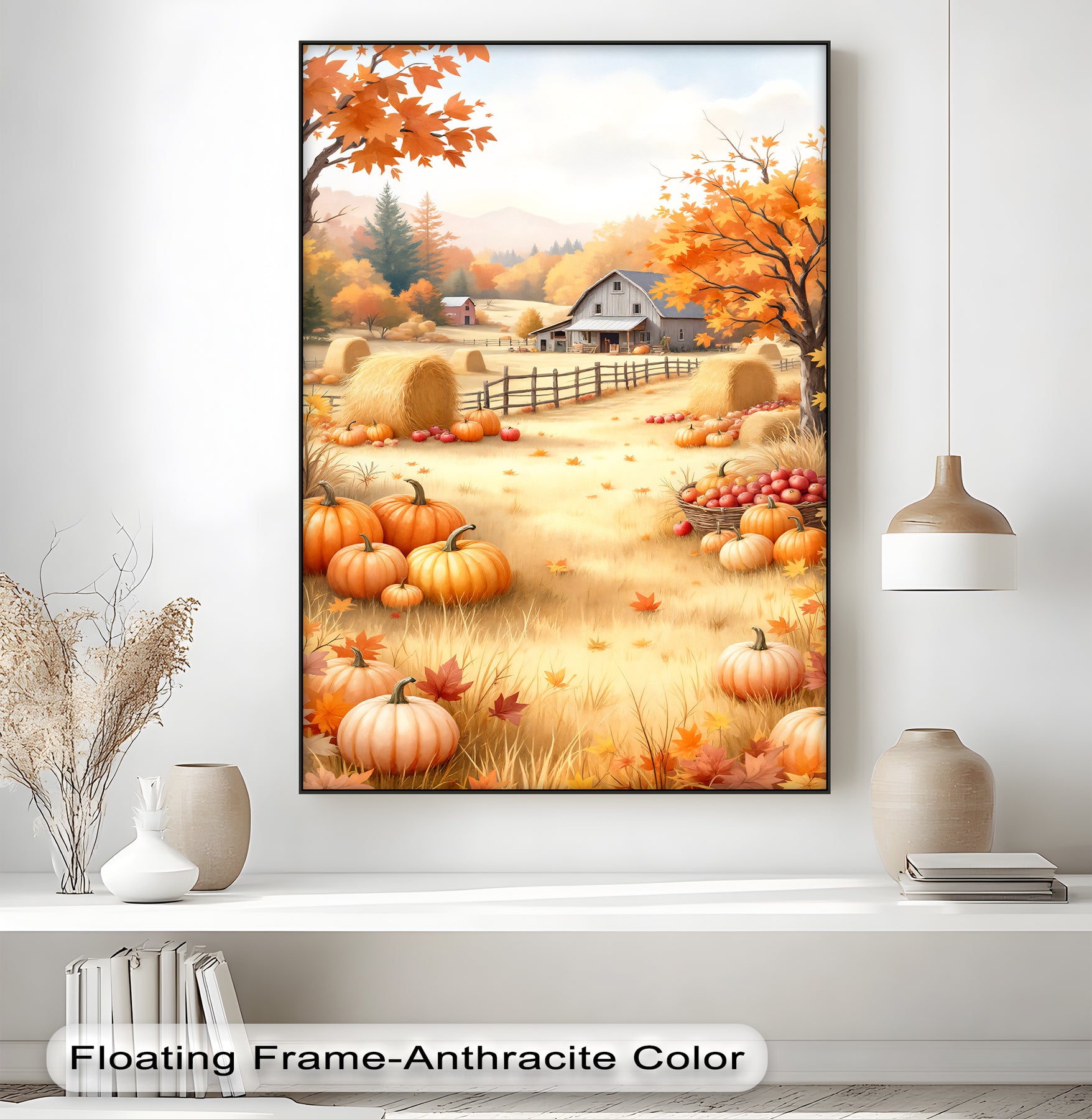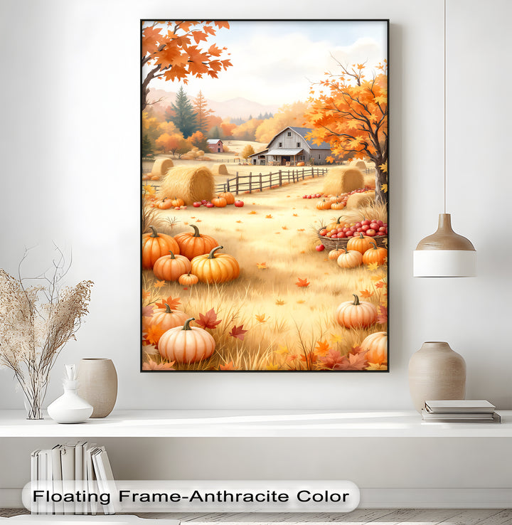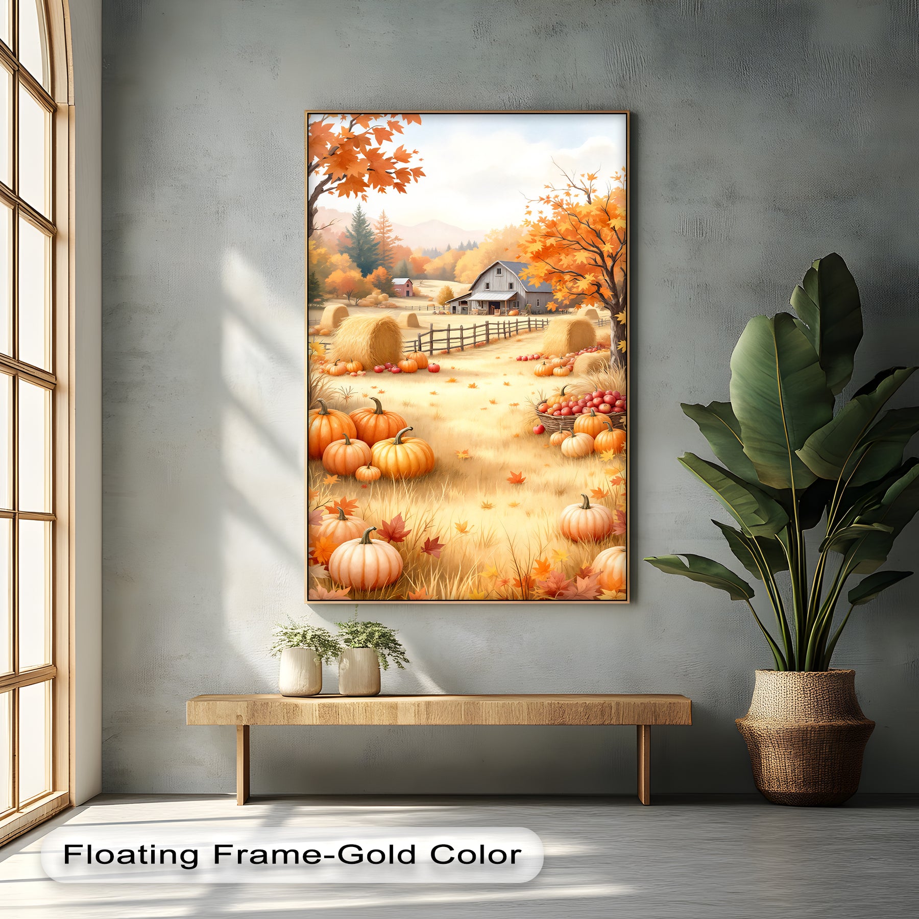 Celebrate the warmth of the harvest season with Golden Harvest Barn, a rustic autumn pumpkin canvas wall art that captures the beauty of fall farm life. A charming gray barn stands among rolling golden fields, framed by glowing orange leaves, hay bales, baskets of apples, and clusters of pumpkins. The tranquil countryside scene radiates cozy farmhouse charm and seasonal nostalgia.