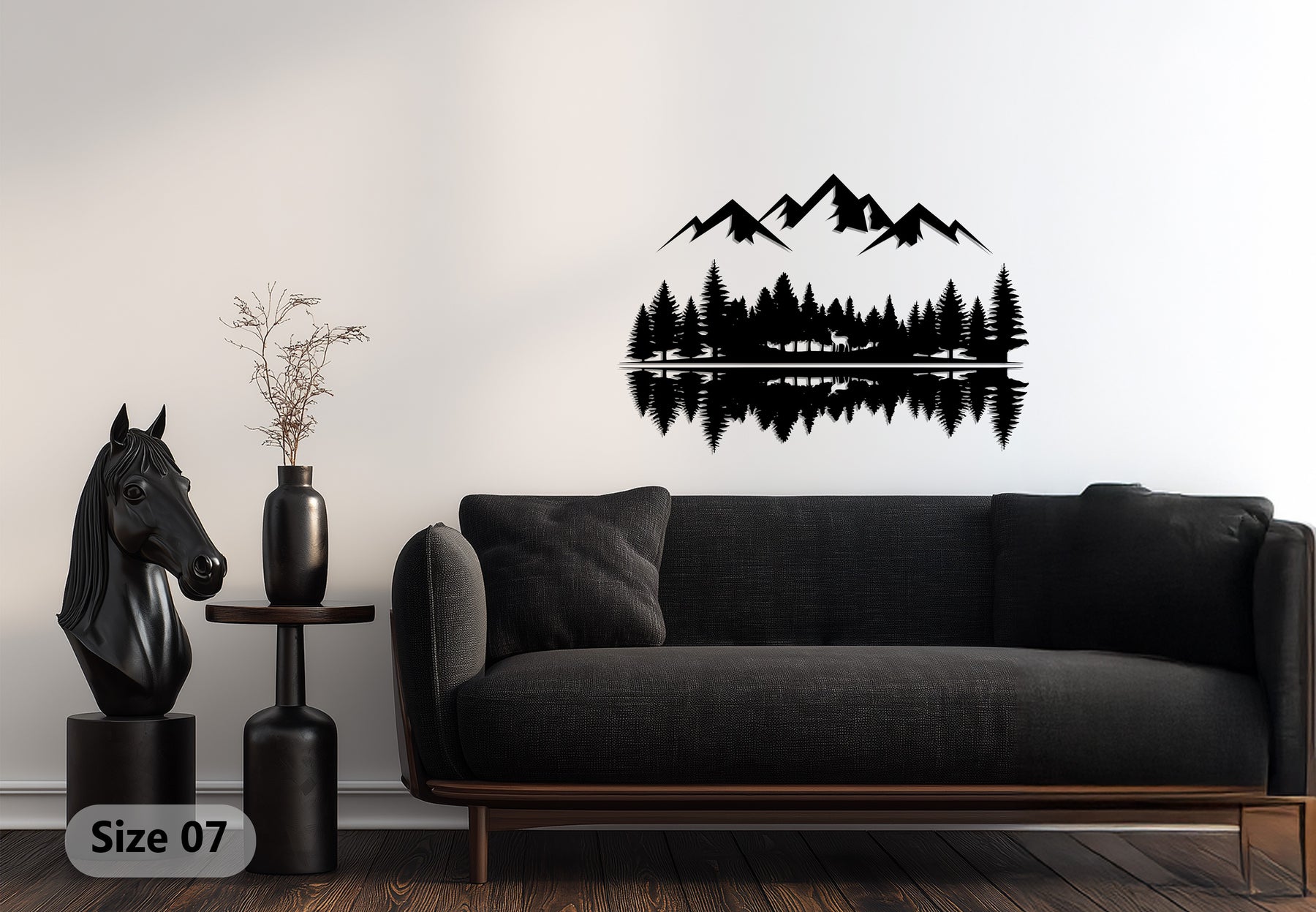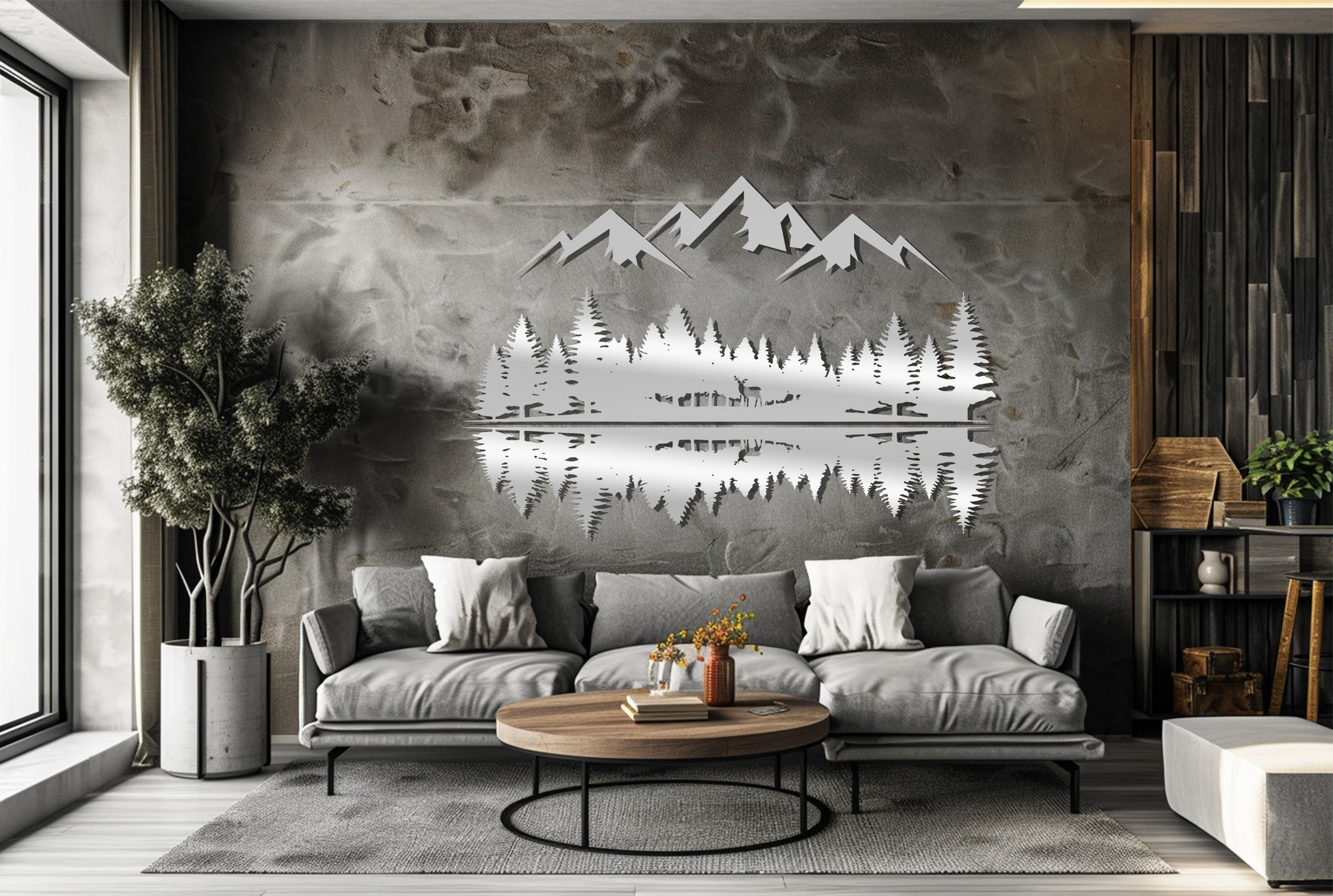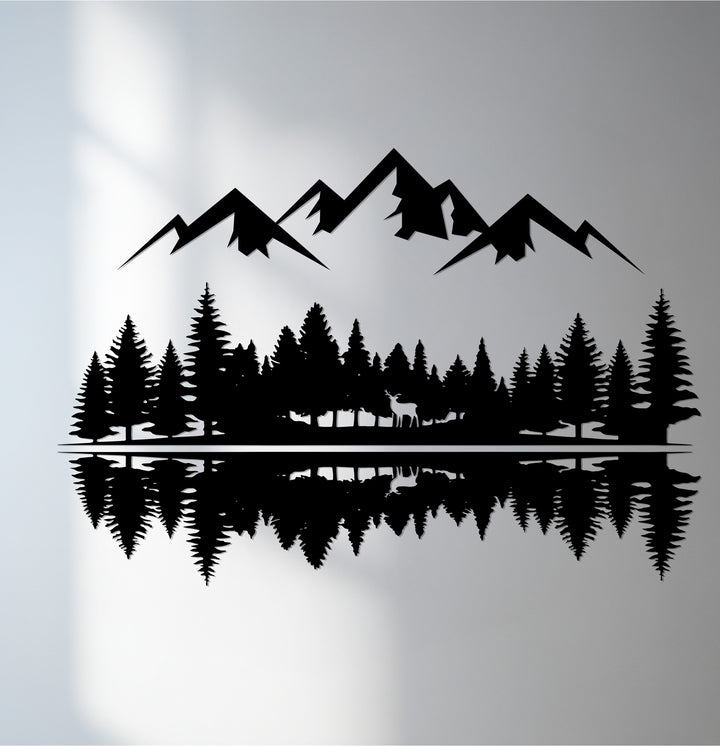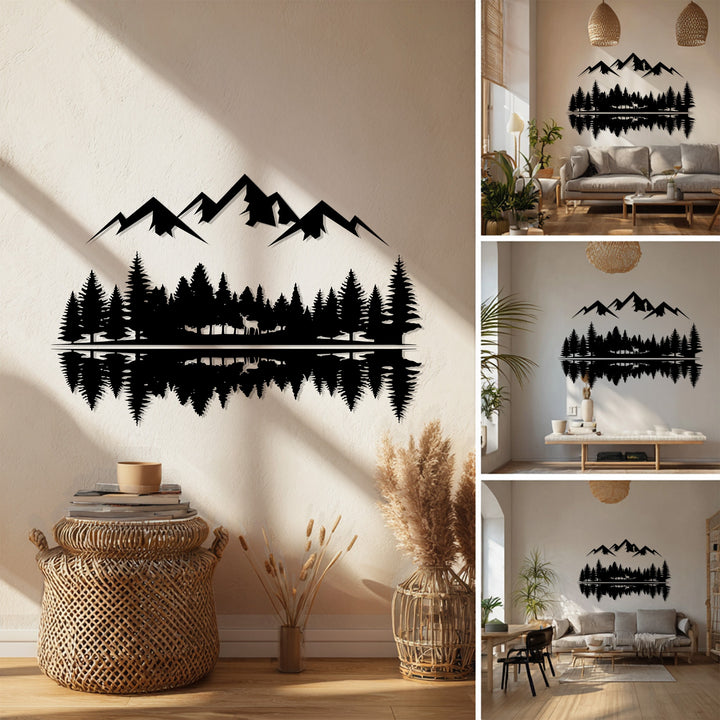 Bring the beauty of the outdoors into your home with the Mountain Forest Metal Wall Art. Featuring majestic mountains, towering pine trees, and a deer standing by a reflective lake, this piece captures the timeless serenity of nature. The mirrored forest silhouette adds depth, making it a striking focal point for any wall.
