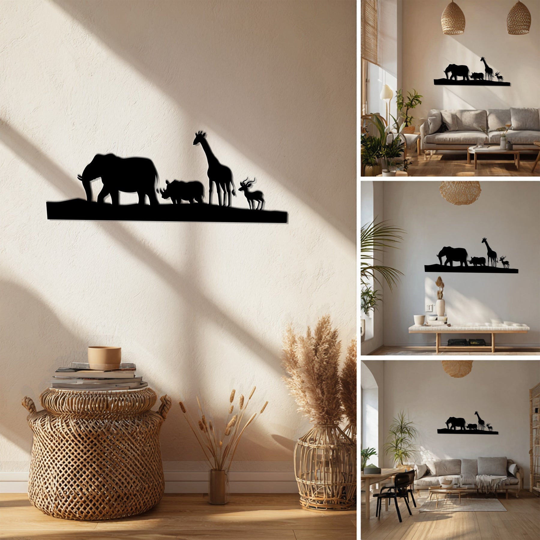 Celebrate the beauty of the wild with the Safari Wildlife Metal Wall Art. This striking piece features bold silhouettes of Africa’s most iconic animals — the powerful elephant, sturdy rhino, elegant giraffe, and graceful antelope — standing together in harmony. Designed in sleek black metal, it captures the raw spirit of the savannah and brings a touch of wilderness adventure into your home.