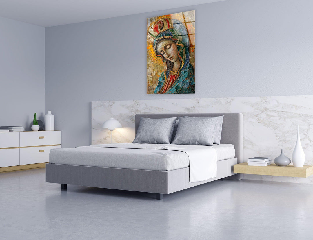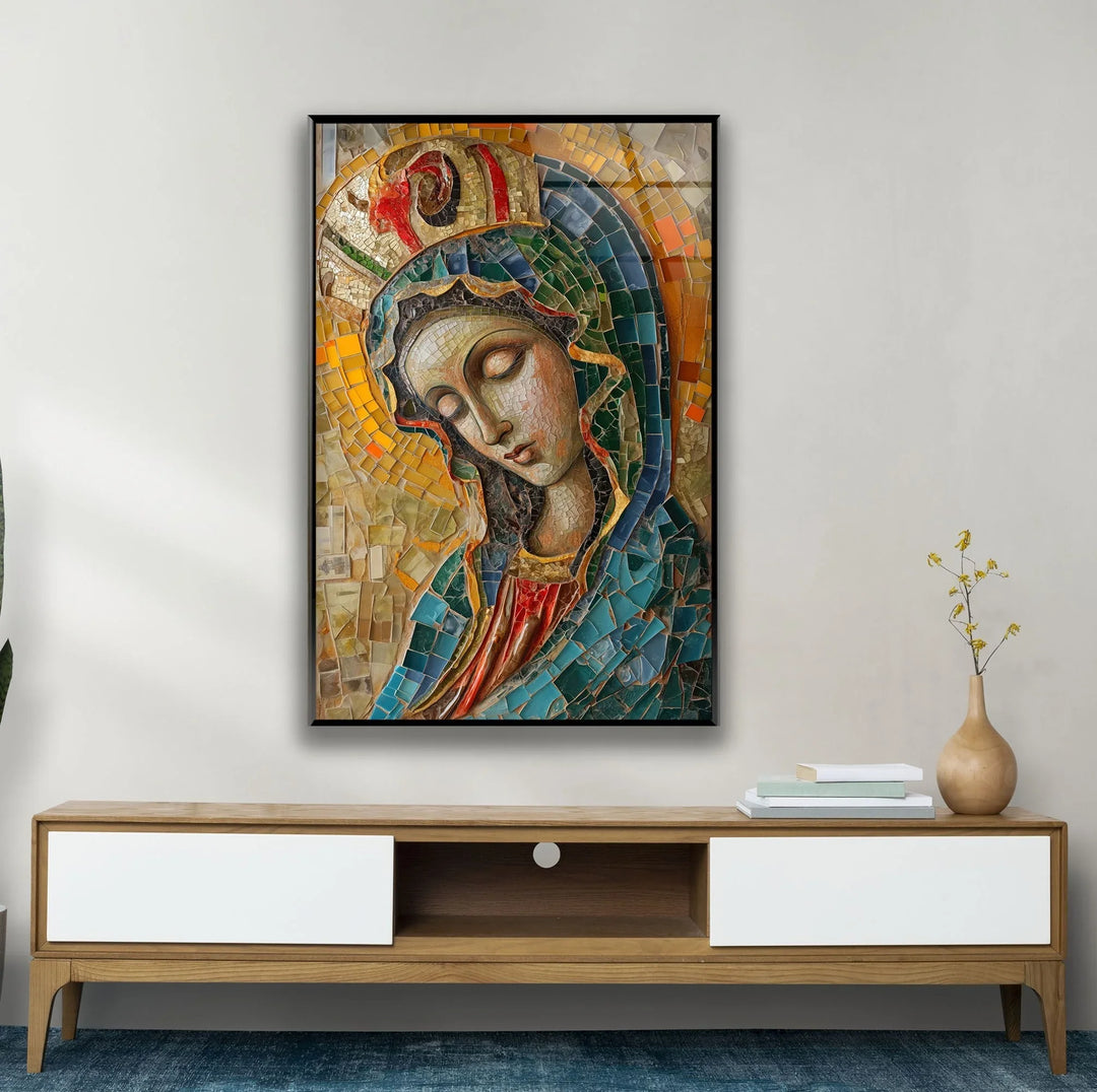 Transform your space with the timeless beauty of Saint Maria With Mosaic Christian paintings, crafted into elegant Glass Wall Art. This breathtaking piece combines vivid mosaic details with the serene depiction of Saint Maria, creating a harmonious blend of spirituality and artistry.