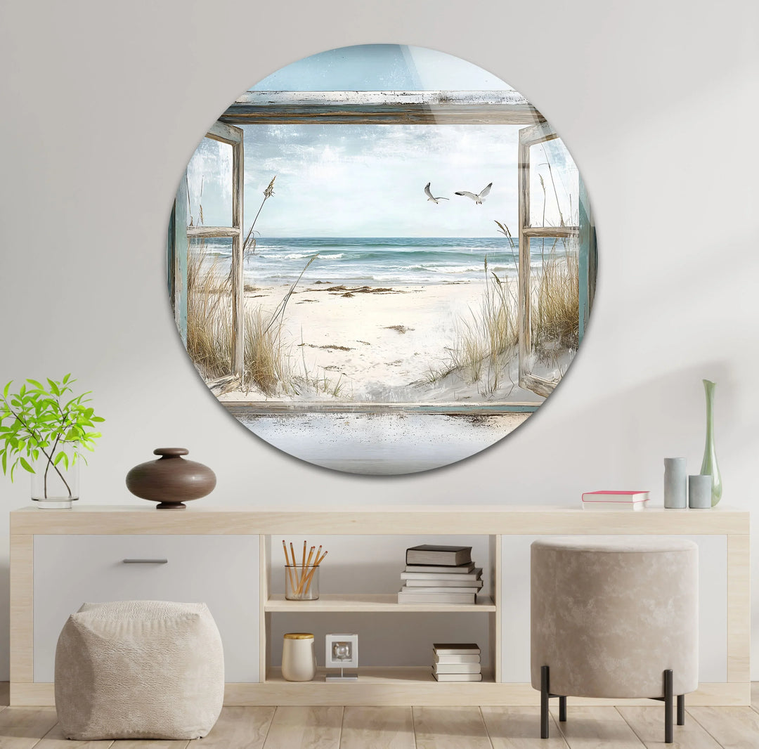 Immerse yourself in the peaceful charm of the coast with the Seaside Freedom Glass Wall Art. This breathtaking design captures the moment seagulls soar over gentle waves, as seen through a rustic, weathered window frame. The faded turquoise wood, windswept grasses, and soft sands evoke nostalgia, openness, and seaside serenity—ideal for adding coastal soul to any interior.