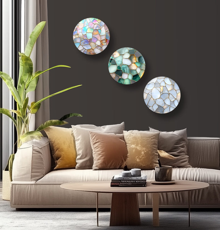 Bring tranquility and elegance to your space with the Serene Glow – Ocean Pebble Mosaic Round Glass Wall Art Set. Featuring three stunning glass panels that mimic the soft fluidity of sea-polished stones, this collection captures the essence of natural calm and refined artistry. The gentle hues of turquoise, ivory, and iridescent pastels create a soothing visual flow that brightens and balances modern interiors.
