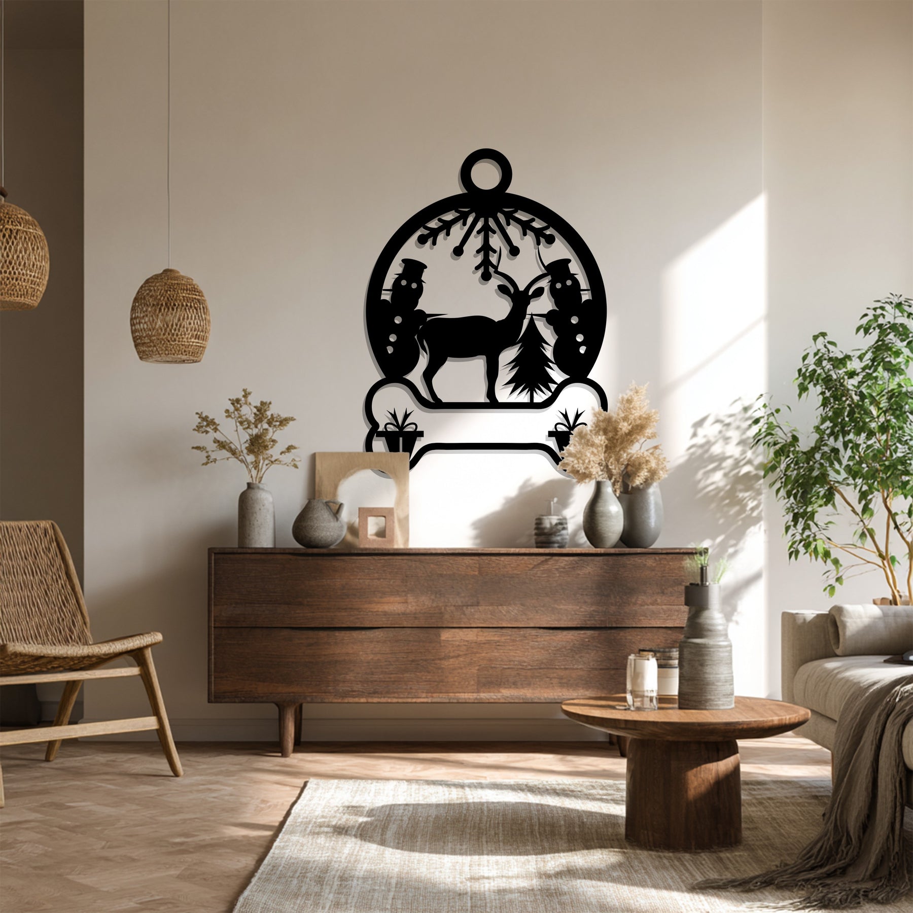 Embrace the spirit of winter with Snowland Serenity Metal Wall Art. This delightful piece showcases a serene reindeer surrounded by cheerful snowmen, festive gift boxes, and a snowflake crown — creating the perfect Christmas atmosphere. The intricate cutouts and circular ornament frame make it a beautiful accent for any holiday interior.