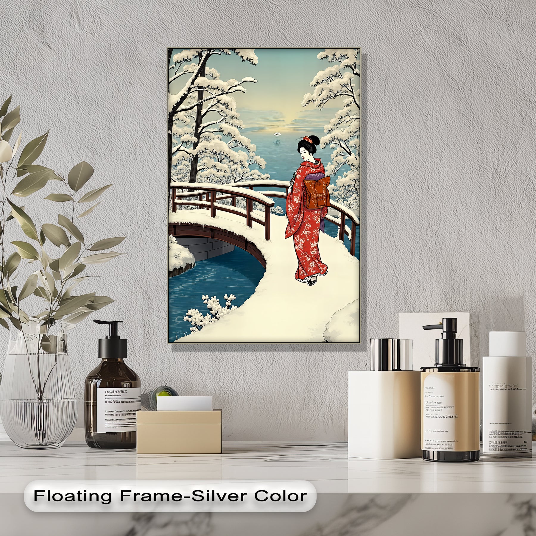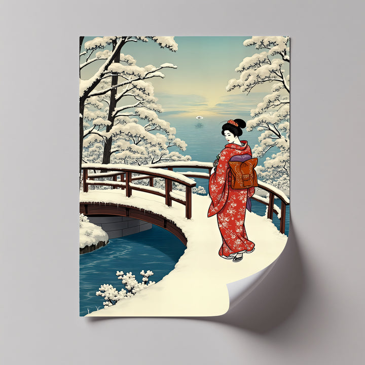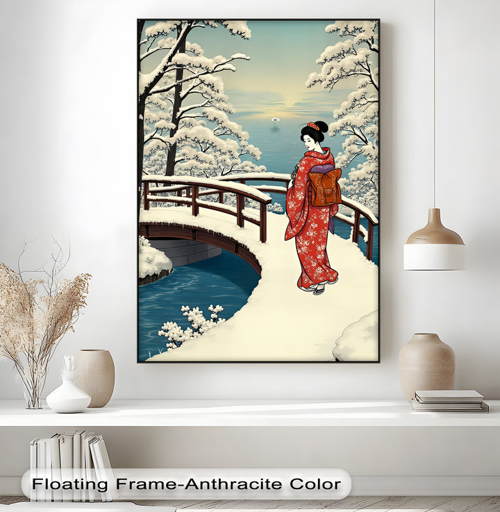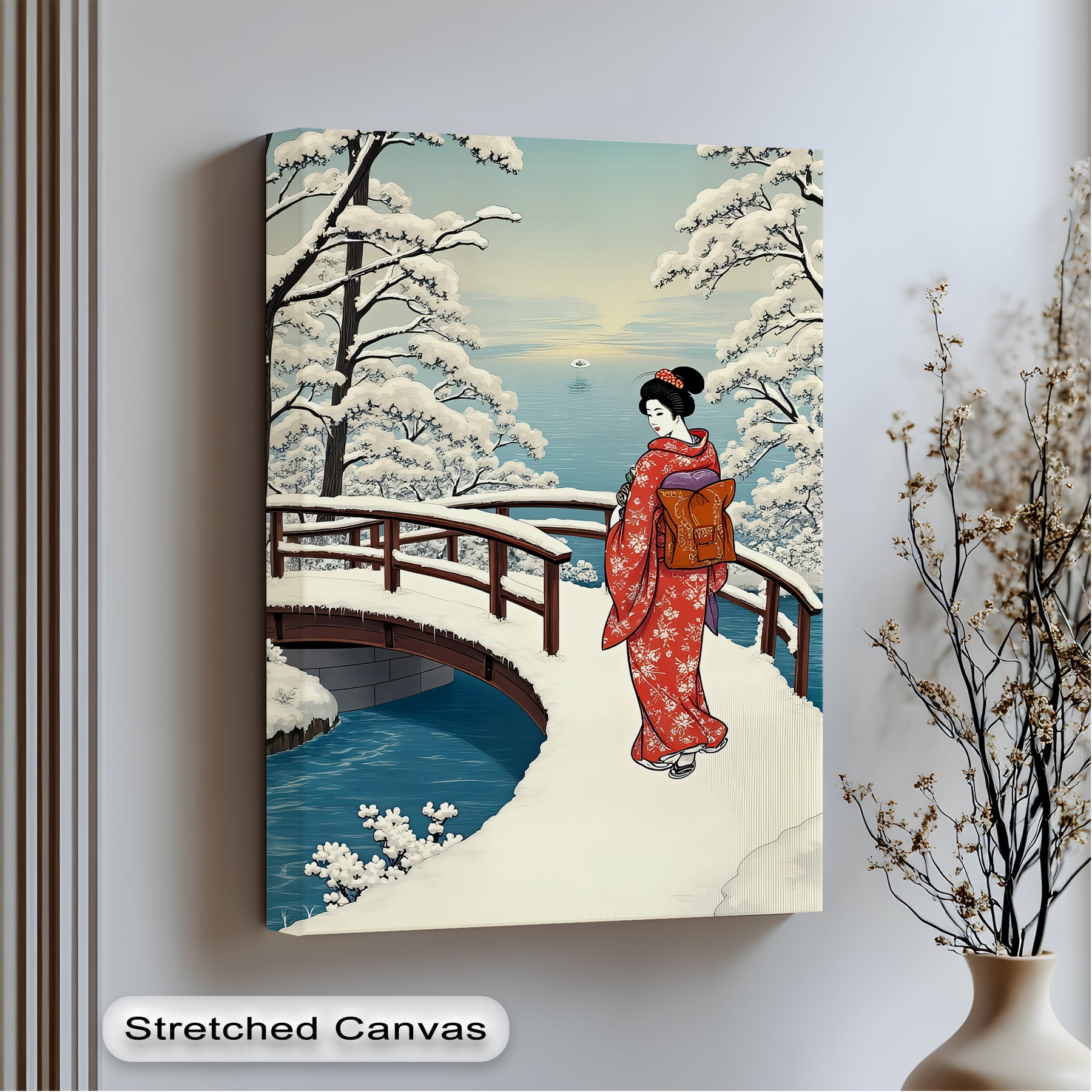 Bring timeless elegance to your walls with Snowy Bridge Serenity, a captivating Japanese canvas print featuring a graceful geisha crossing a snow-covered wooden bridge. Wrapped in a flowing red kimono with intricate floral patterns, she stands against a backdrop of serene waters and snow-laden pine trees. The soft glow of the horizon adds warmth to the tranquil winter landscape, evoking peace, solitude, and the beauty of traditional Japanese ukiyo-e art.